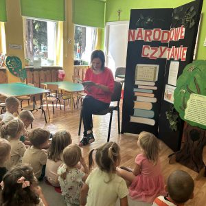 Narodowe Czytanie to coroczna akcja wspólnego czytania, której celem jest propagowanie polskiej literatury oraz wzmacnianie tożsamości narodowej. Akcja została zainicjowana w 2012 roku przez Prezydenta RP Bronisława Komorowskiego, później prezydenta RP Andrzeja Dudy wraz z Małżonką Agatą Kornhauser–Dudą do dziś czytają oni fragmenty wybranych dzieł literatury narodowej. Do akcji przyłączyć się mogą wszystkie chętne osoby, placówki edukacyjne i kulturalne oraz instytucje publiczne i społeczne w kraju i za granicą. Nasze przedszkole co roku bierze aktywny udział w akcji od 2012r. gdzie wspólną lekturą był ,,Pan Tadeusz” Adama Mickiewicza,