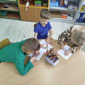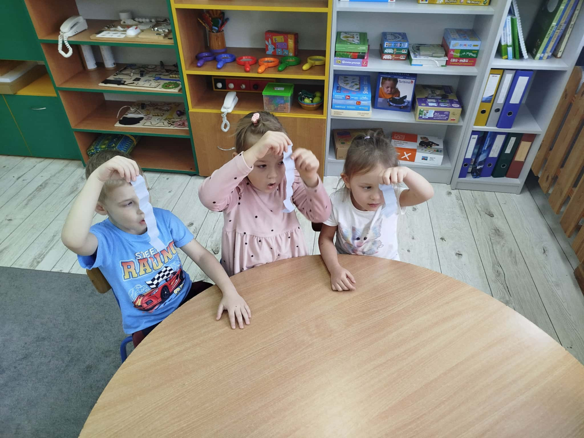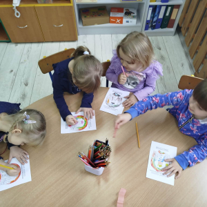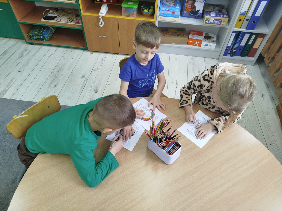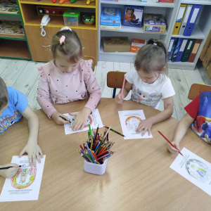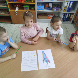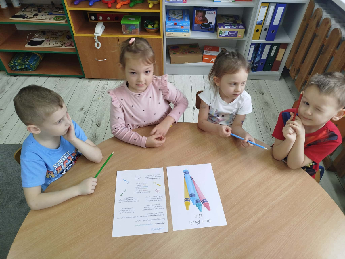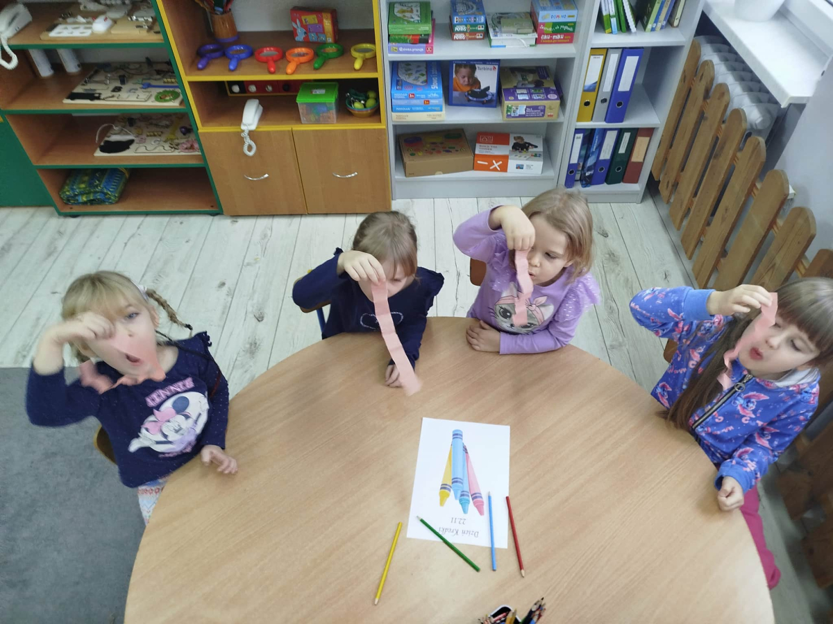 Dzieci wysłuchały ciekawostek o kredkach. Odbyły się ćwiczenia dźwiękonaśladowcze, oddechowe oraz usprawniające aparat mowy. Przedszkolaki brały udział w zabawie teatralnej. Na zakończenie pokolorowały obrazek.