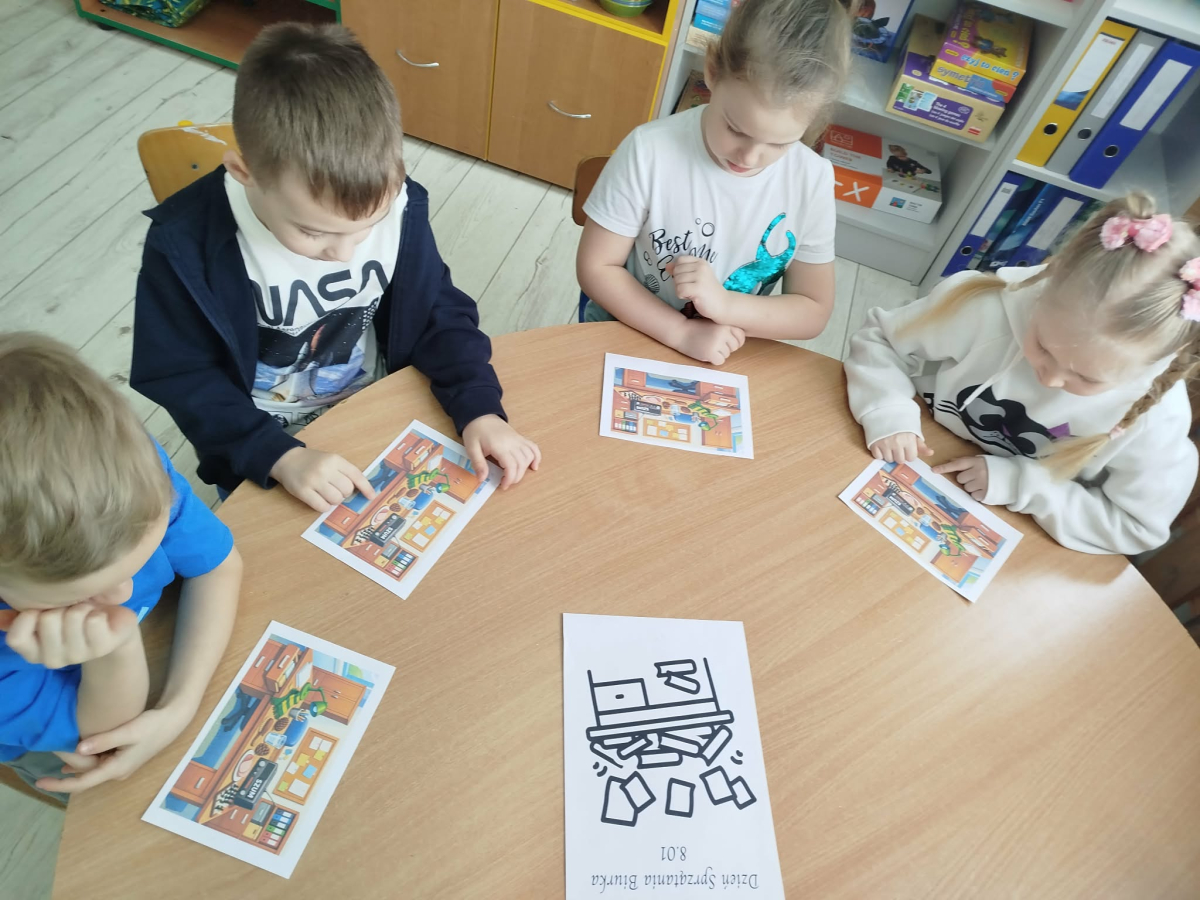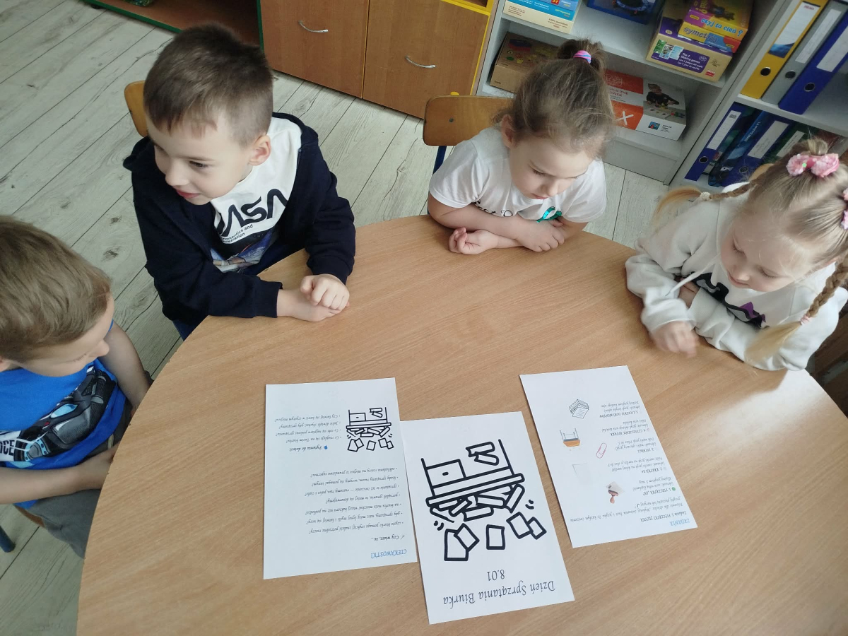 W Naszym Przedszkolu obchodziliśmy w ramach innowacji „Logopedyczny Kalendarz Świąt Nietypowych” - „Dzień sprzątania biurka”. Przedszkolaki były zachęcane do swobodnej wypowiedzi o biurkach, o tym jak o nie dbają oraz jak powinno się je sprzątać. Wysłuchały opowiadania logopedycznego pt. „Bałagan w biurze Pani Szafirkowej”. Na obrazku szukały i nazywały przedmiotów z głoską „sz”.