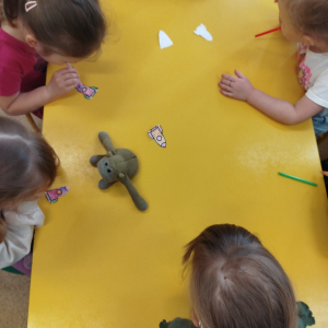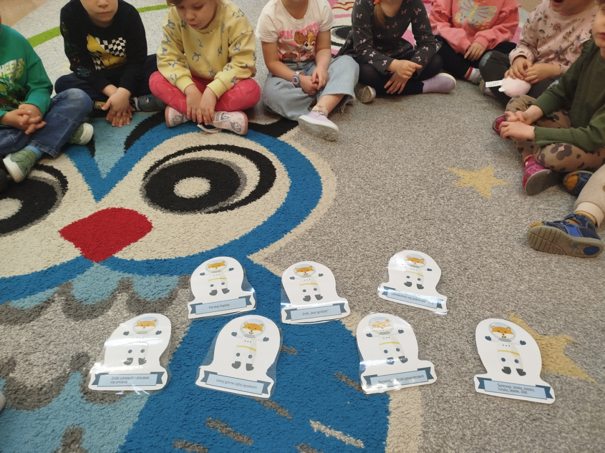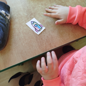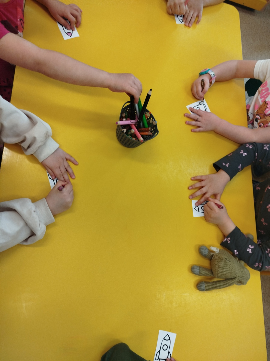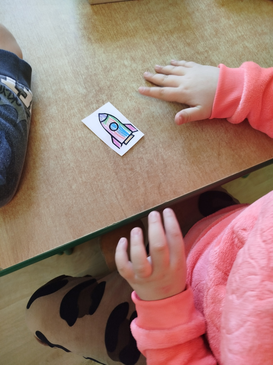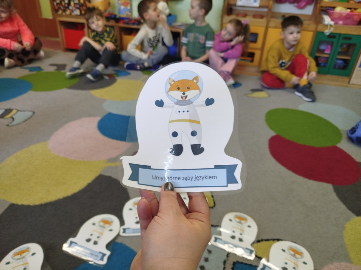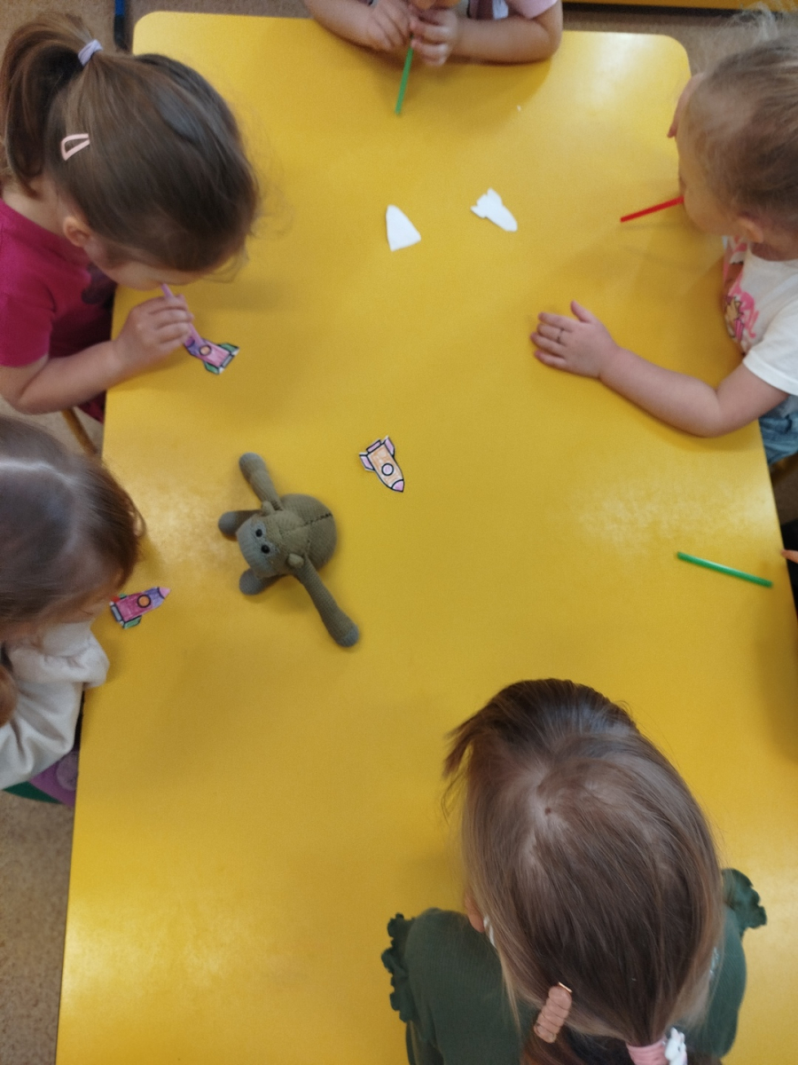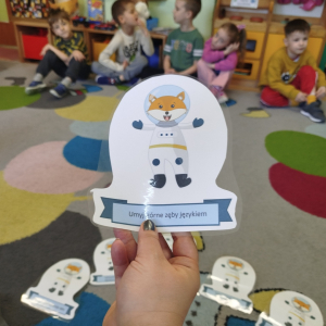Podczas zajęć grupowych „Logopedia w ruchu” dzieci usprawniały narządy artykulacyjne z obrazkami przedstawiającymi lisa - astronautę. Zwiększaliśmy zasób słownictwa o kosmosie. Przedszkolaki kolorowały rakietę, z którą ćwiczyliśmy oddech.