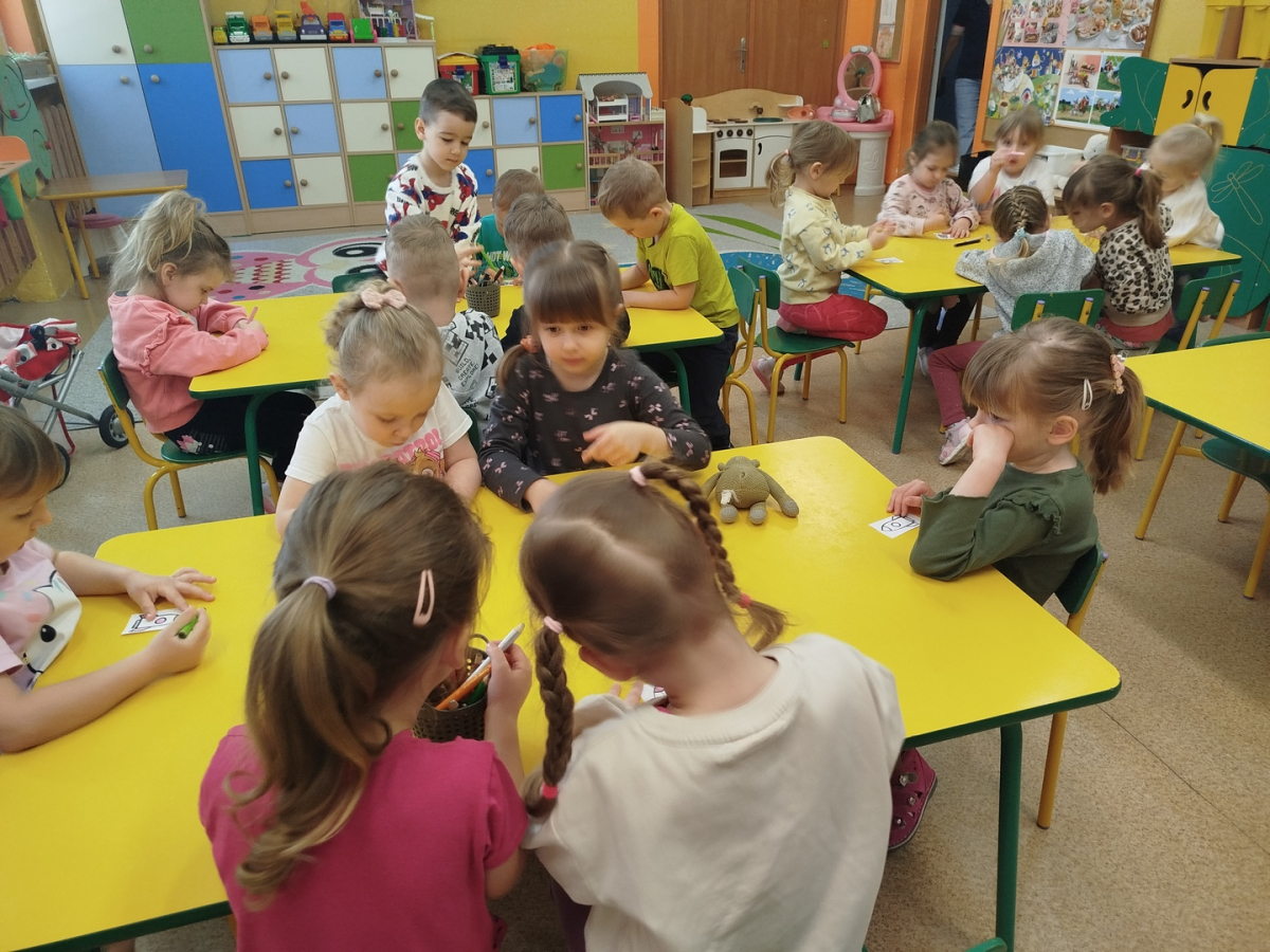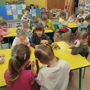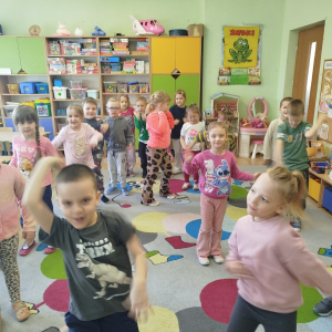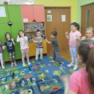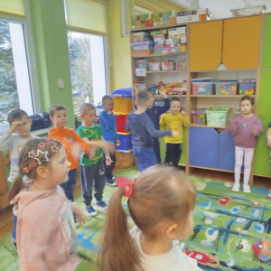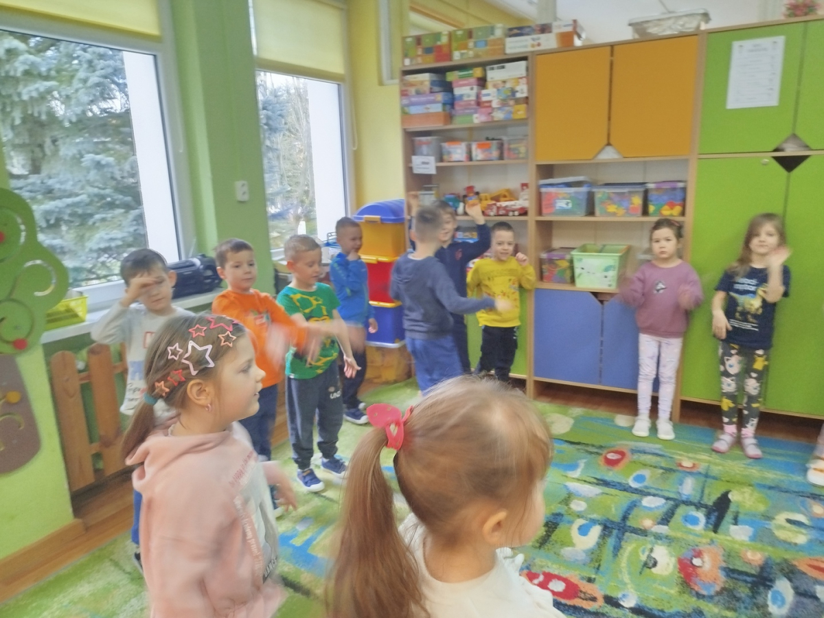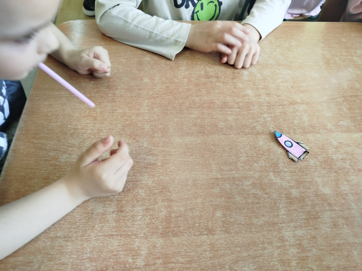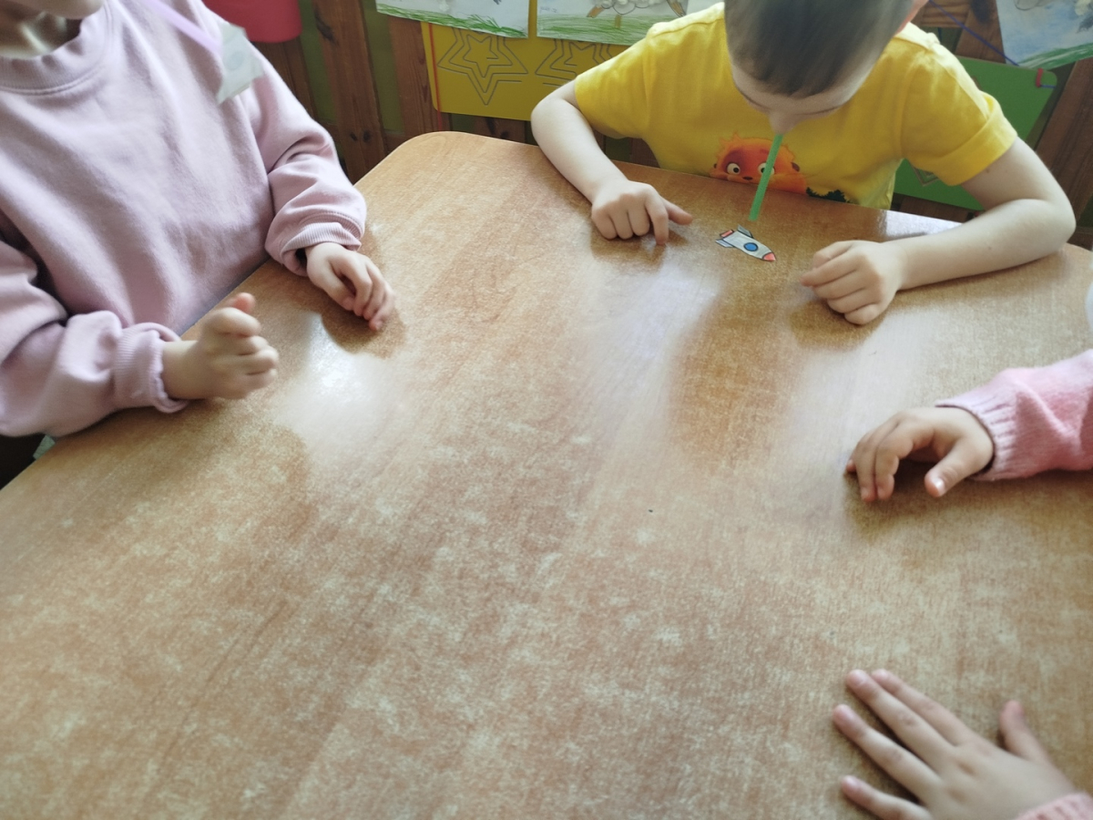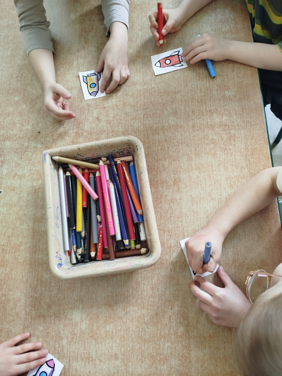 Podczas zajęć grupowych „Logopedia w ruchu” dzieci usprawniały narządy artykulacyjne z obrazkami przedstawiającymi lisa - astronautę. Zwiększaliśmy zasób słownictwa o kosmosie. Przedszkolaki kolorowały rakietę, z którą ćwiczyliśmy oddech.