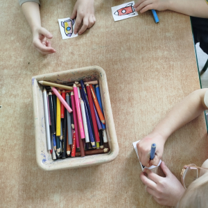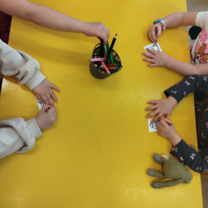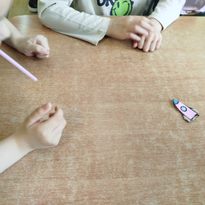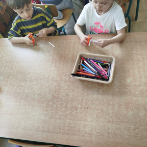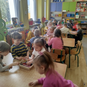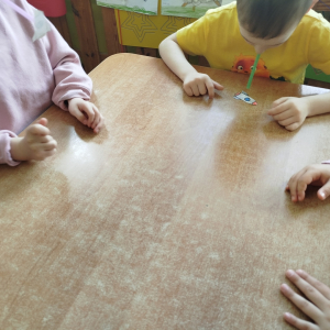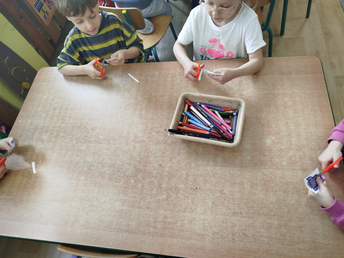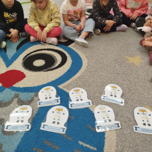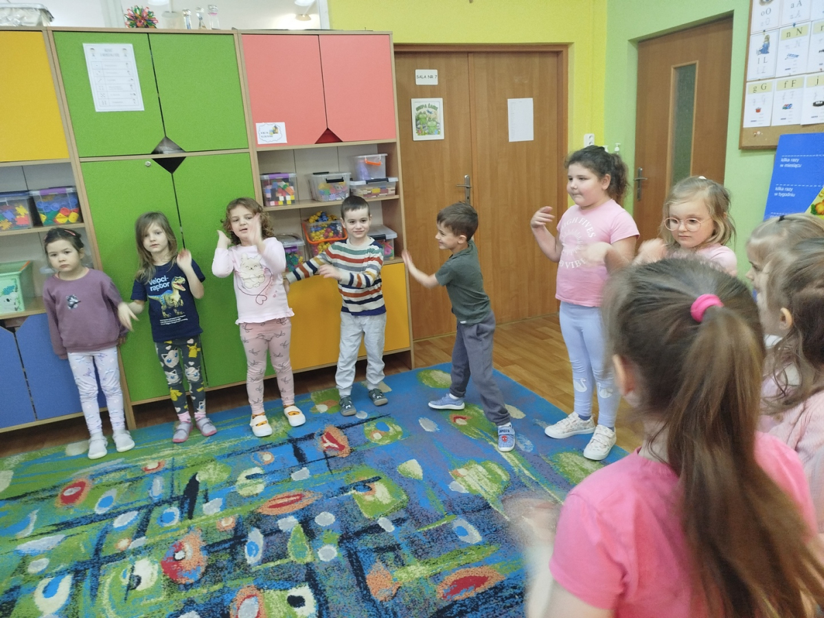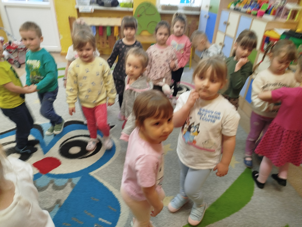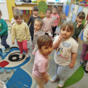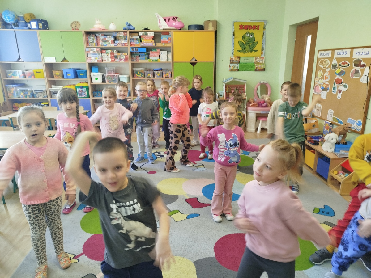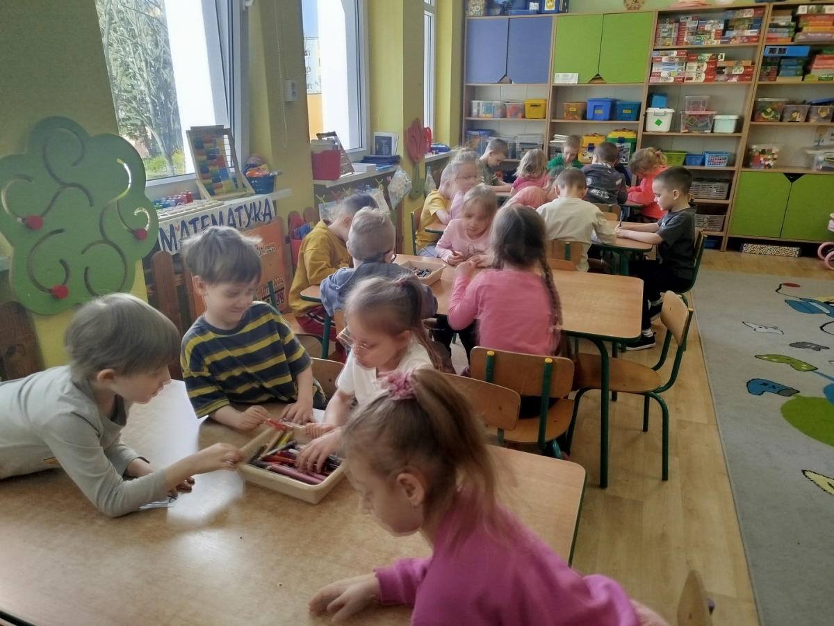 Podczas zajęć grupowych „Logopedia w ruchu” dzieci usprawniały narządy artykulacyjne z obrazkami przedstawiającymi lisa - astronautę. Zwiększaliśmy zasób słownictwa o kosmosie. Przedszkolaki kolorowały rakietę, z którą ćwiczyliśmy oddech.