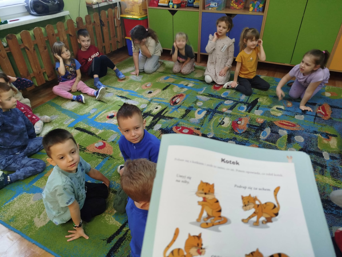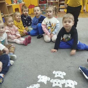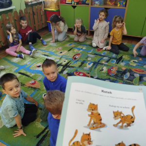 W czasie zajęć „Logopedia w ruchu” przywitaliśmy się piosenką „Logopedia fajna jest”. Przedszkolaki usprawniały narządy artykulacyjne, utrwalały prawidłowy tor oddechowy. Odbyła się zabawa z elementami ruchu pt. „Kotki”. Na zakończenie była zabawa wyciszająca.