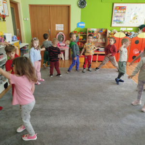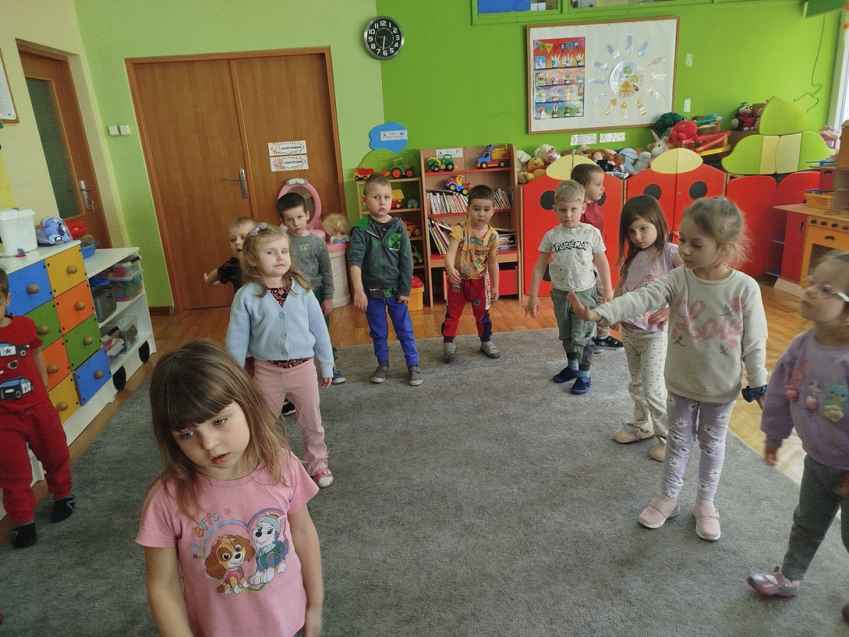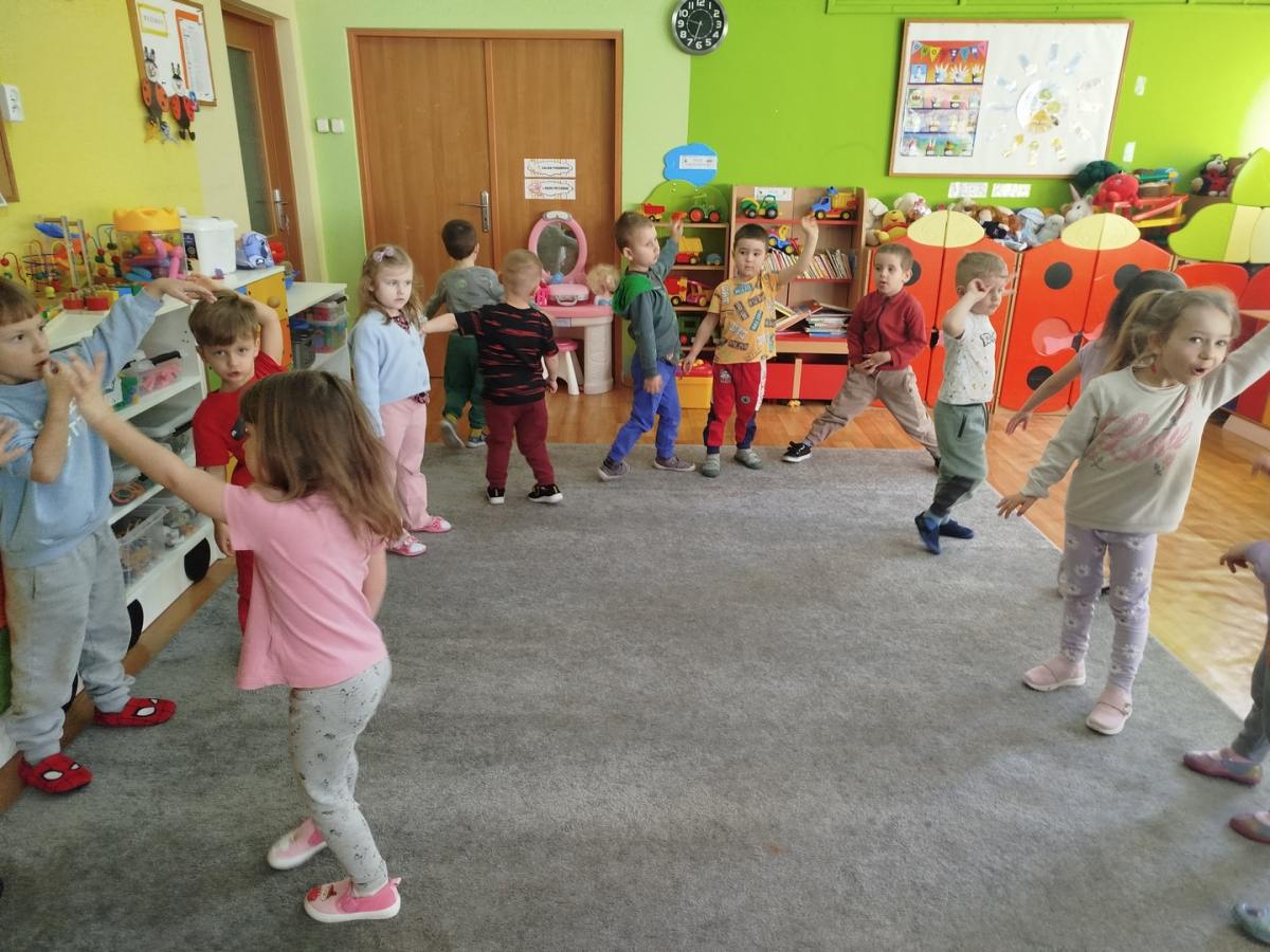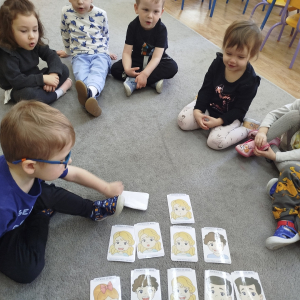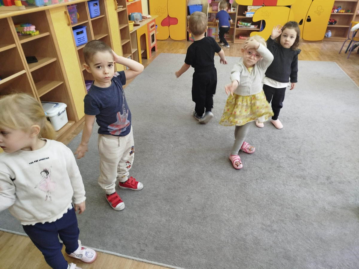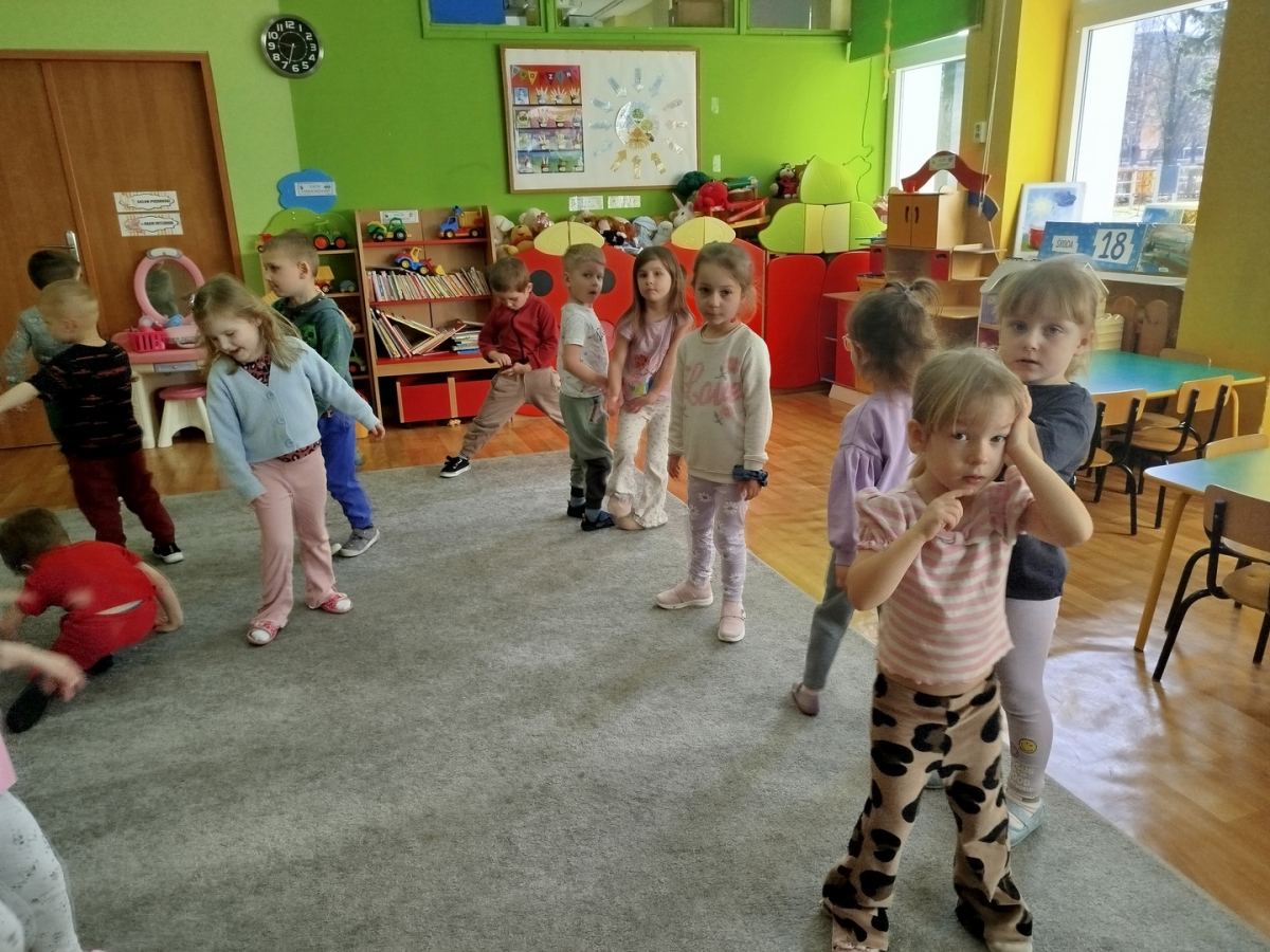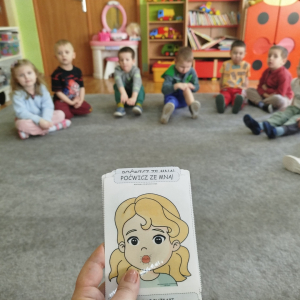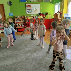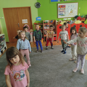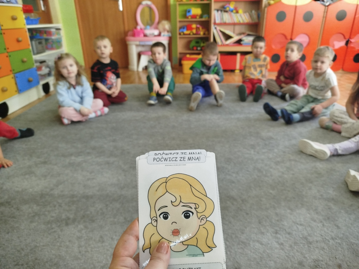 W czasie zajęć „Logopedia w ruchu” przywitaliśmy się piosenką „Logopedia fajna jest”. Przedszkolaki usprawniały narządy artykulacyjne z obrazkami dzieci, utrwalały prawidłowy tor oddechowy. Ćwiczyły prawidłową pozycję spoczynkową języka. Odbyła się zabawa orientacji przestrzennej mająca na celu rozpoznawanie lewej i prawej ręki.