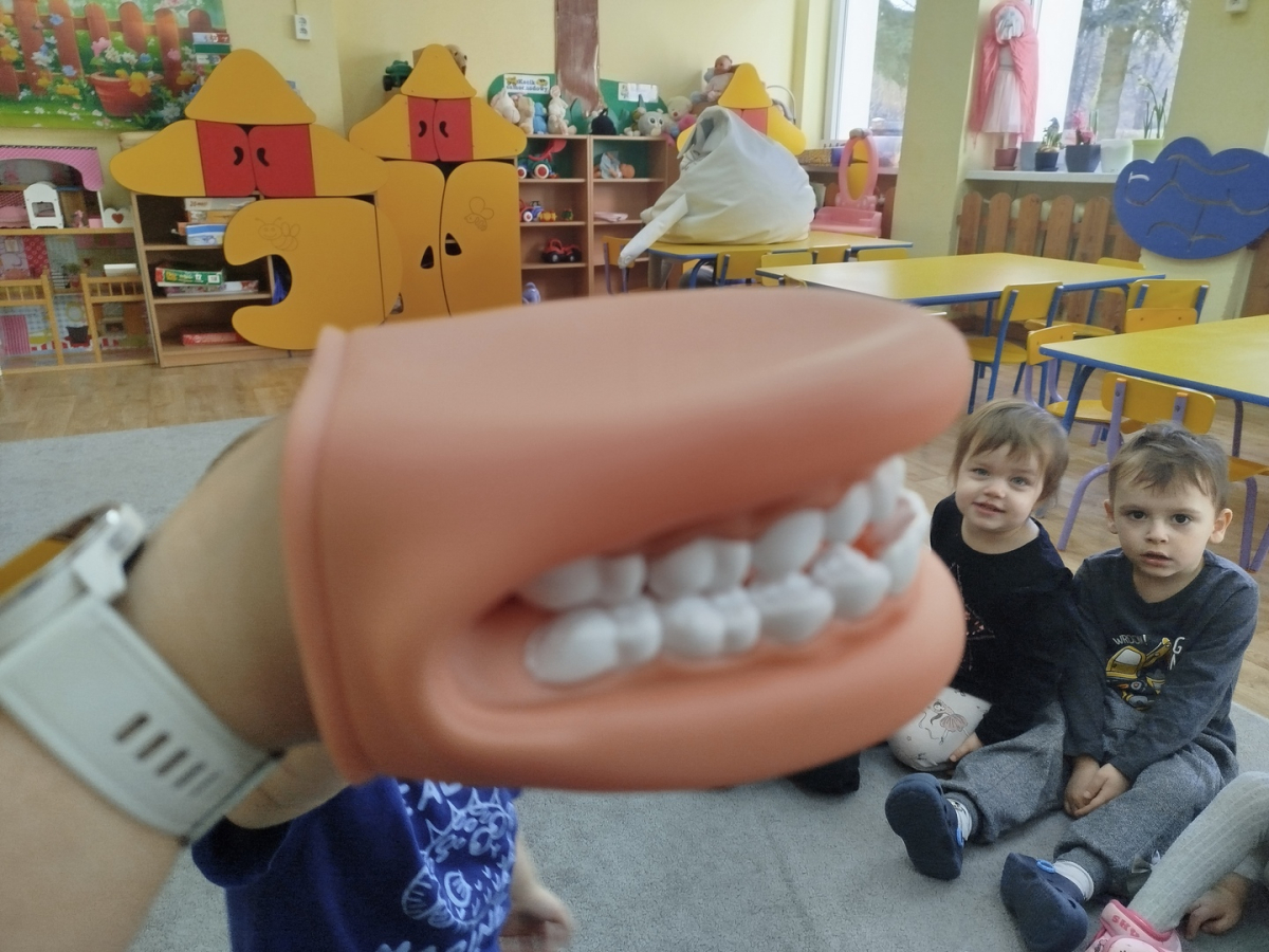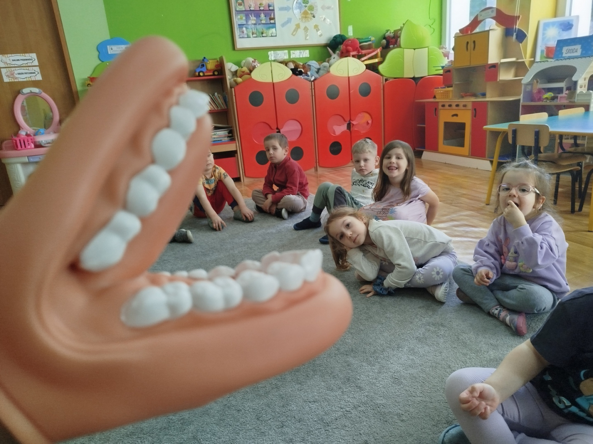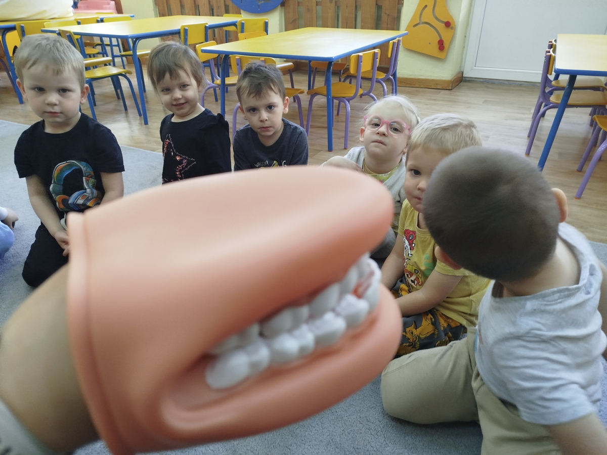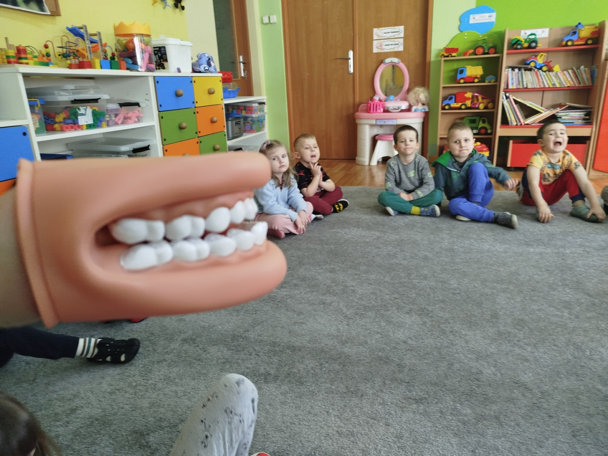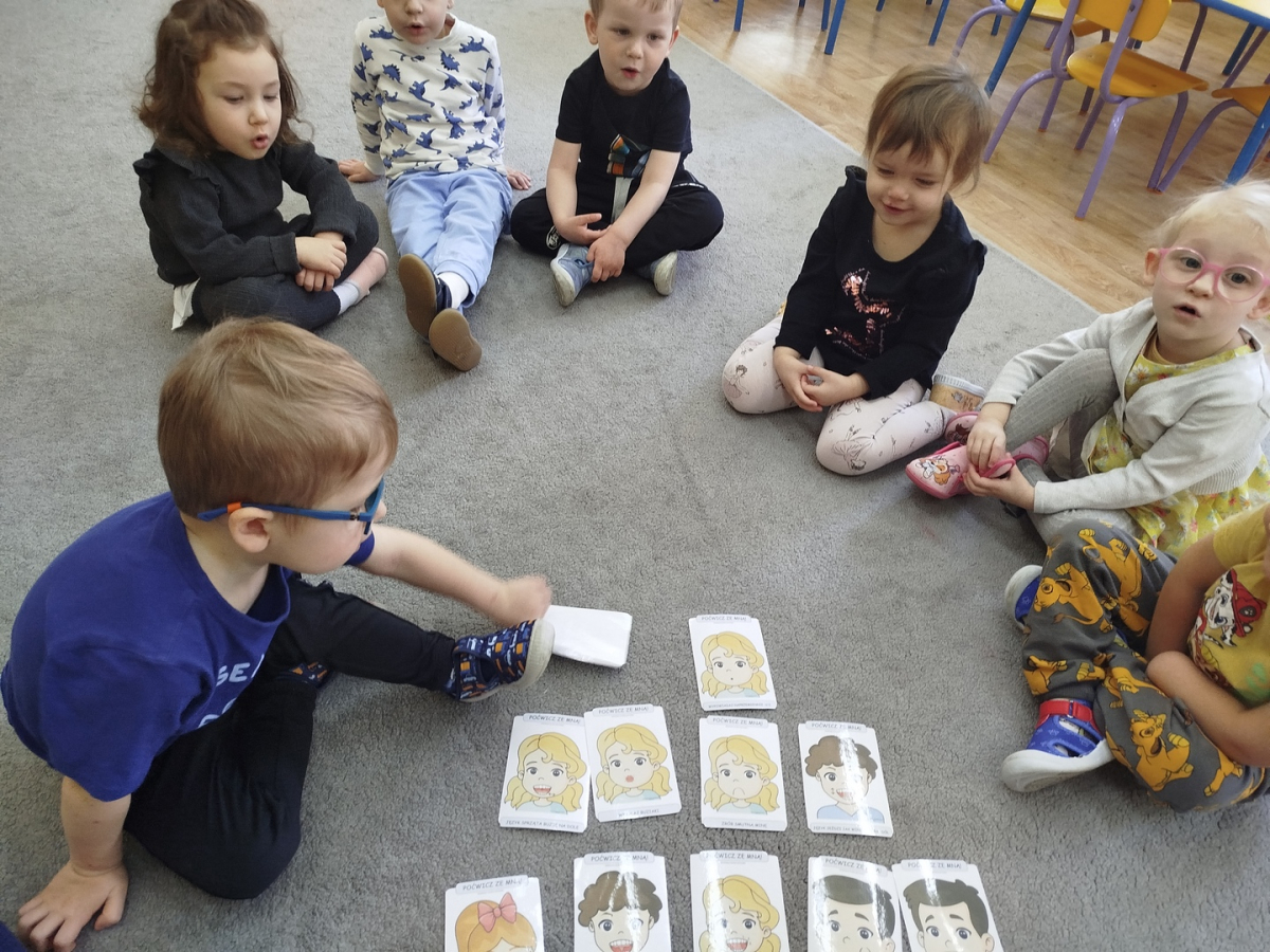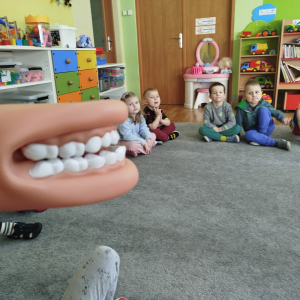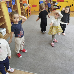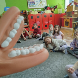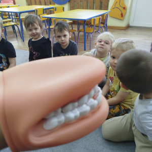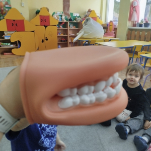 W czasie zajęć „Logopedia w ruchu” przywitaliśmy się piosenką „Logopedia fajna jest”. Przedszkolaki usprawniały narządy artykulacyjne z obrazkami dzieci, utrwalały prawidłowy tor oddechowy. Ćwiczyły prawidłową pozycję spoczynkową języka. Odbyła się zabawa orientacji przestrzennej mająca na celu rozpoznawanie lewej i prawej ręki.