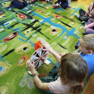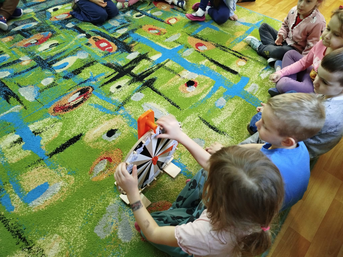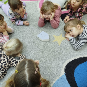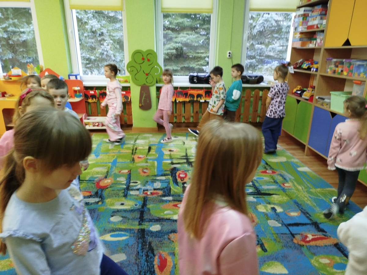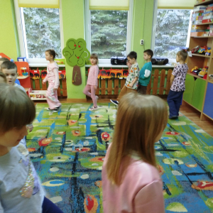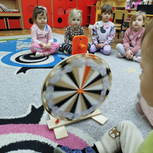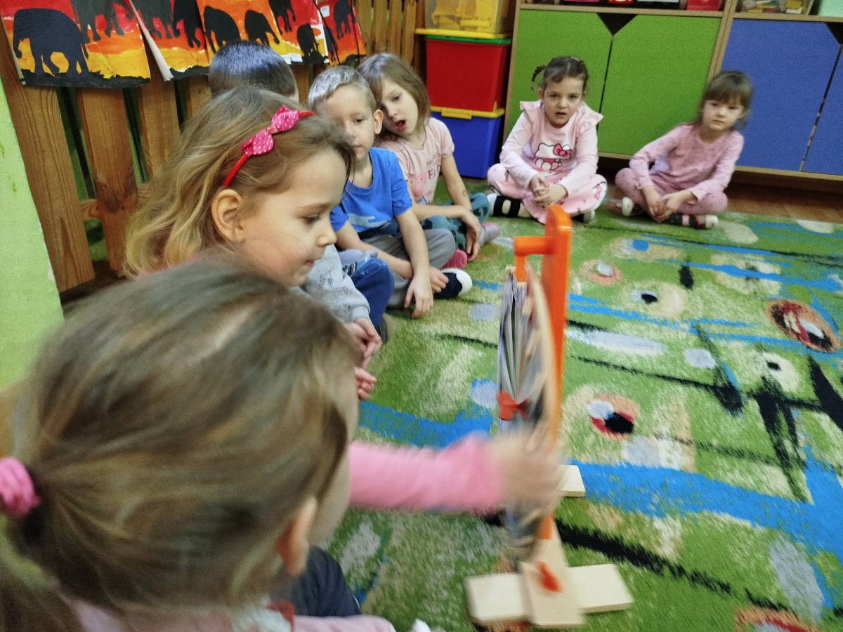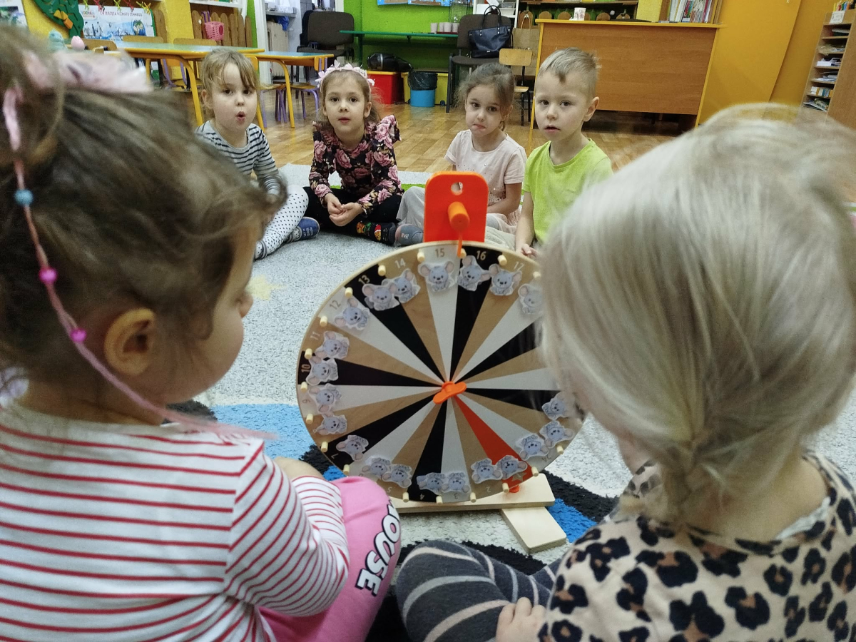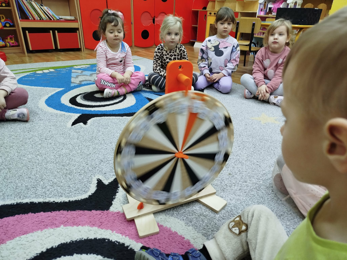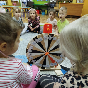 W czasie zajęć „Logopedia w ruchu” przywitaliśmy się piosenką „Logopedia fajna jest”. Przedszkolaki usprawniały narządy artykulacyjne z kołem fortuny, utrwalały prawidłowy tor oddechowy. Odbyła się zabawa z elementami ruchu. Na zakończenie dzieci wyciszyły się przy odgłosach ptaków.