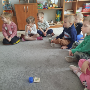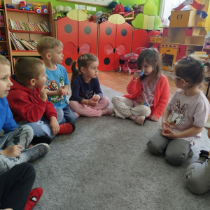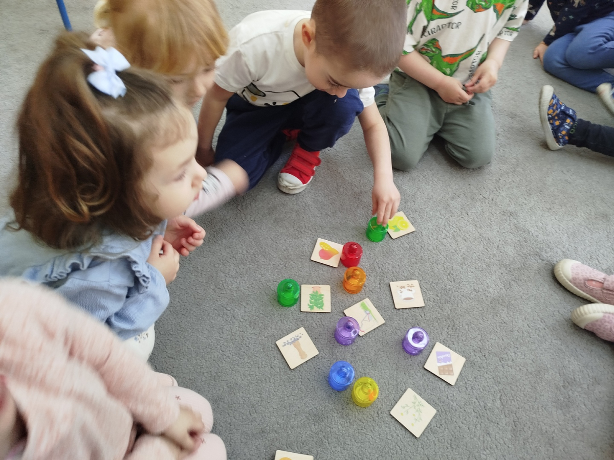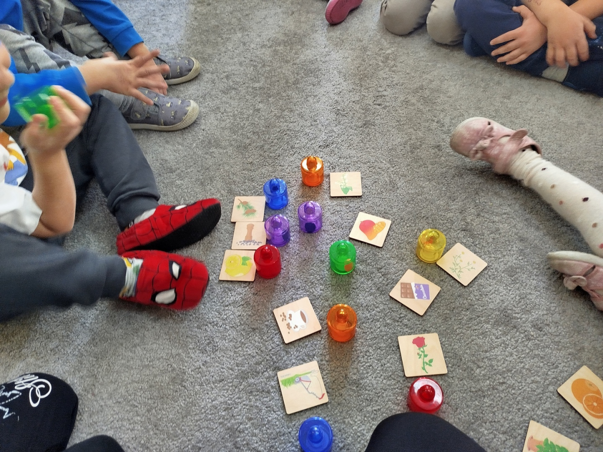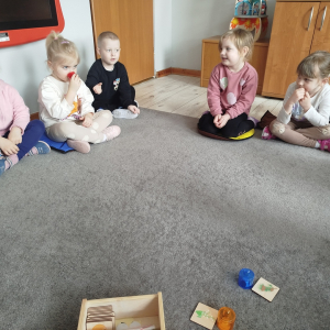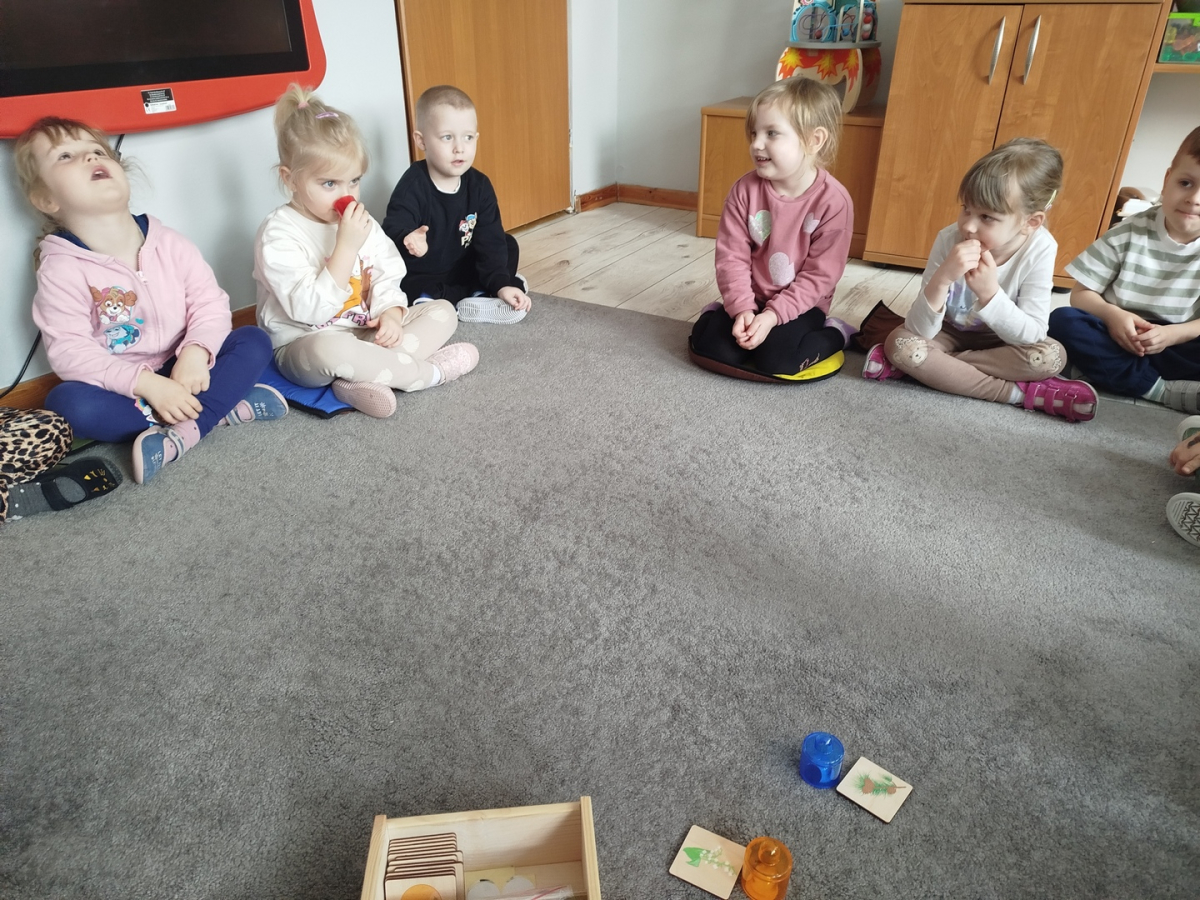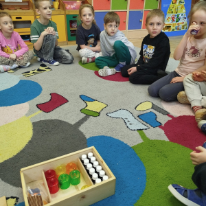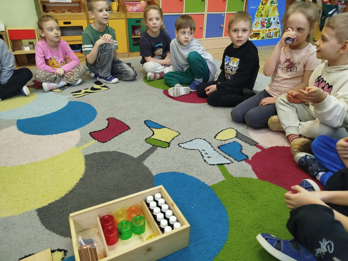 Nasze zajęcia rozpoczęły się wierszykiem o oddychaniu. Następnie odbyła się rozmowa „Do czego jest nam potrzebny nos?”. Po tej rozmowie pani Ania pokazała dzieciom tajemnicze pudełko – „Skrzynka zapachów”. W skrzynce znajdowały się słoiczki z różnymi zapachami i obrazki. Zadaniem dzieci było dobranie zapachu do obrazka.