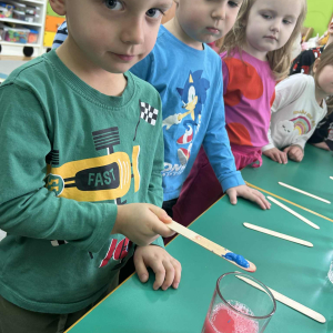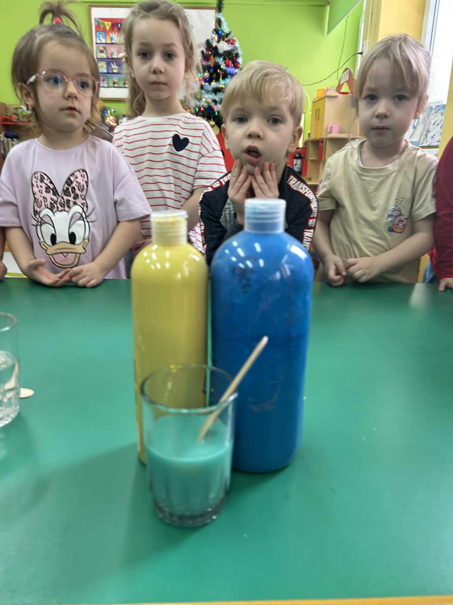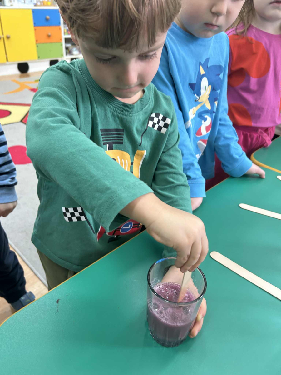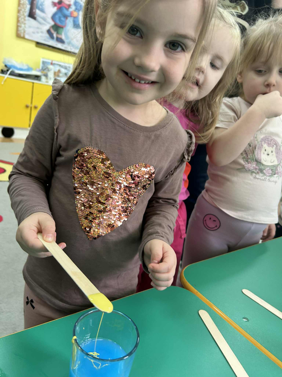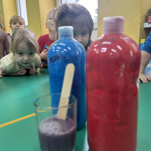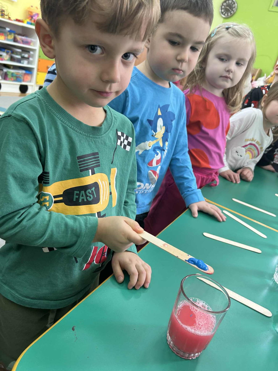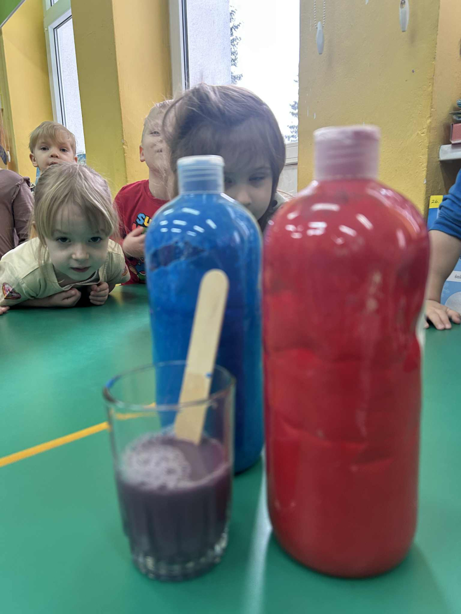 Dzieci samodzielnie mieszały wodę z farbą ,obserwując powstawanie nowych kolorów. Rozwijały i rozbudzały swoją ciekawość poznawczą oraz wprowadzały postawę myślenia przyczynowo - skutkowego. Eksperyment ten łączy naukę z bezpośrednim kontaktem z naturą i warunkami atmosferycznymi.