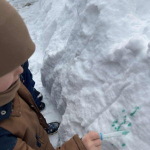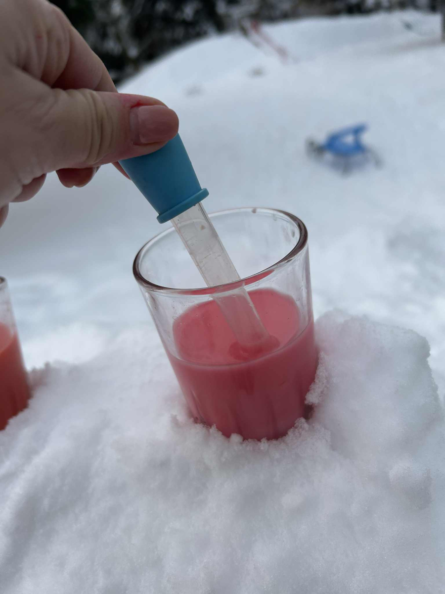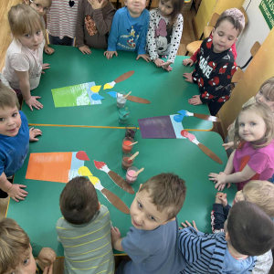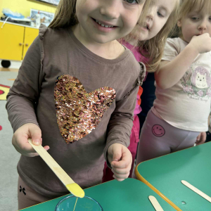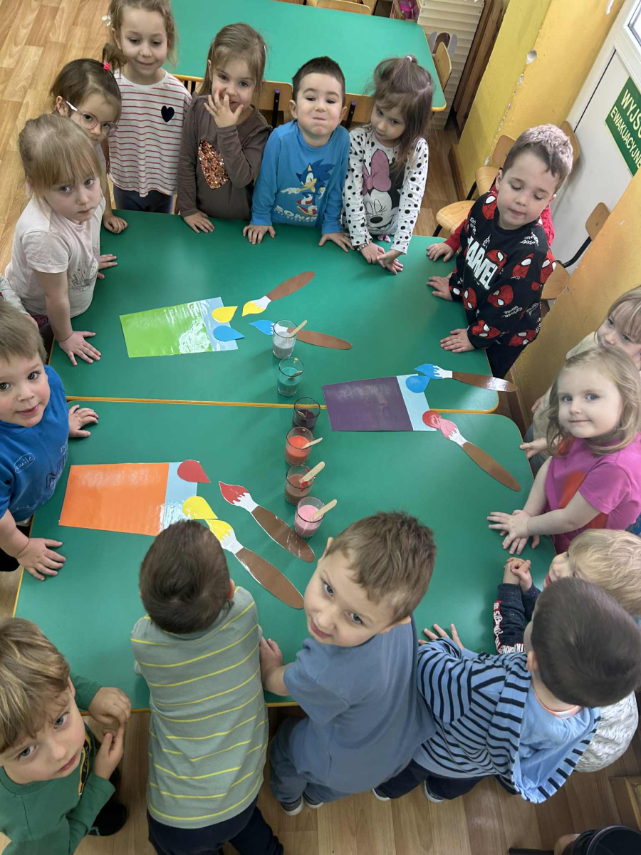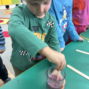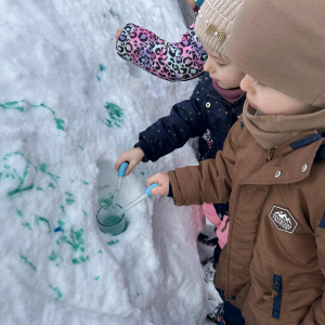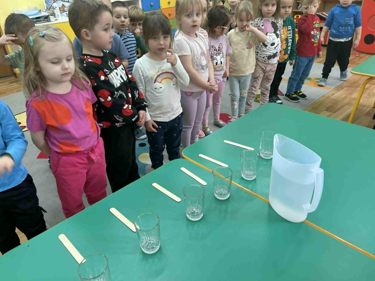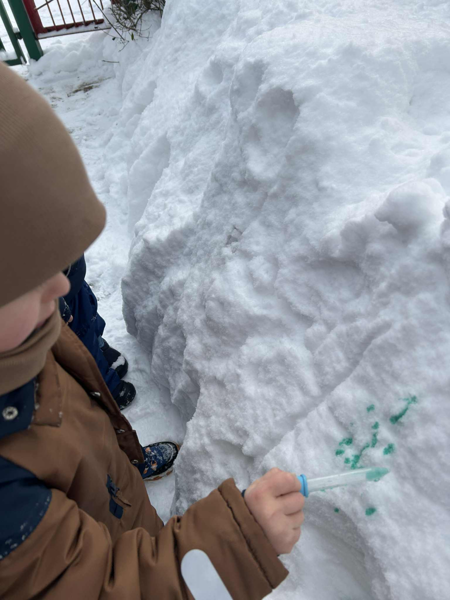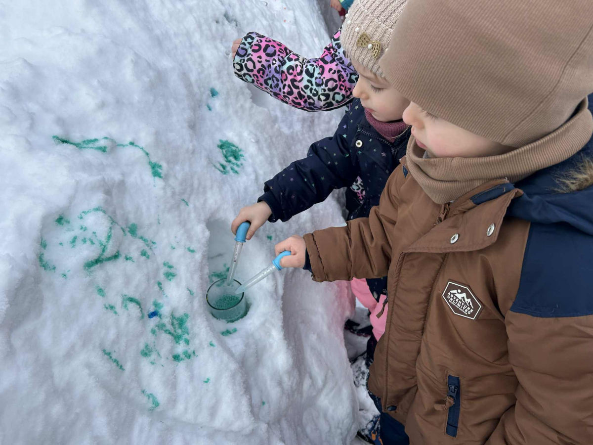 Dzieci samodzielnie mieszały wodę z farbą ,obserwując powstawanie nowych kolorów. Rozwijały i rozbudzały swoją ciekawość poznawczą oraz wprowadzały postawę myślenia przyczynowo - skutkowego. Eksperyment ten łączy naukę z bezpośrednim kontaktem z naturą i warunkami atmosferycznymi.