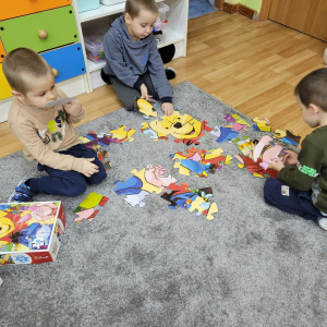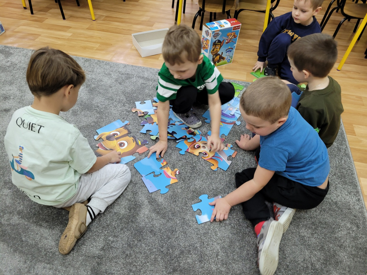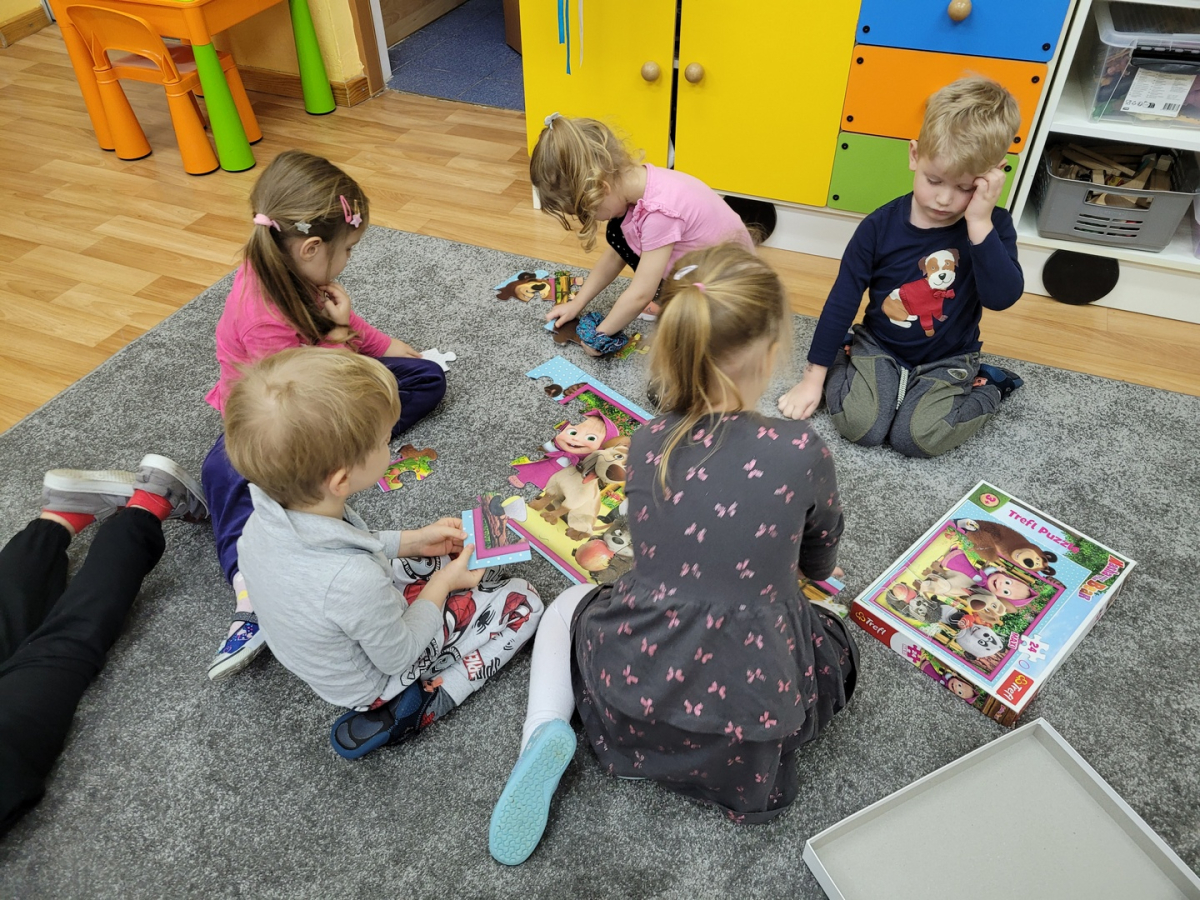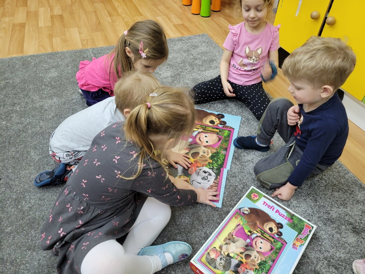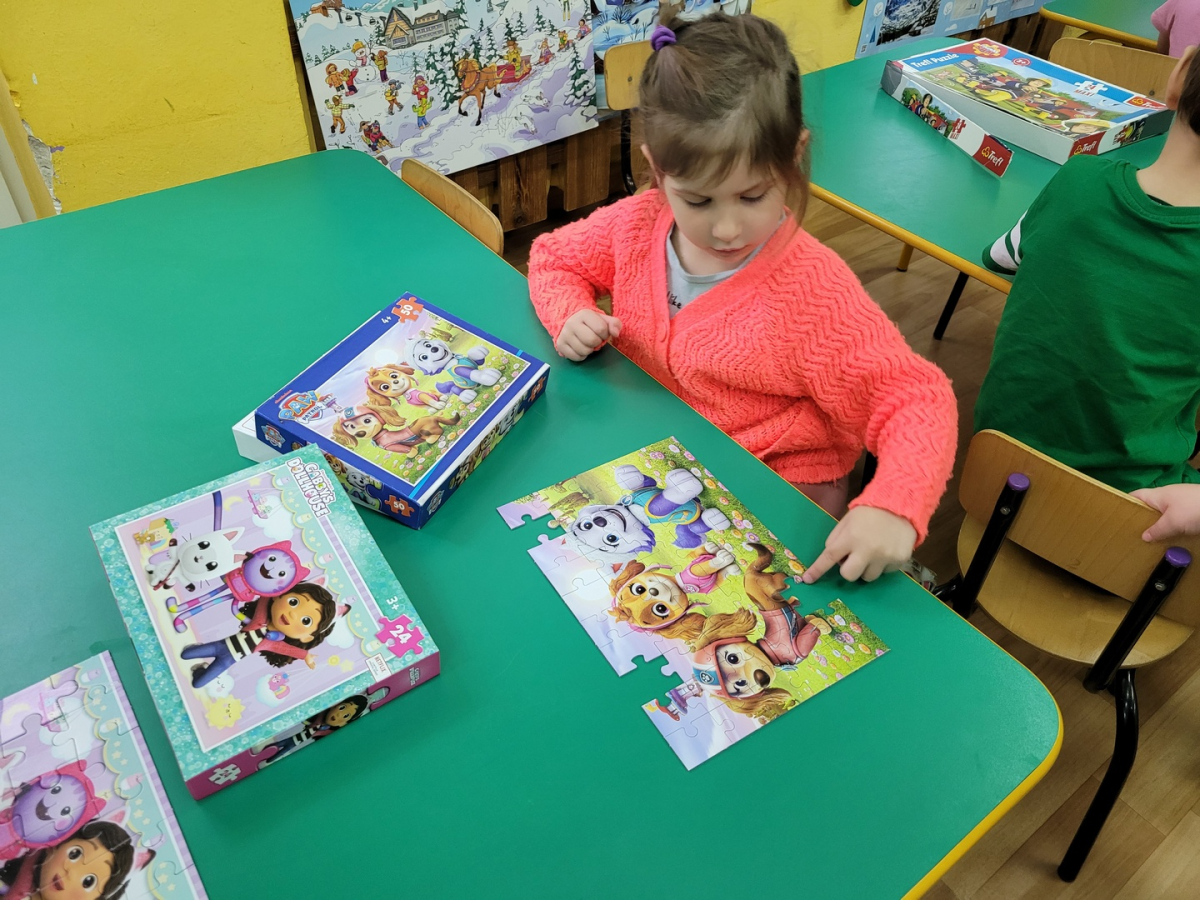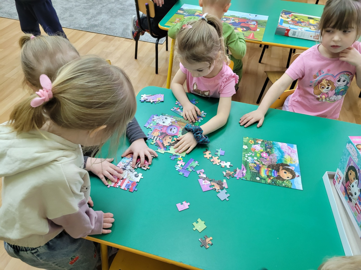 Zabawa puzzlami sprawia, że dziecko rozwija tak zwaną zdolność analizy i syntezy wzrokowej, czyli rozkładania całości na poszczególne elementy i ponownego składania ich w całość. Ponadto stymuluje rozwój mózgu, ćwiczy spostrzegawczość, koncentrację i cierpliwość. Buduje wiarę we własne możliwości, trenuje pamięć i rozwija manualnie. Przedszkolaki w naszej grupie z dużym zaciekawieniem i zaangażowaniem układały puzzle i układanki. Powstałe obrazki wywołały na twarzach dzieci duży zachwyt, satysfakcję oraz towarzyszącą im radość z osiągniętego celu.