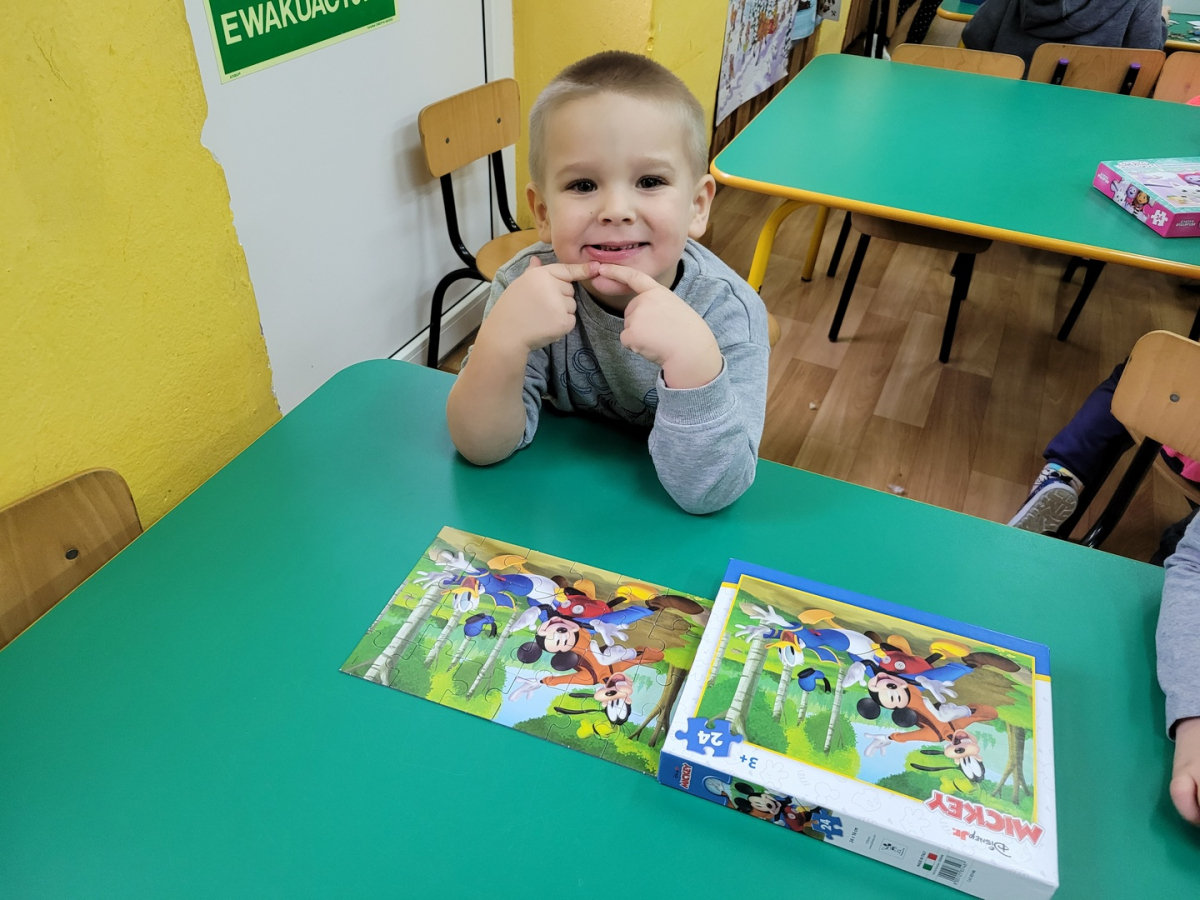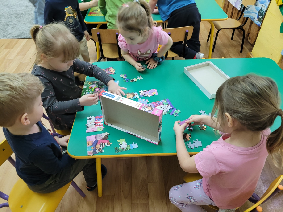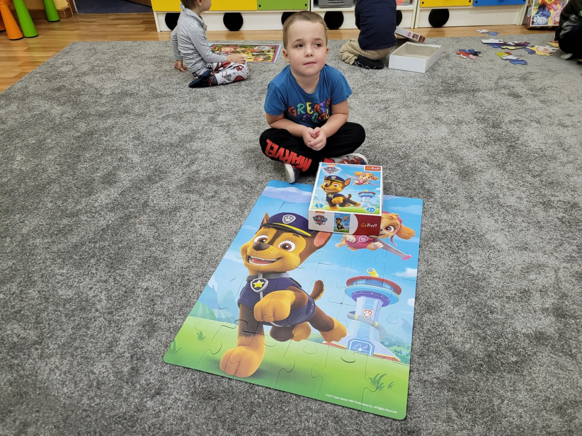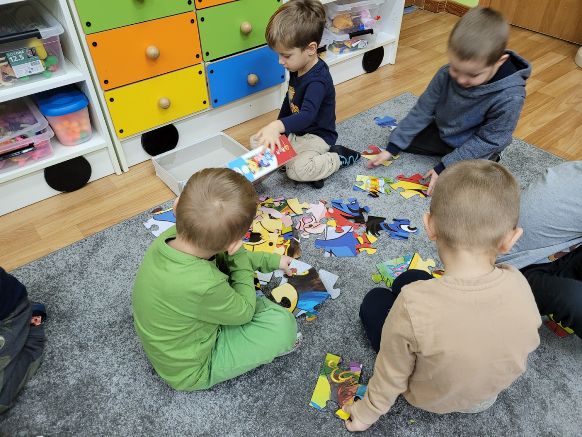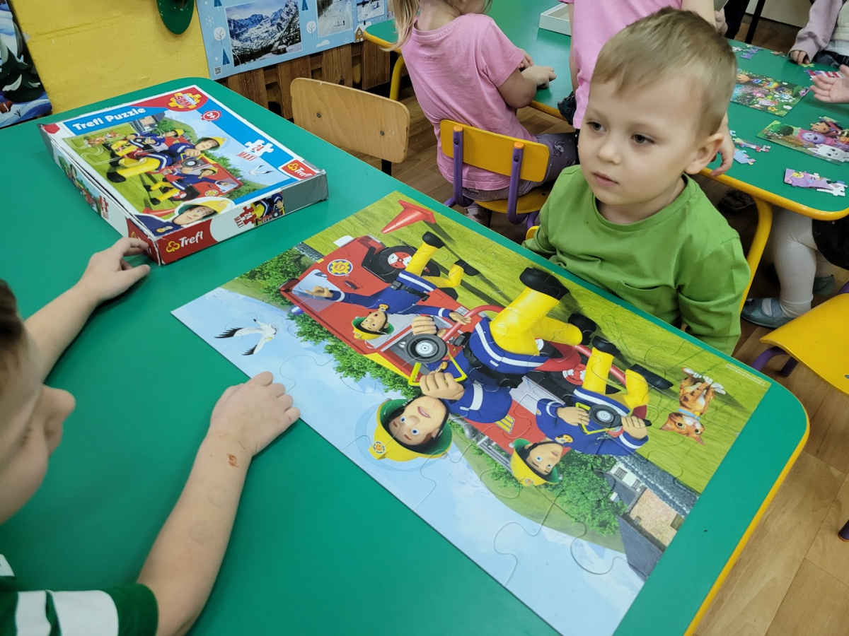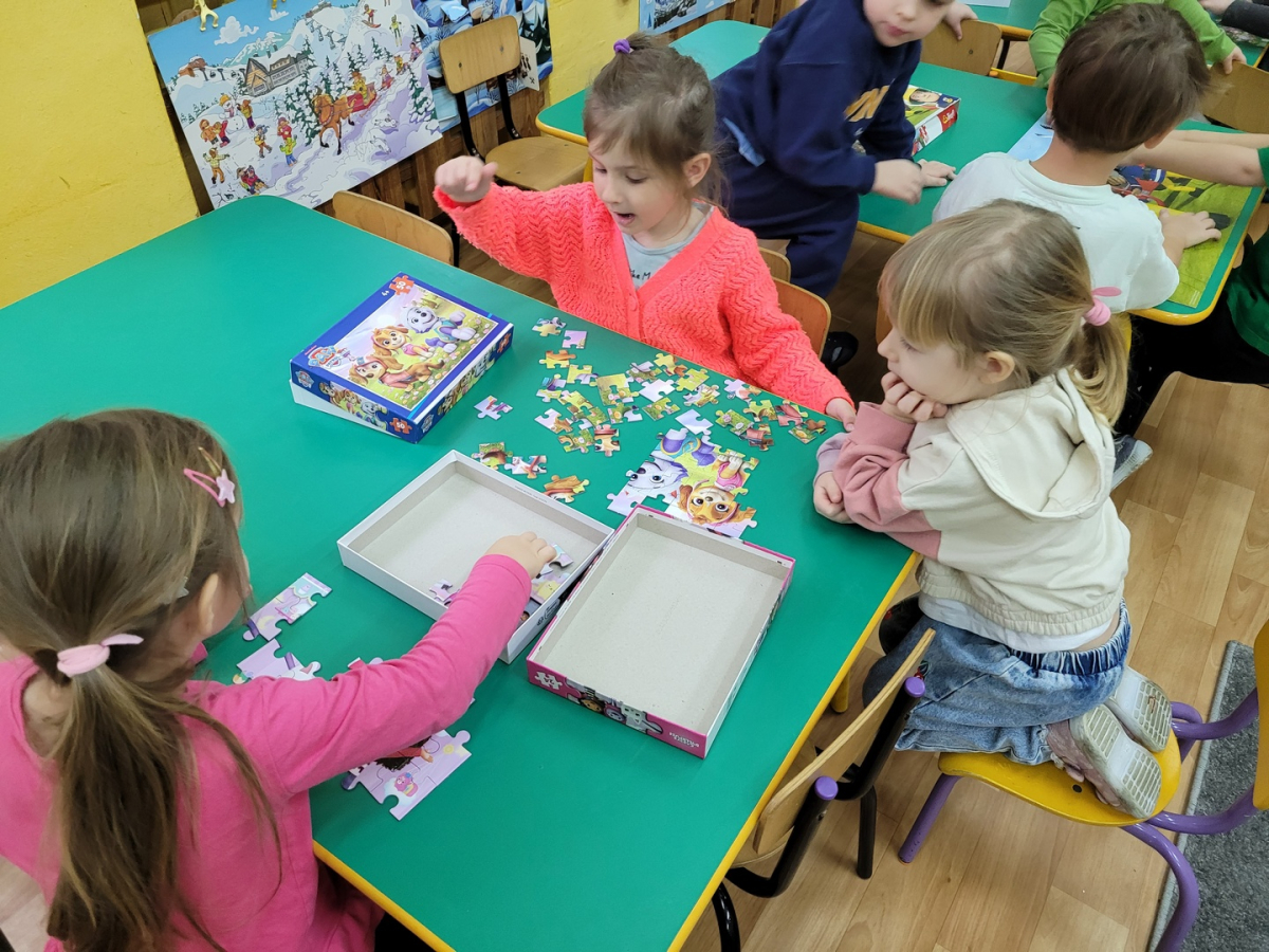 Zabawa puzzlami sprawia, że dziecko rozwija tak zwaną zdolność analizy i syntezy wzrokowej, czyli rozkładania całości na poszczególne elementy i ponownego składania ich w całość. Ponadto stymuluje rozwój mózgu, ćwiczy spostrzegawczość, koncentrację i cierpliwość. Buduje wiarę we własne możliwości, trenuje pamięć i rozwija manualnie. Przedszkolaki w naszej grupie z dużym zaciekawieniem i zaangażowaniem układały puzzle i układanki. Powstałe obrazki wywołały na twarzach dzieci duży zachwyt, satysfakcję oraz towarzyszącą im radość z osiągniętego celu.