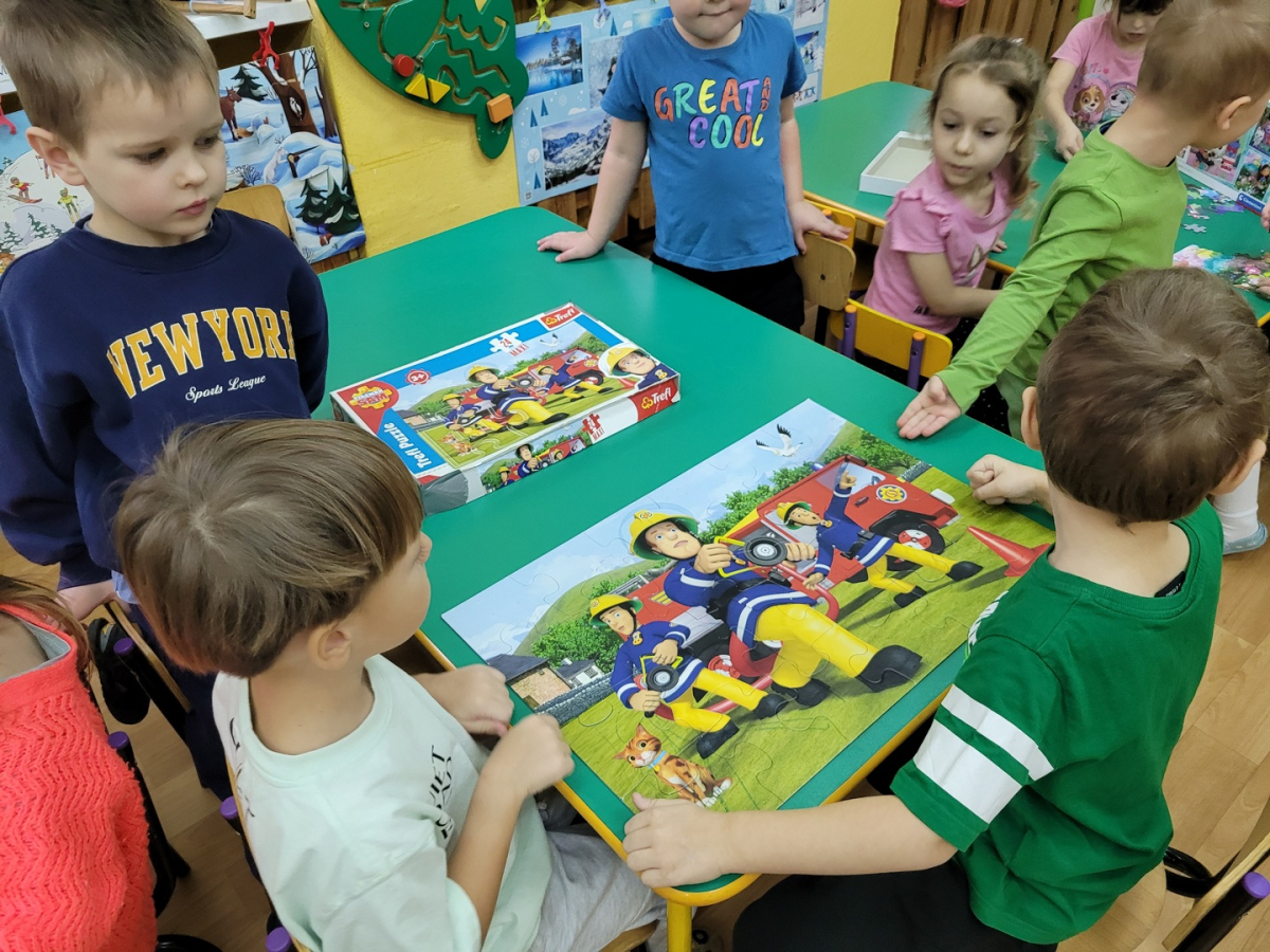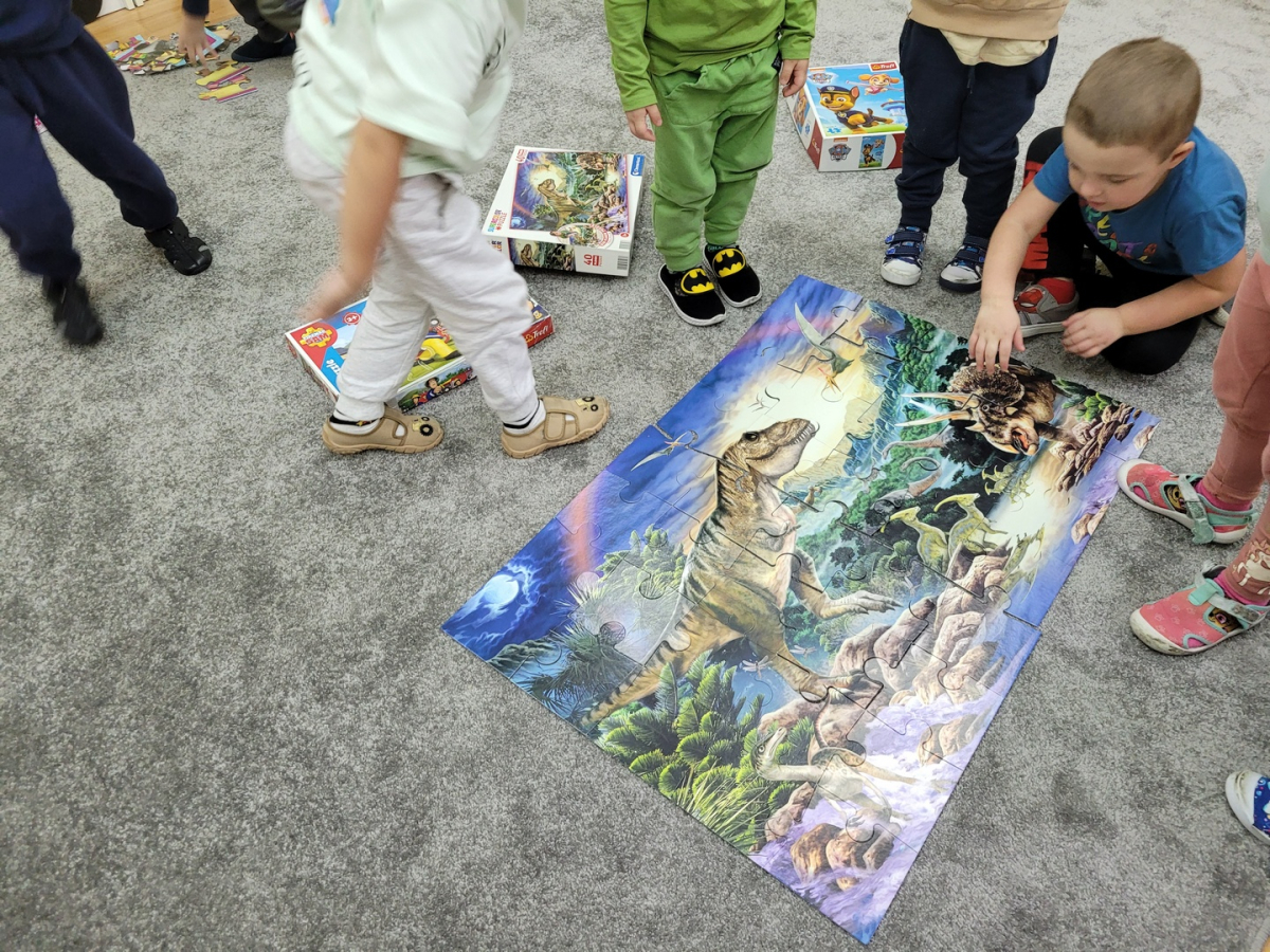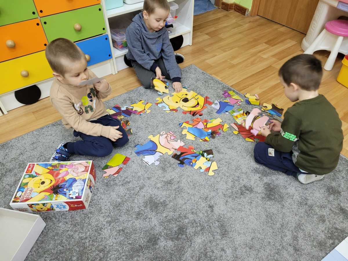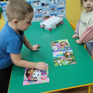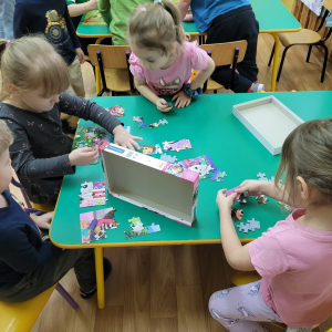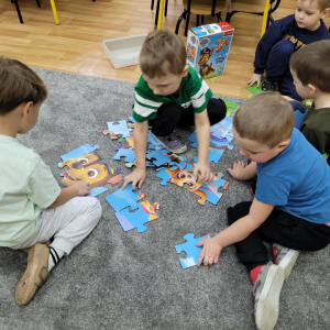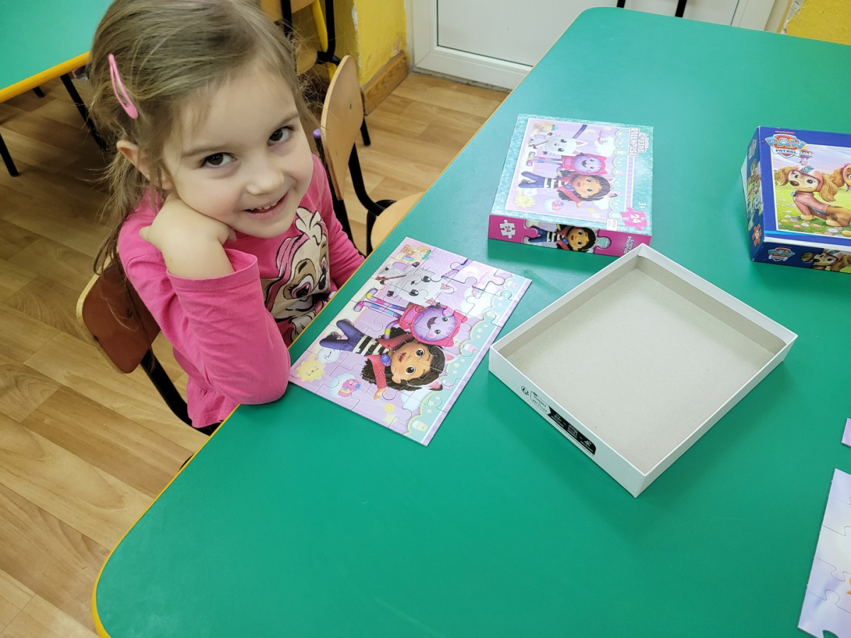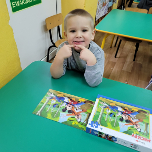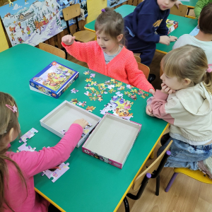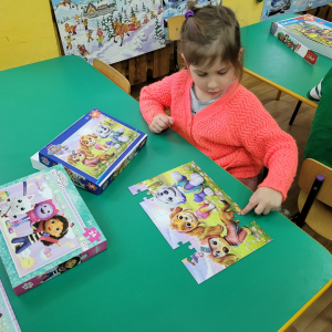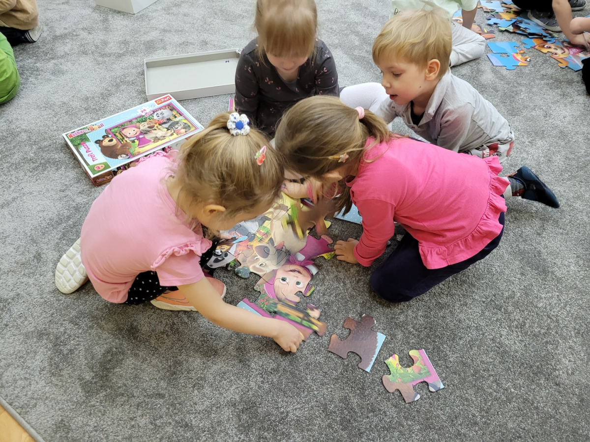 Zabawa puzzlami sprawia, że dziecko rozwija tak zwaną zdolność analizy i syntezy wzrokowej, czyli rozkładania całości na poszczególne elementy i ponownego składania ich w całość. Ponadto stymuluje rozwój mózgu, ćwiczy spostrzegawczość, koncentrację i cierpliwość. Buduje wiarę we własne możliwości, trenuje pamięć i rozwija manualnie. Przedszkolaki w naszej grupie z dużym zaciekawieniem i zaangażowaniem układały puzzle i układanki. Powstałe obrazki wywołały na twarzach dzieci duży zachwyt, satysfakcję oraz towarzyszącą im radość z osiągniętego celu.