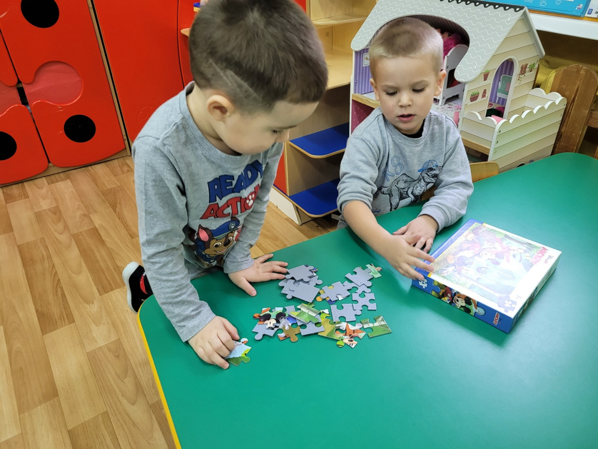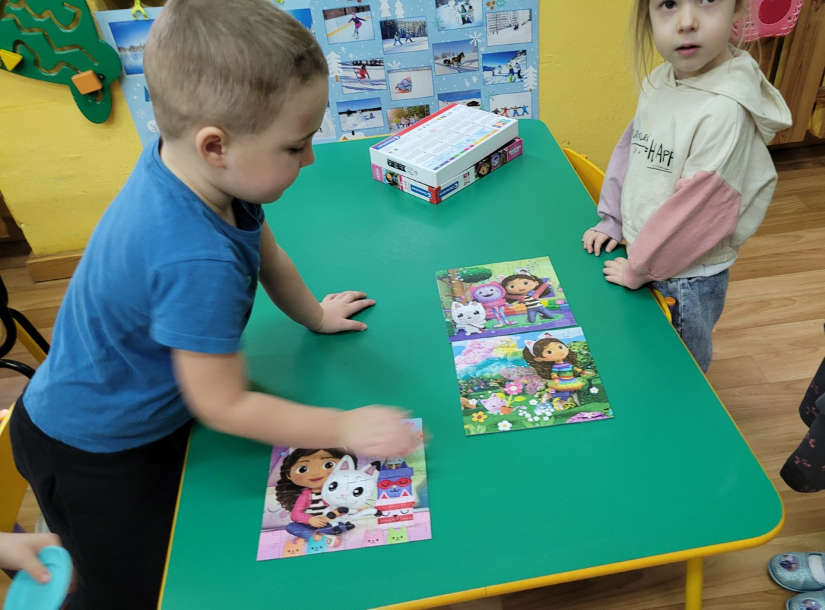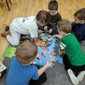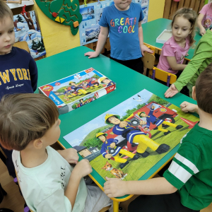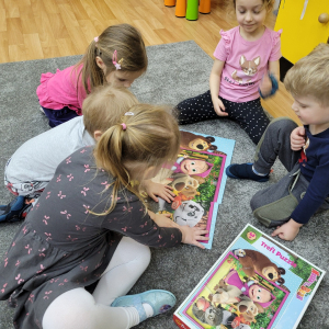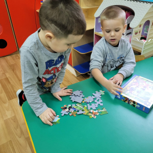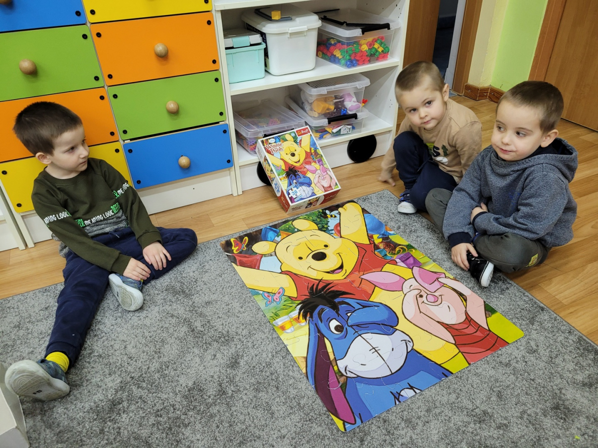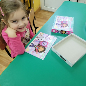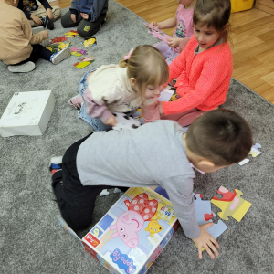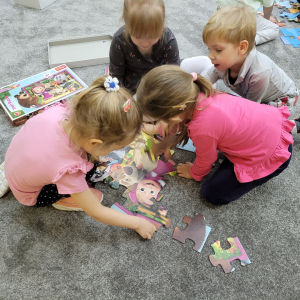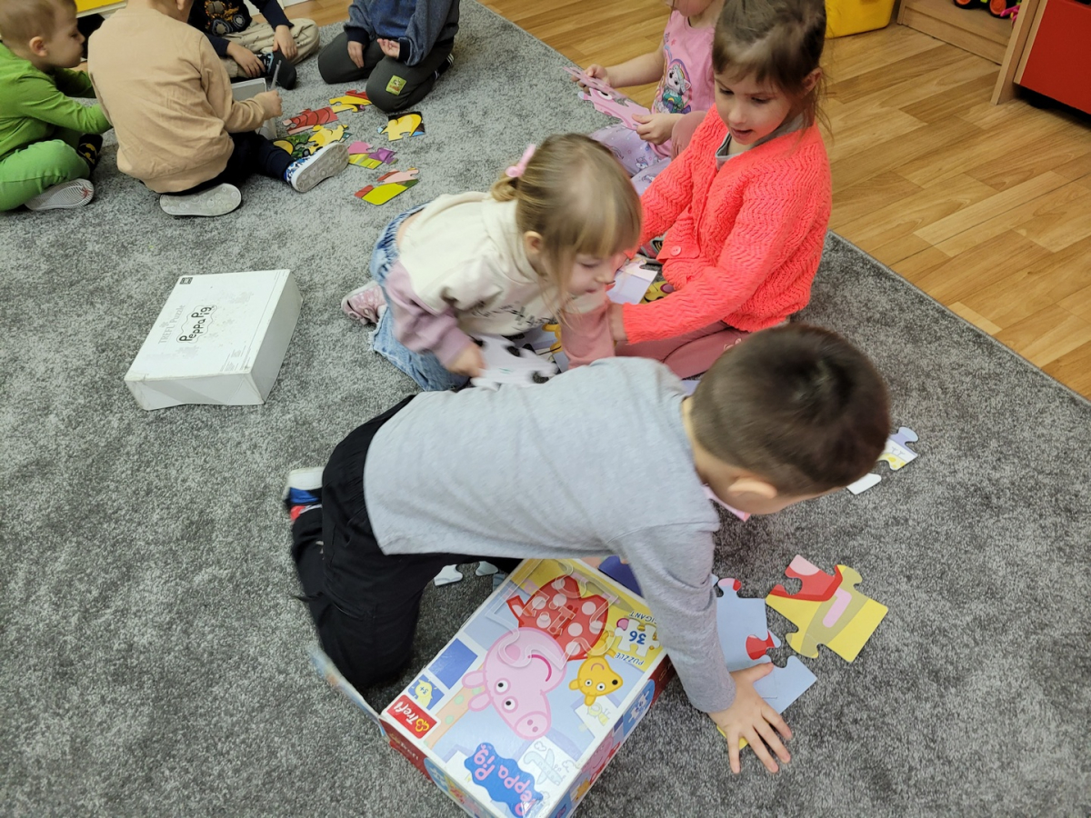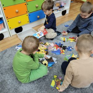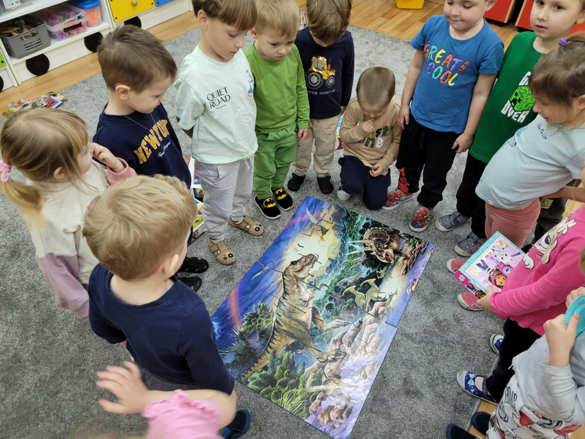 Zabawa puzzlami sprawia, że dziecko rozwija tak zwaną zdolność analizy i syntezy wzrokowej, czyli rozkładania całości na poszczególne elementy i ponownego składania ich w całość. Ponadto stymuluje rozwój mózgu, ćwiczy spostrzegawczość, koncentrację i cierpliwość. Buduje wiarę we własne możliwości, trenuje pamięć i rozwija manualnie. Przedszkolaki w naszej grupie z dużym zaciekawieniem i zaangażowaniem układały puzzle i układanki. Powstałe obrazki wywołały na twarzach dzieci duży zachwyt, satysfakcję oraz towarzyszącą im radość z osiągniętego celu.