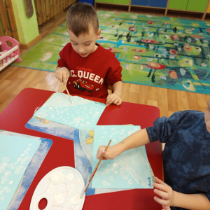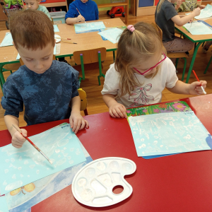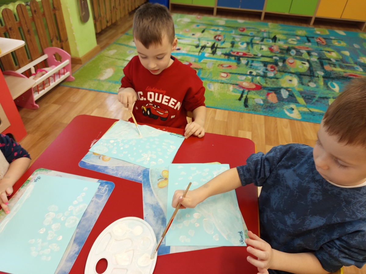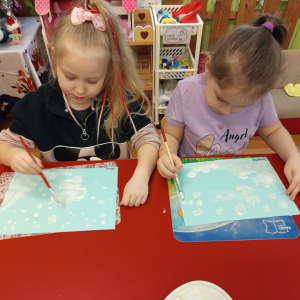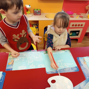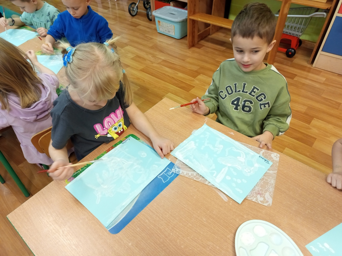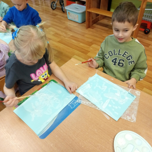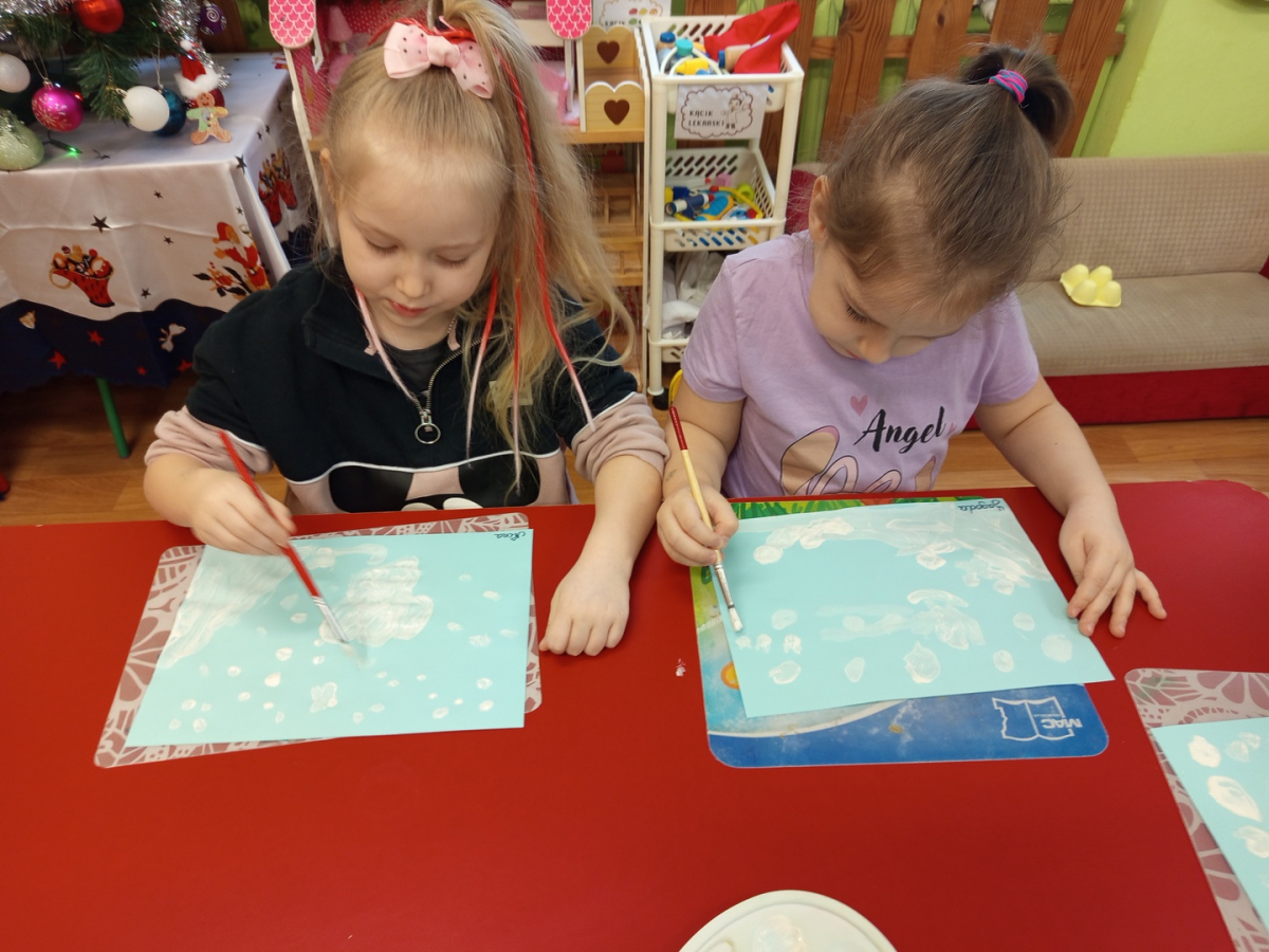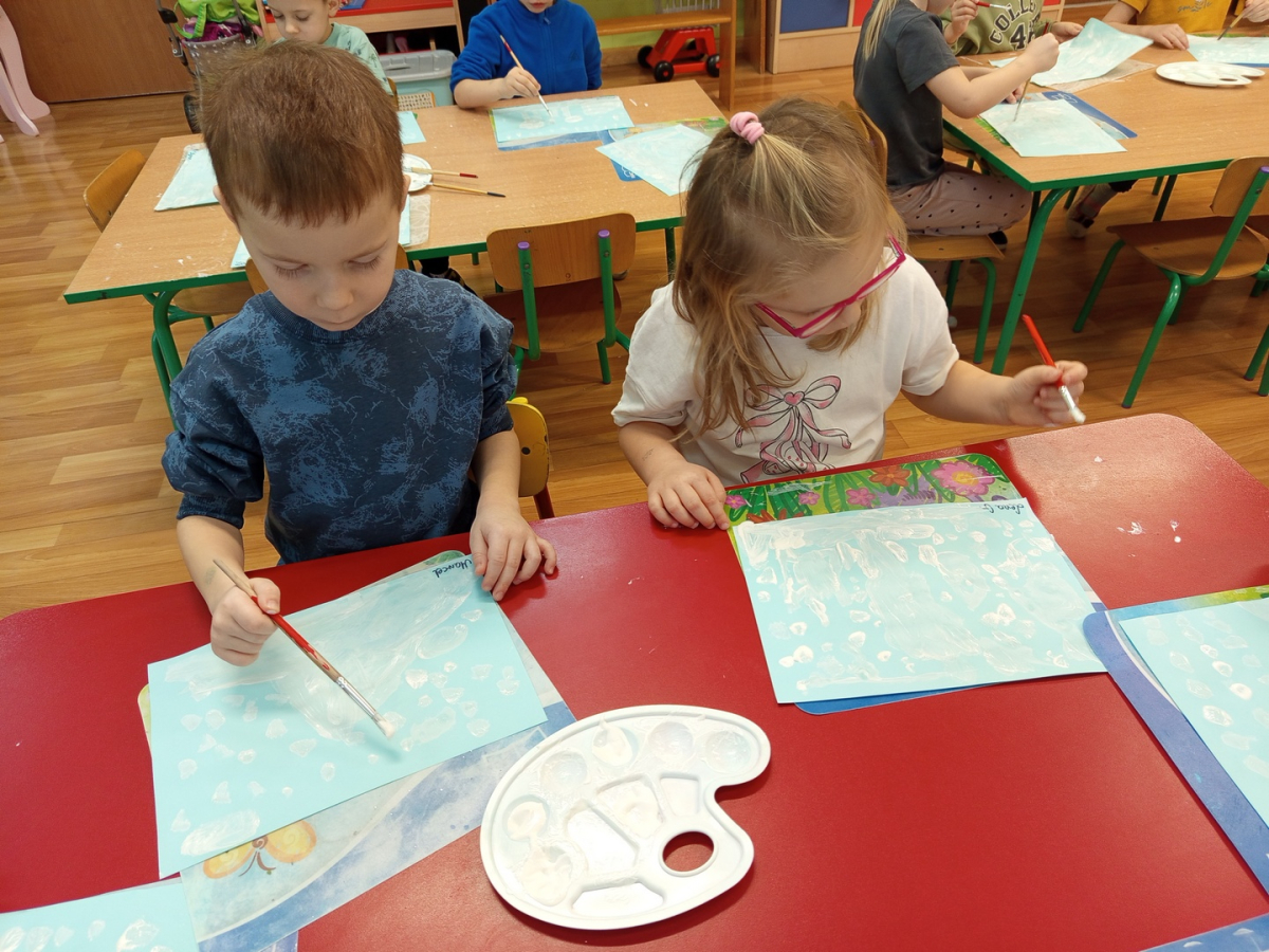 Podczas piątkowych zajęć dzieci rozmawiały o porach roku. Opowiadały o swoich ulubionych i uzasadniały swój wybór. Podsumowaniem zajęć było wykonaniem zimowego pejzażu.