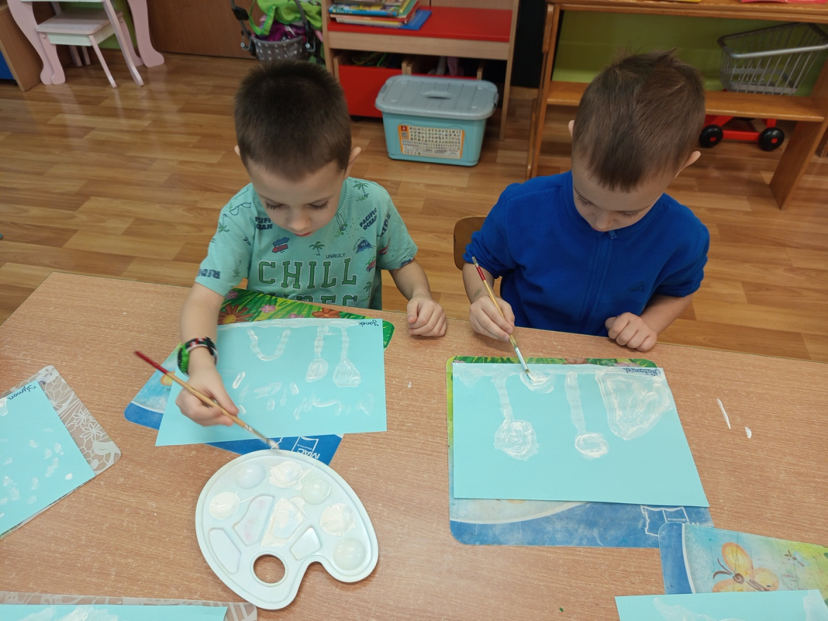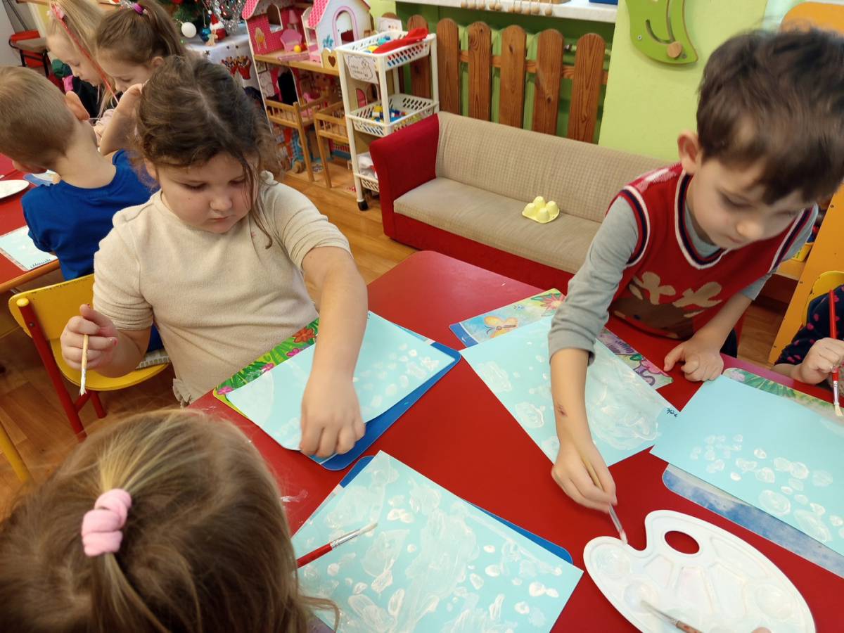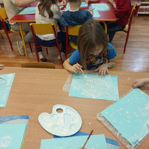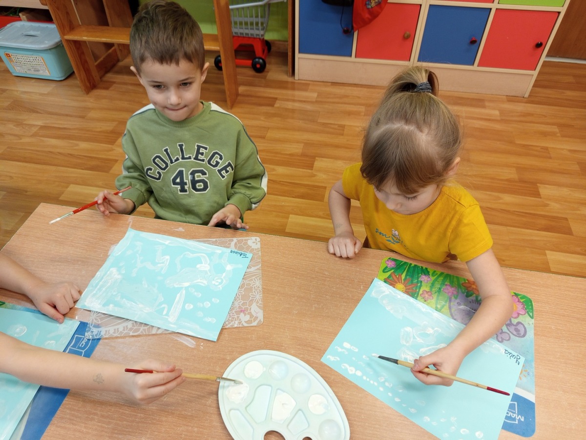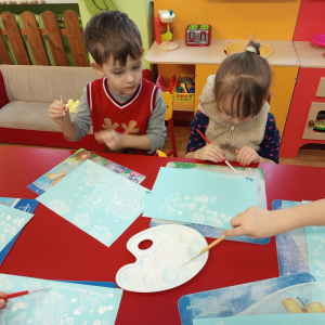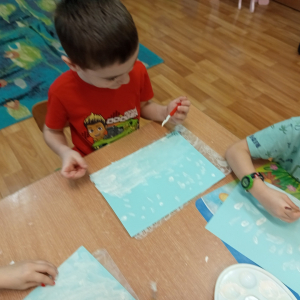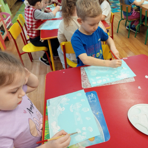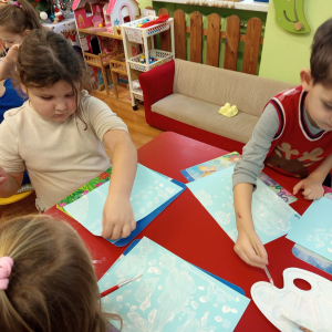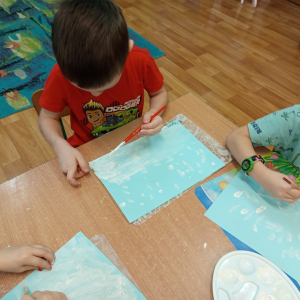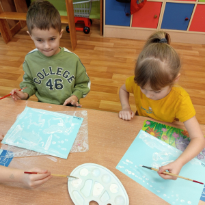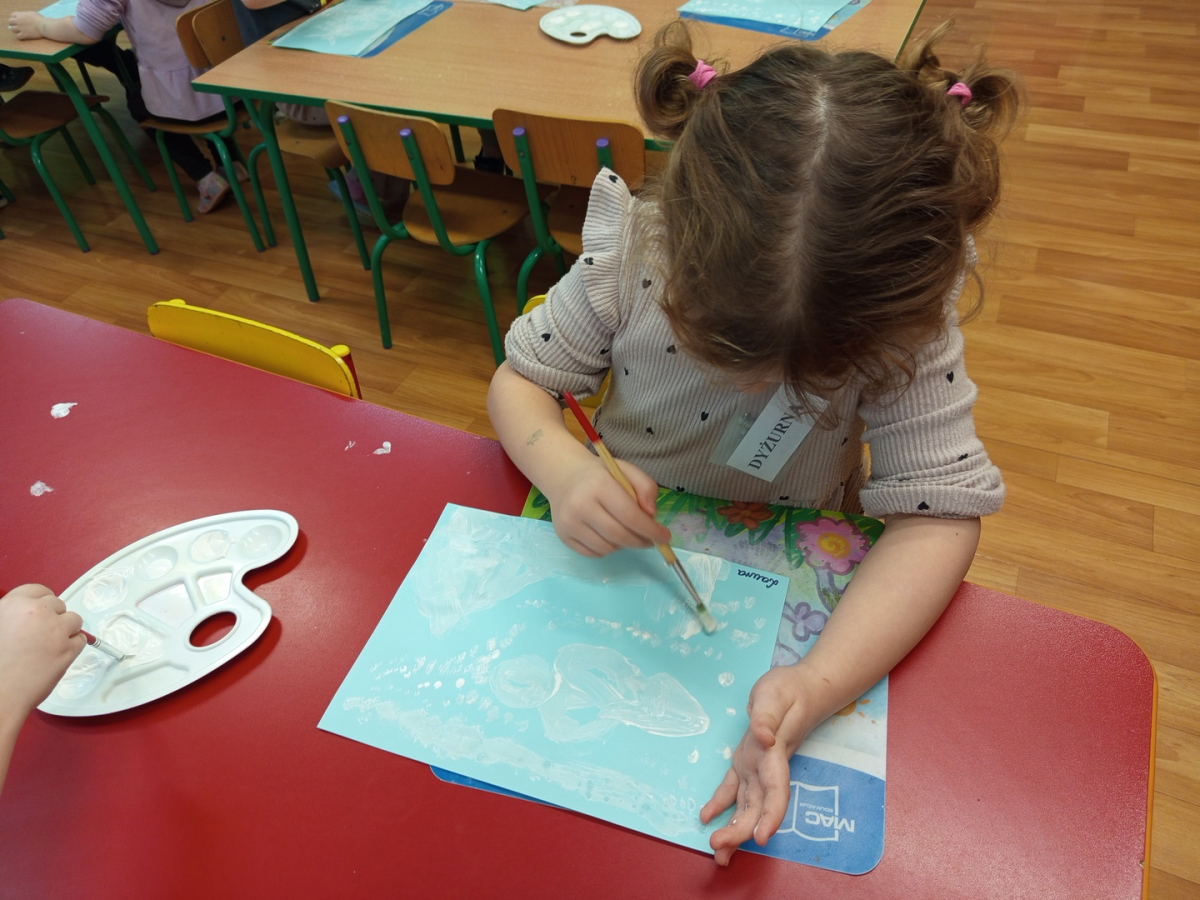 Podczas piątkowych zajęć dzieci rozmawiały o porach roku. Opowiadały o swoich ulubionych i uzasadniały swój wybór. Podsumowaniem zajęć było wykonaniem zimowego pejzażu.