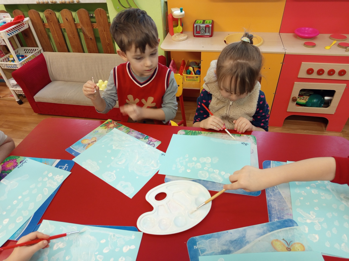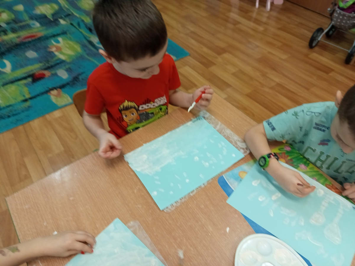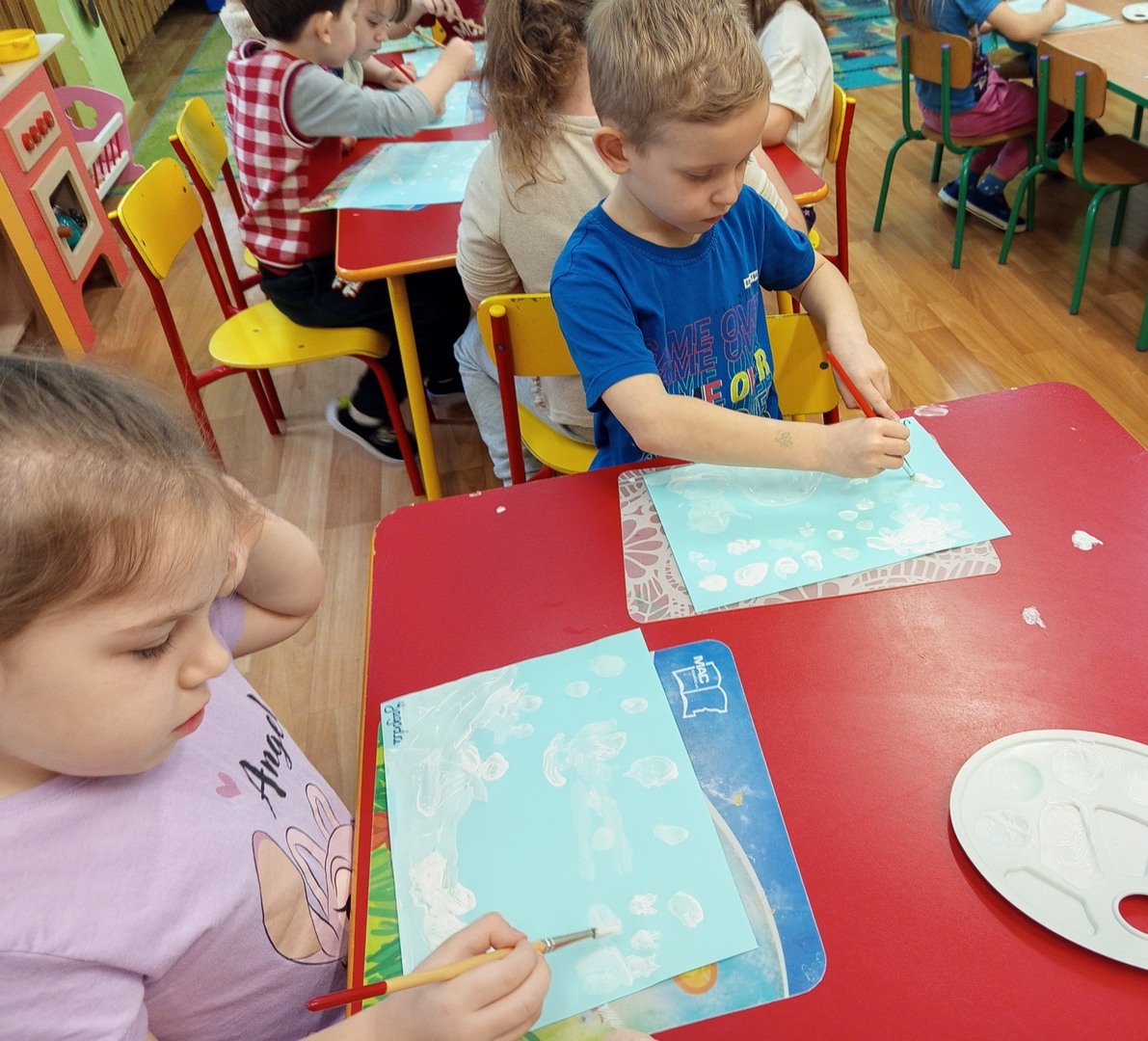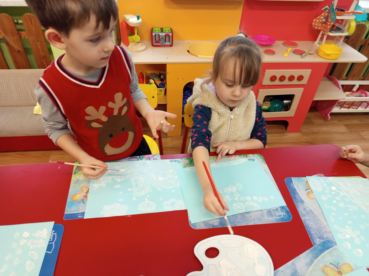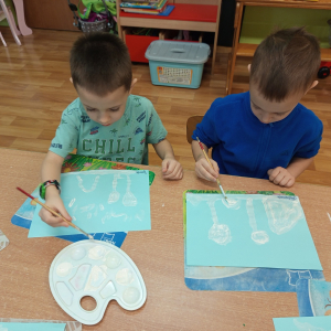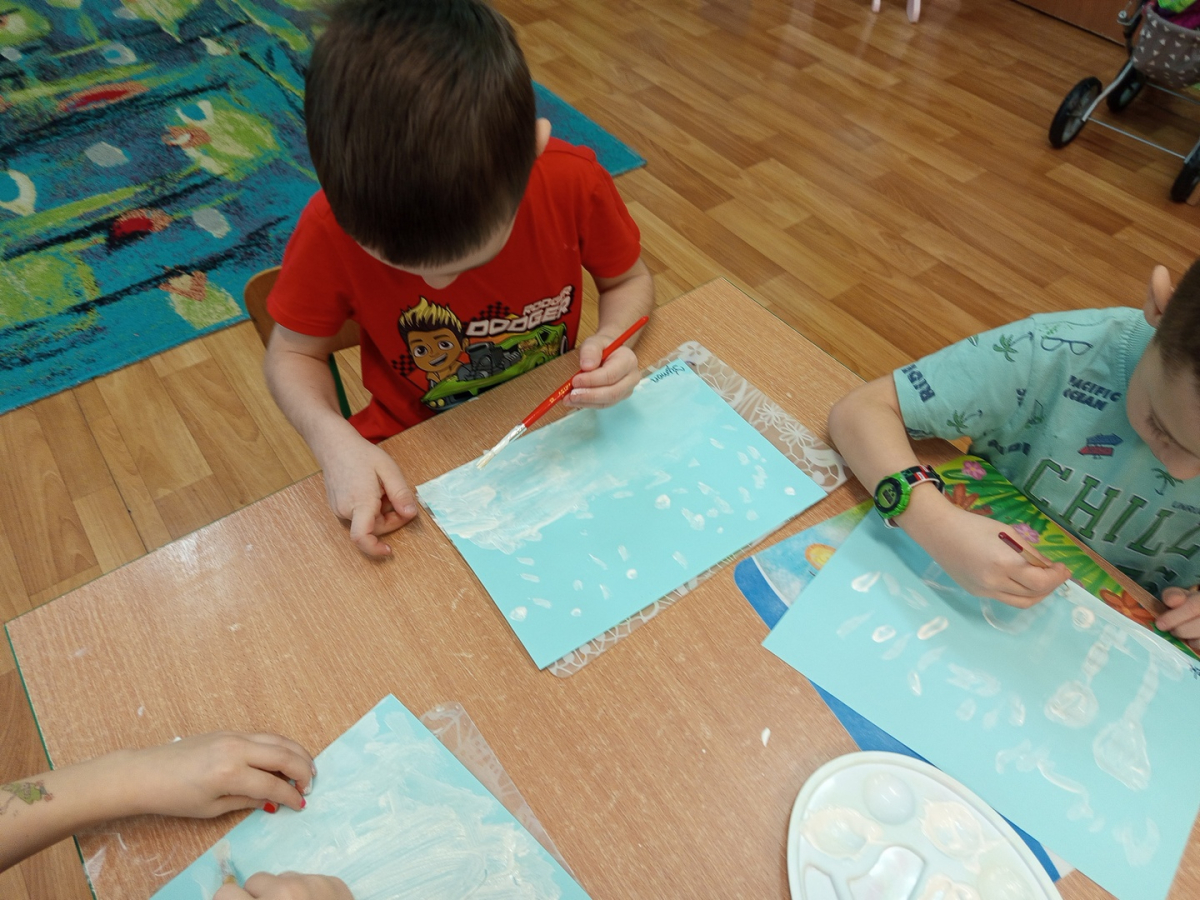 Podczas piątkowych zajęć dzieci rozmawiały o porach roku. Opowiadały o swoich ulubionych i uzasadniały swój wybór. Podsumowaniem zajęć było wykonaniem zimowego pejzażu.