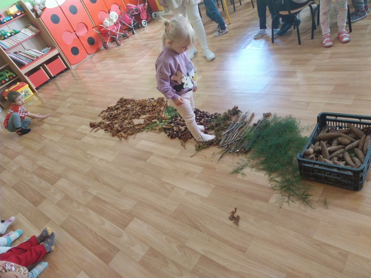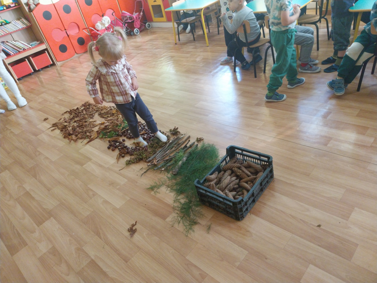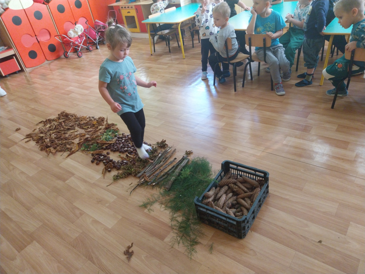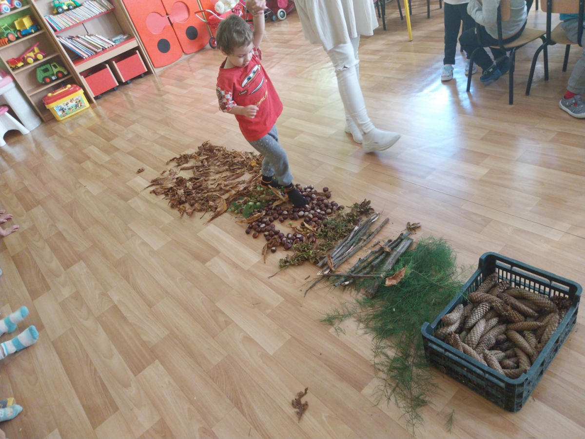 Grupa Biedronki zaprosiła nas na ścieżkę sensoryczną. To nie takie proste przejść beż butów po kasztanach, szyszkach, liściach...ale nam to się udało!