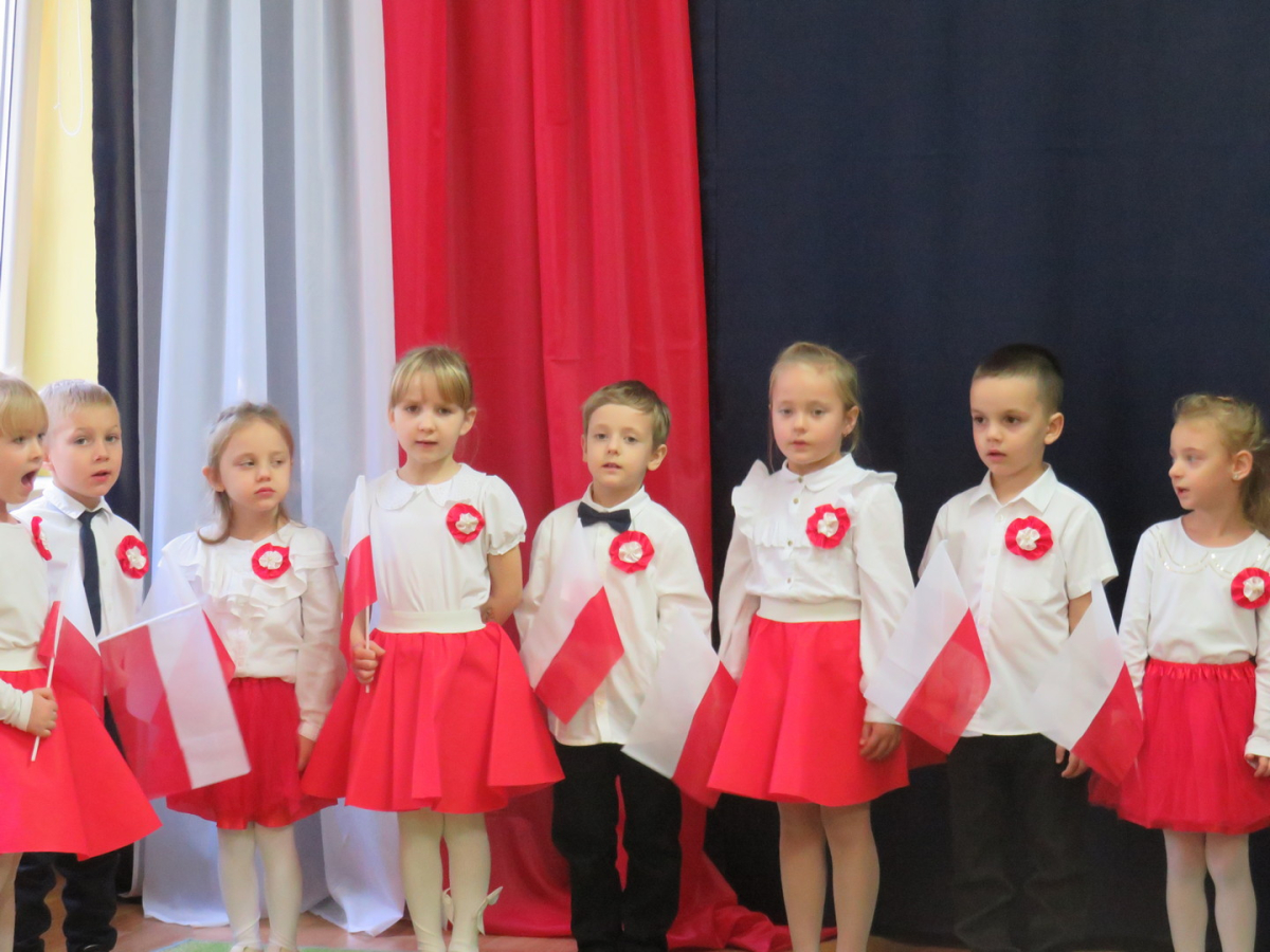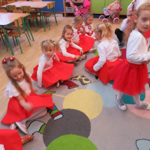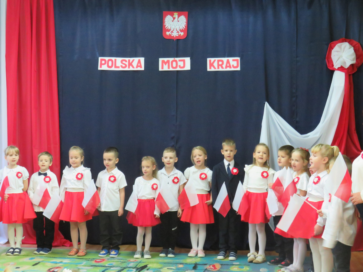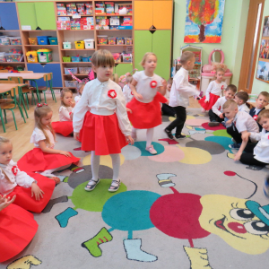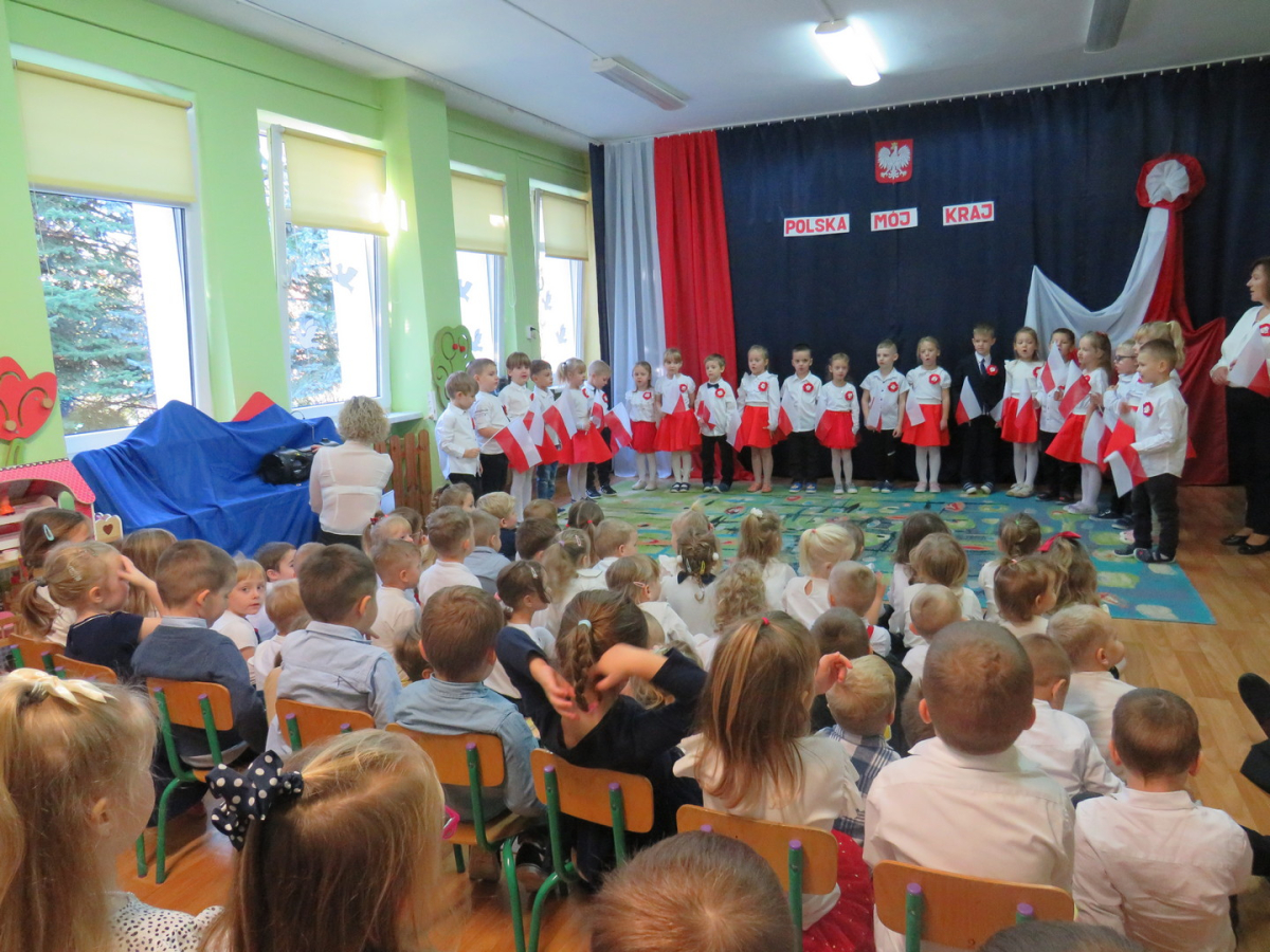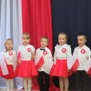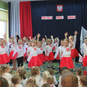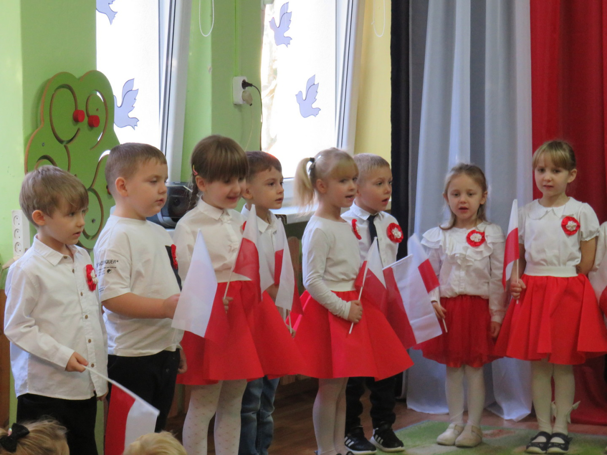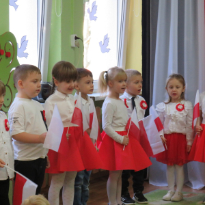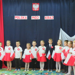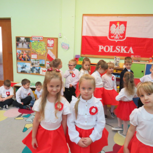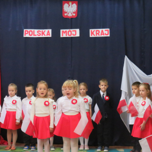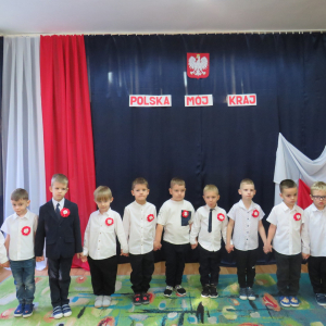 W przeddzień listopadowego święta dzieci z naszej grupy wraz ze wszystkimi przedszkolakami pięknie odśpiewały hymn oraz zaprezentowały młodszym kolegom część artystyczną o tematyce patriotycznej.