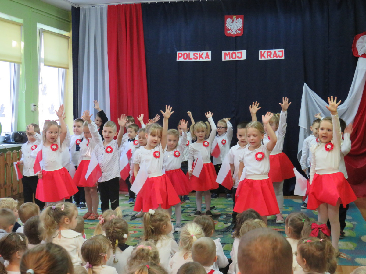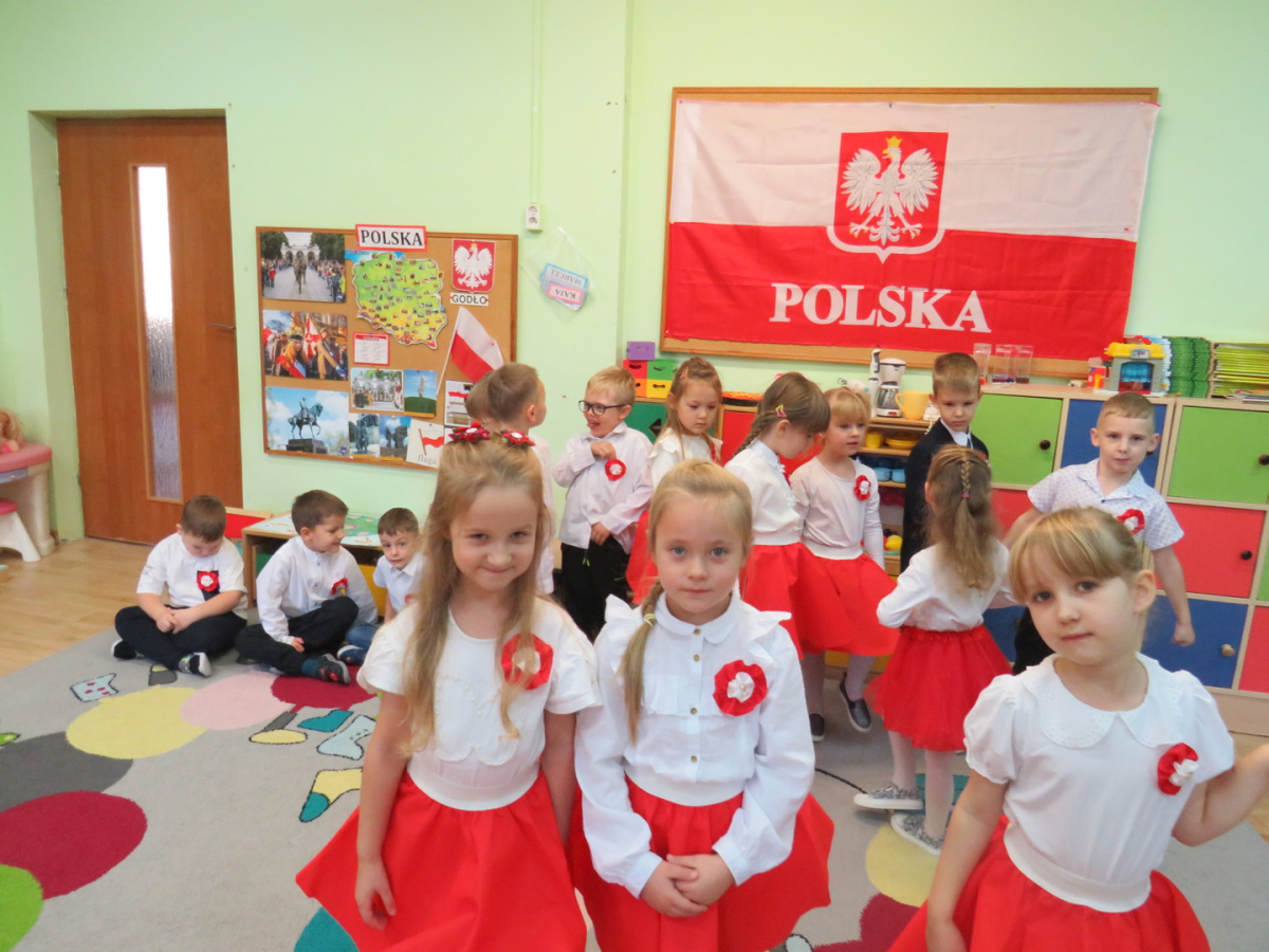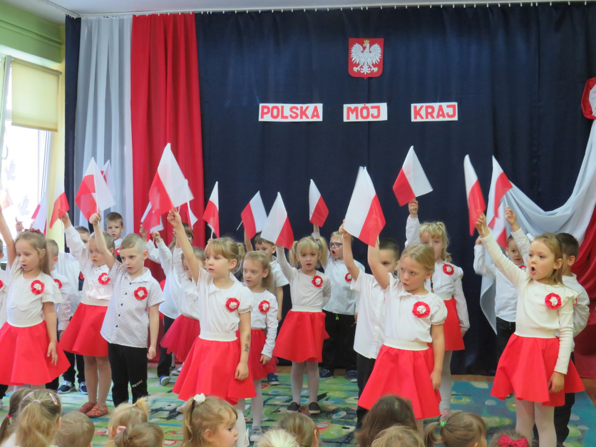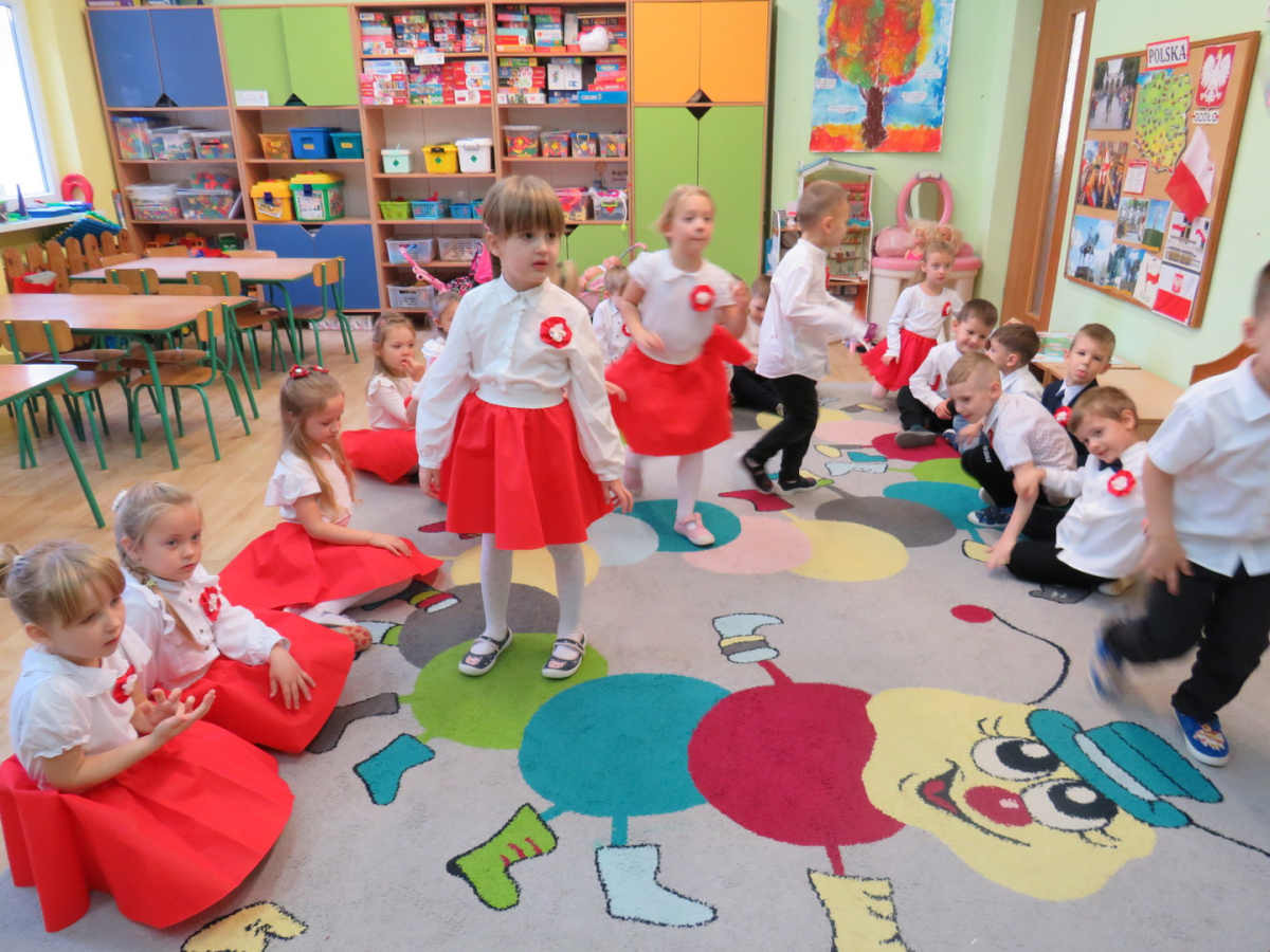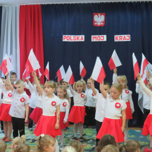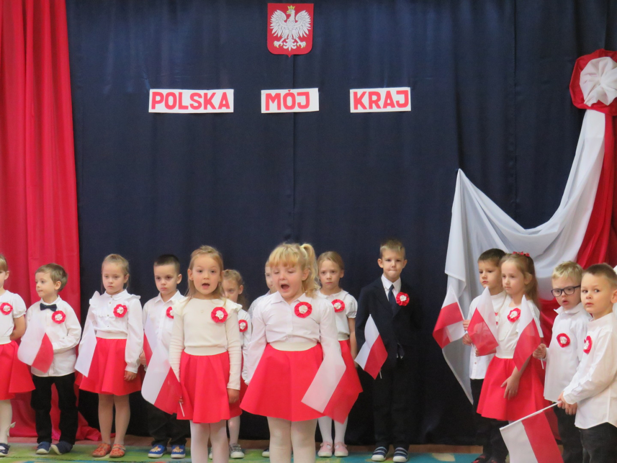 W przeddzień listopadowego święta dzieci z naszej grupy wraz ze wszystkimi przedszkolakami pięknie odśpiewały hymn oraz zaprezentowały młodszym kolegom część artystyczną o tematyce patriotycznej.