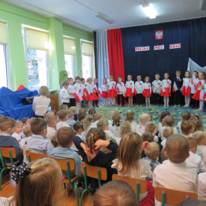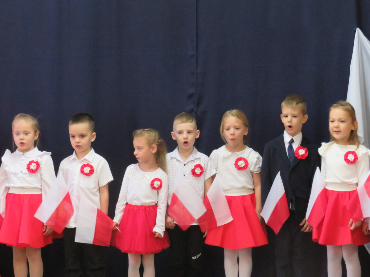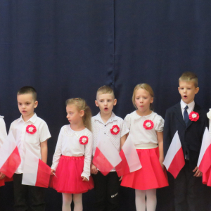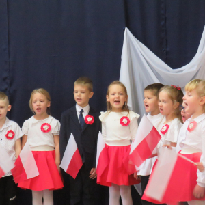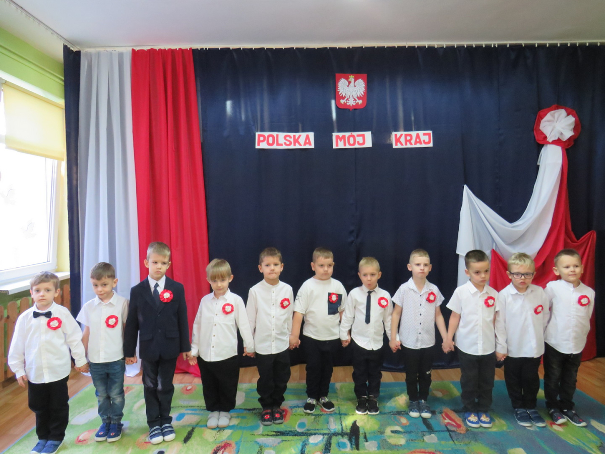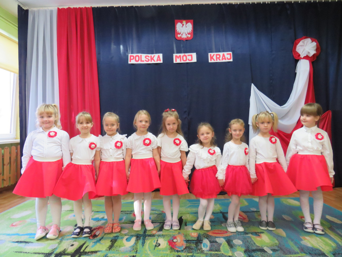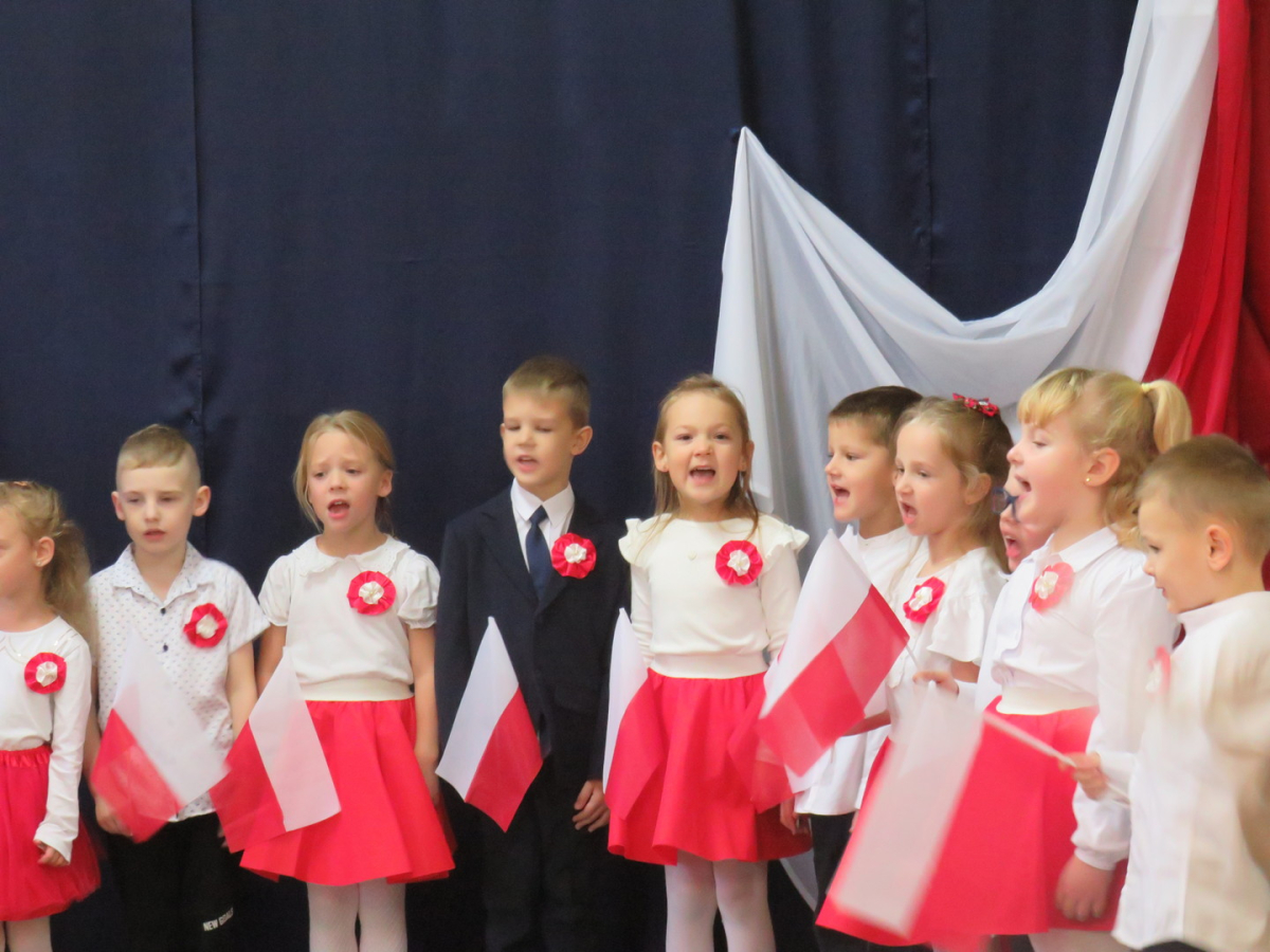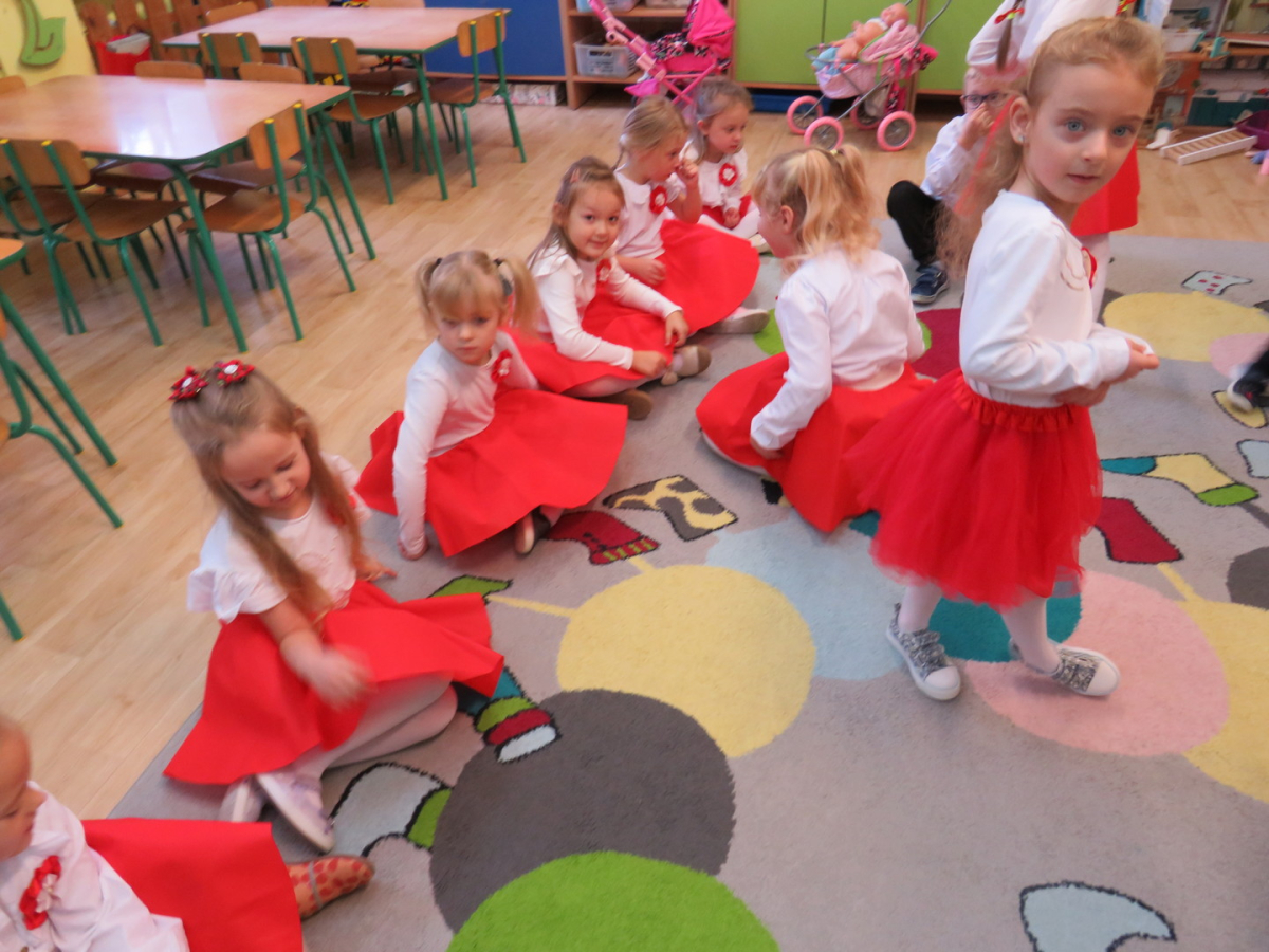 W przeddzień listopadowego święta dzieci z naszej grupy wraz ze wszystkimi przedszkolakami pięknie odśpiewały hymn oraz zaprezentowały młodszym kolegom część artystyczną o tematyce patriotycznej.