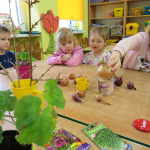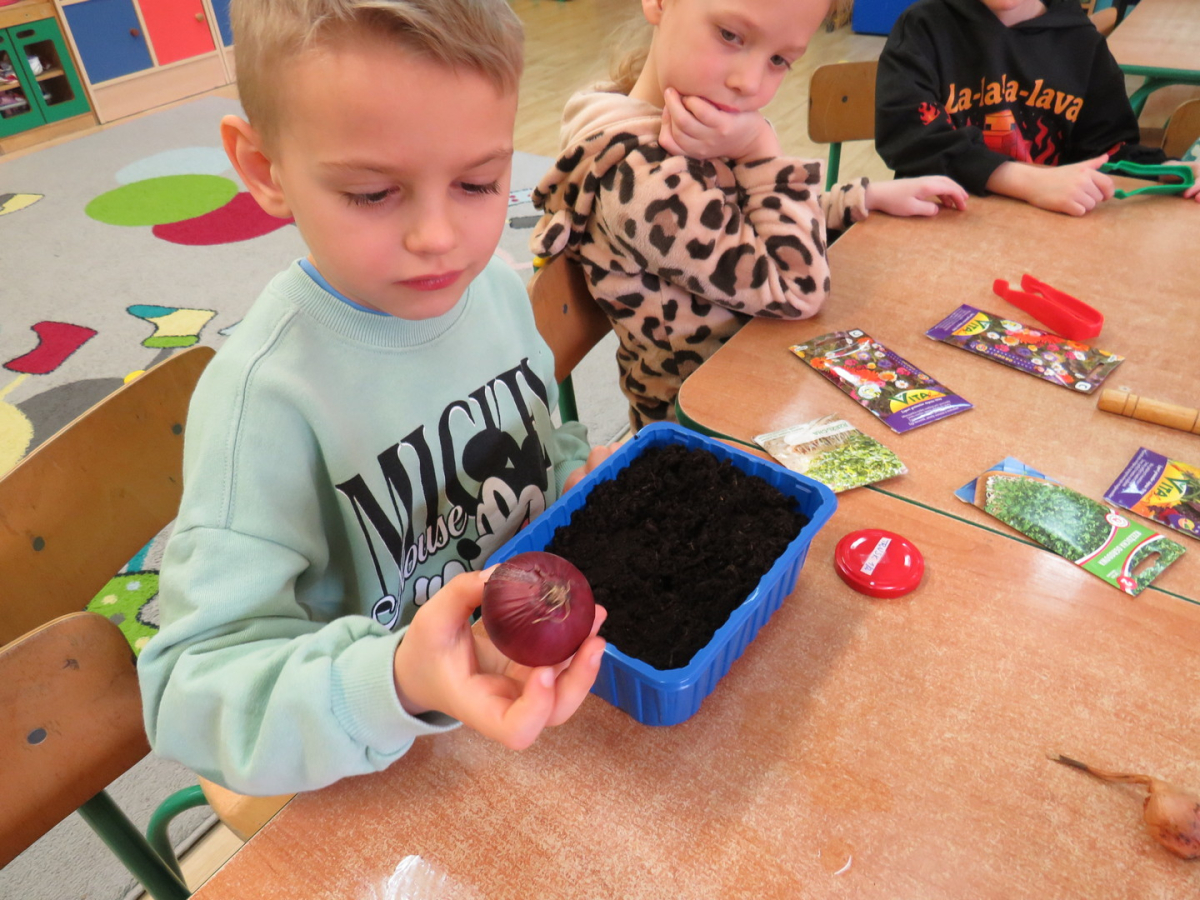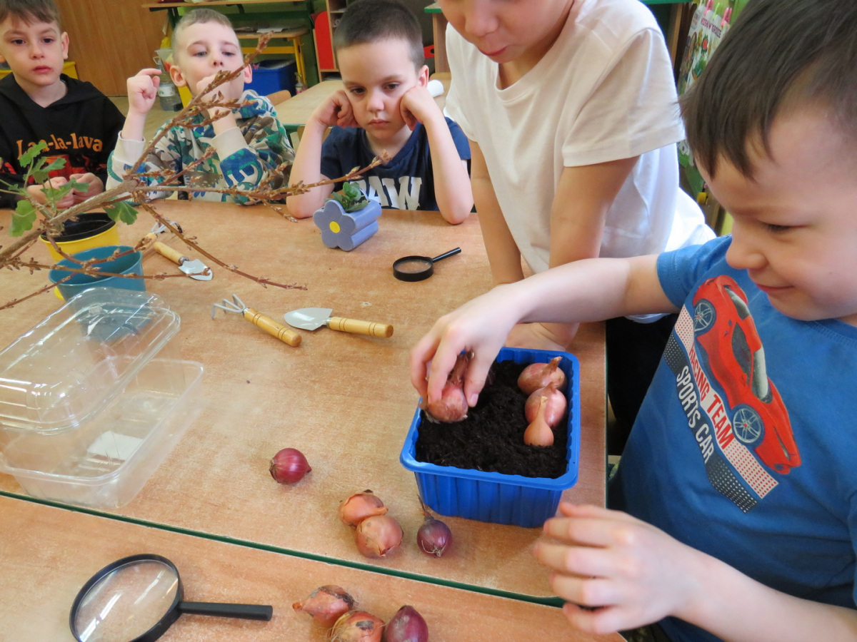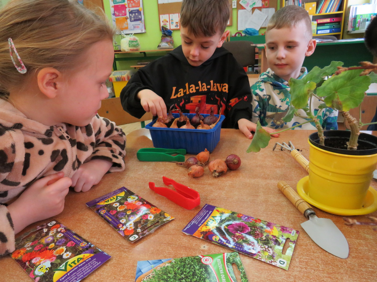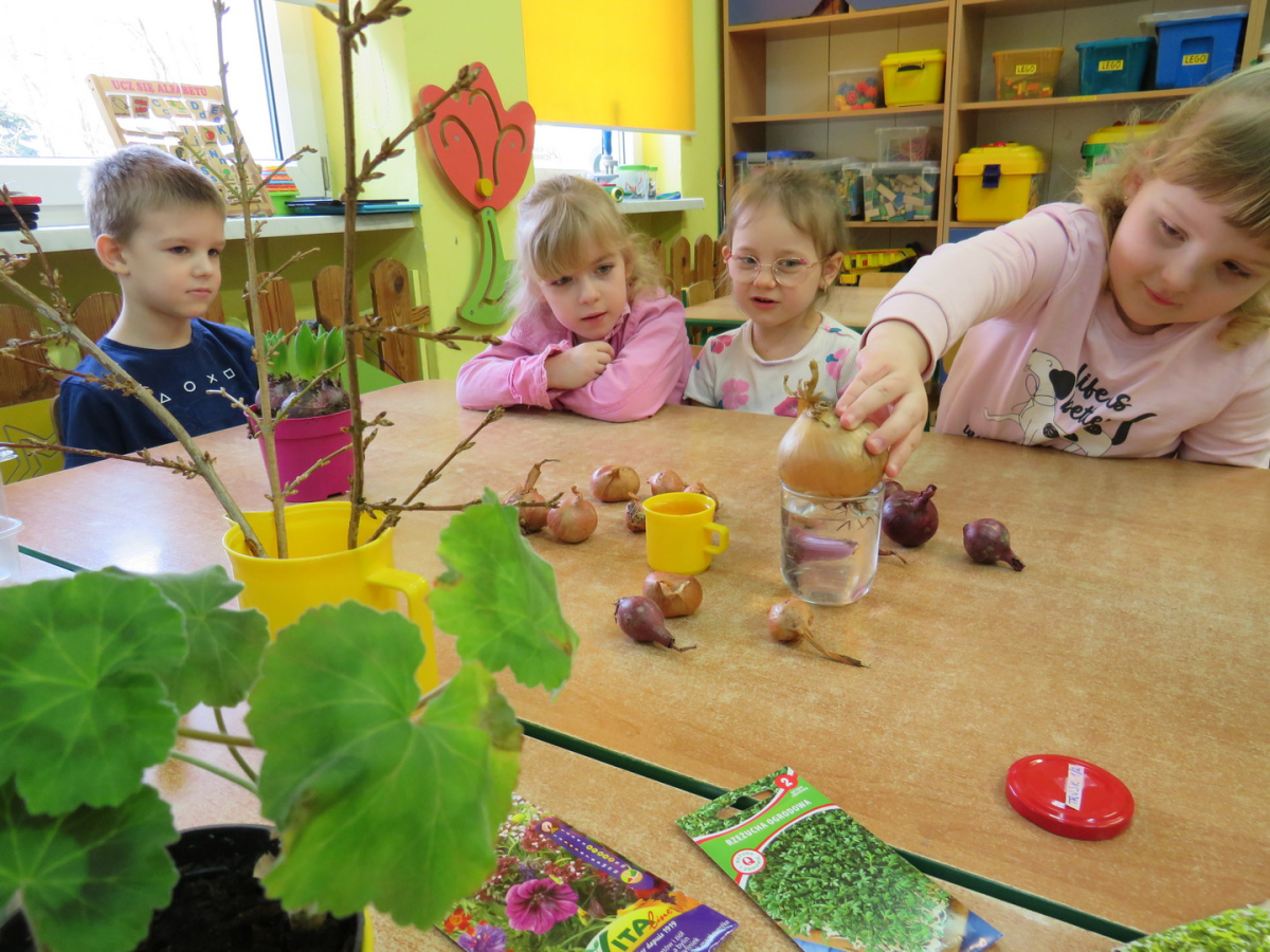 Na dworze jeszcze chłodno, ale dzieci w przedszkolu już zaczynają sadzenie i sianie nowalijek. Z cebuli wyrośnie smaczny szczypiorek, a małe nasionka zamienią się w zieloną pełną witamin rzeżuchę.