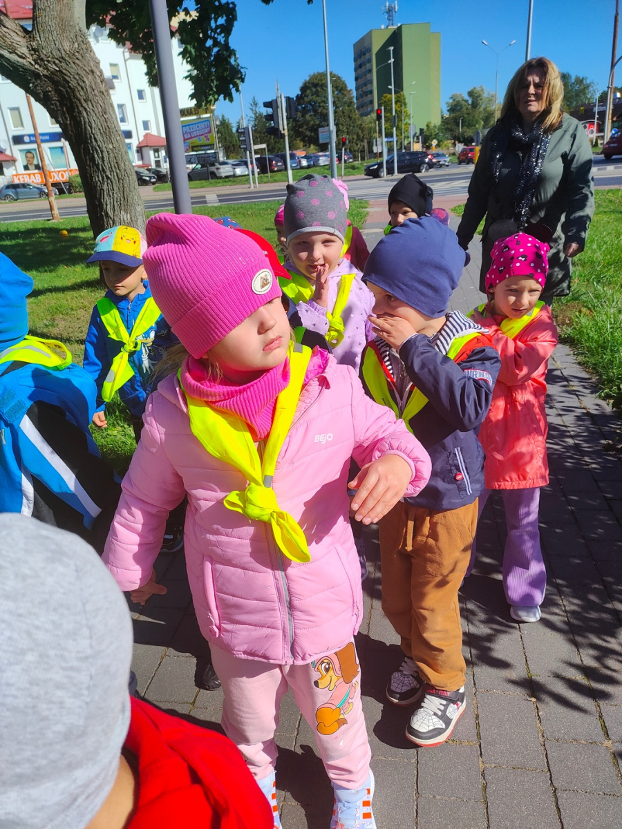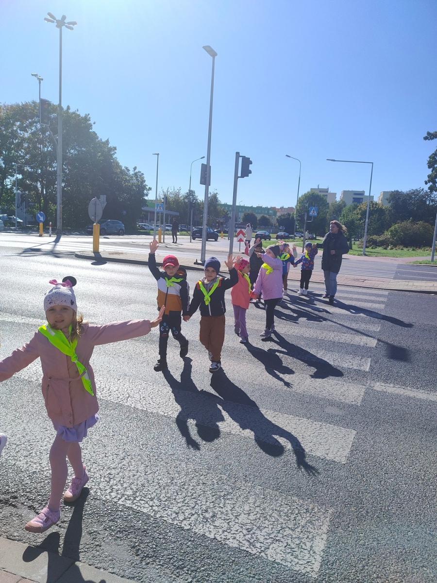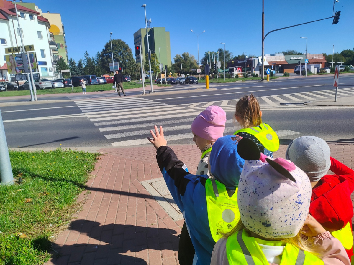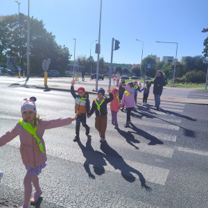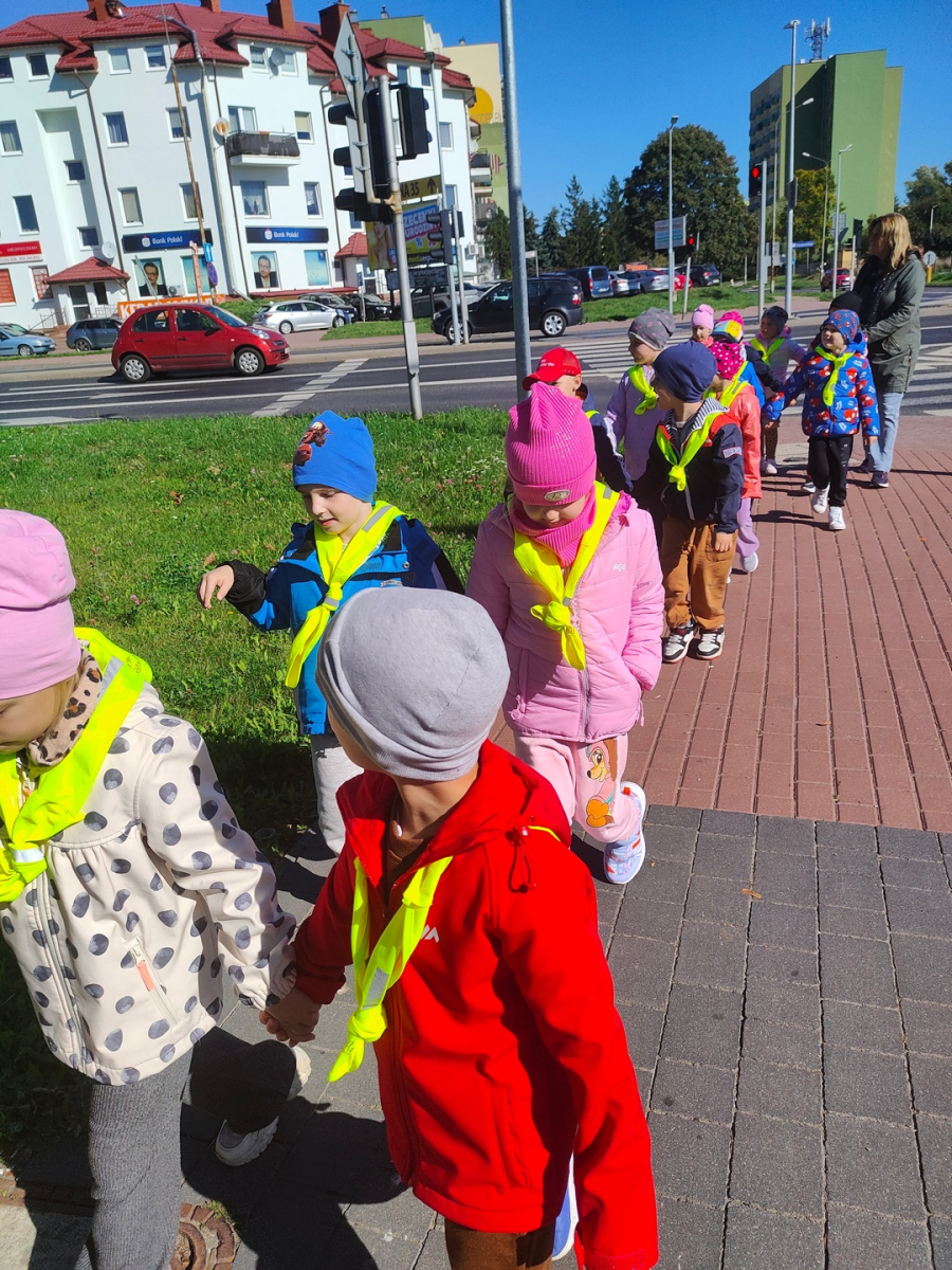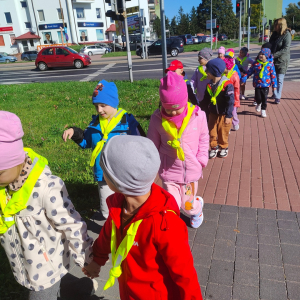 Dzieci z grupy "Żabki" uczyły się w terenie bezpiecznego przechodzenia przez ulicę .Każde dziecko, aby być widocznym miało założoną kamizelkę z odblaskami. Przechodziły po oznakowanych przejściach dla pieszych oraz przejściu z sygnalizacja świetlną.