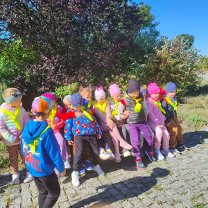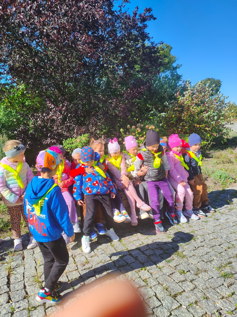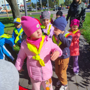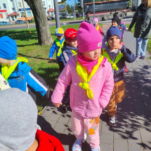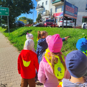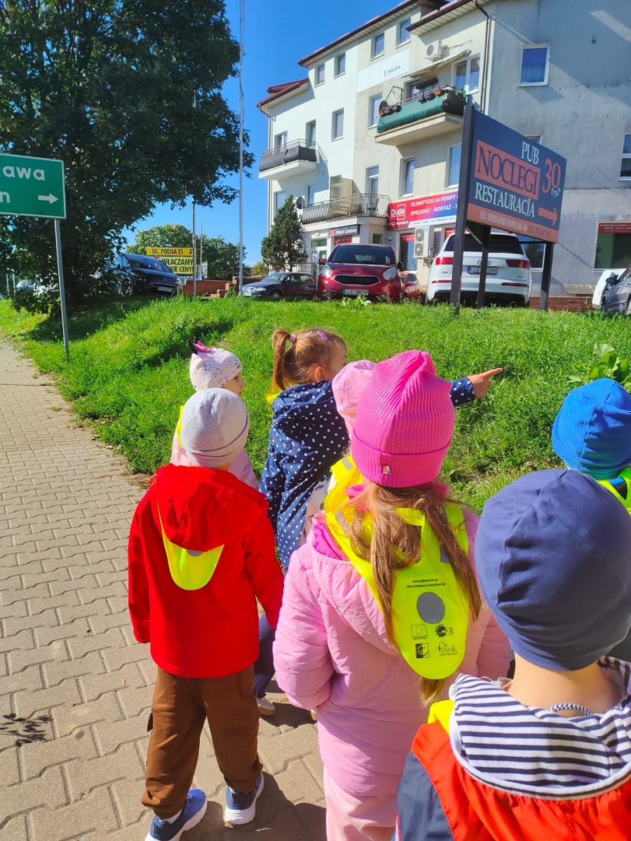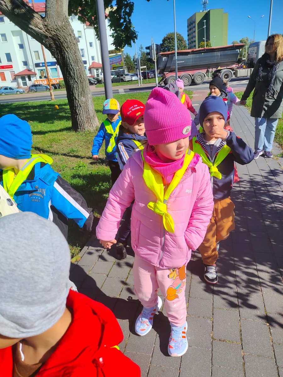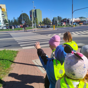 Dzieci z grupy "Żabki" uczyły się w terenie bezpiecznego przechodzenia przez ulicę .Każde dziecko, aby być widocznym miało założoną kamizelkę z odblaskami. Przechodziły po oznakowanych przejściach dla pieszych oraz przejściu z sygnalizacja świetlną.