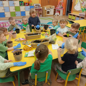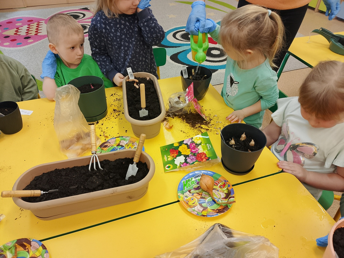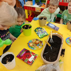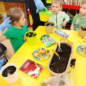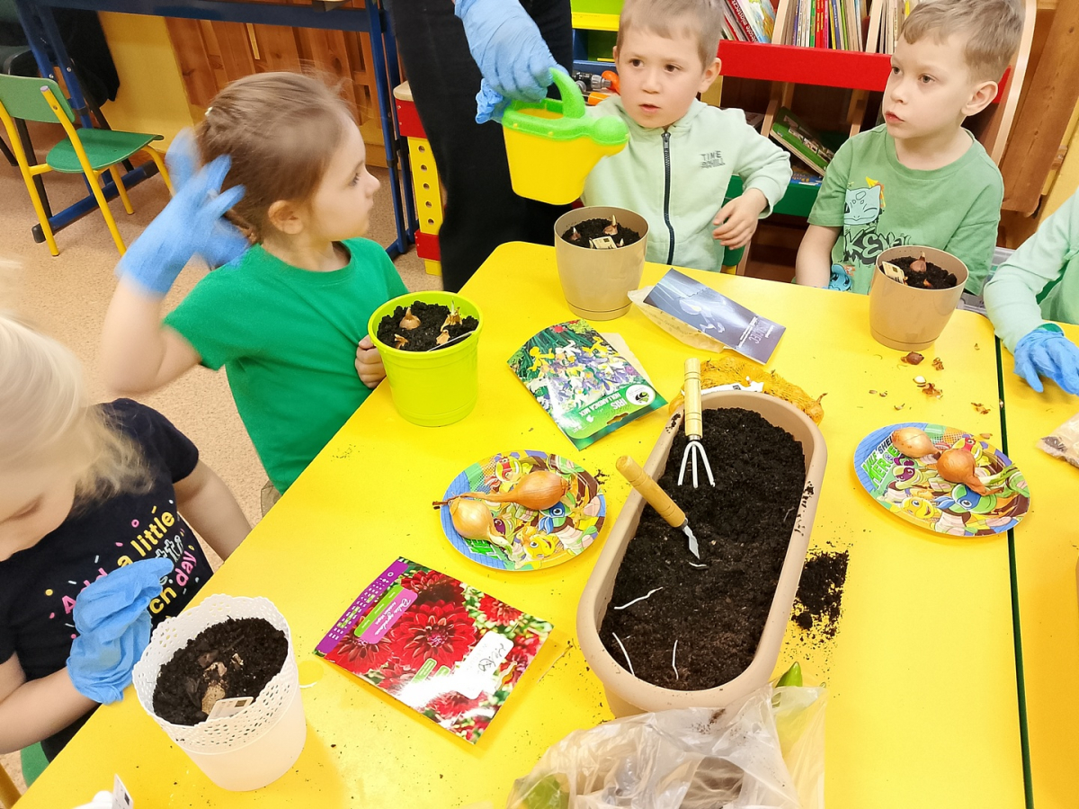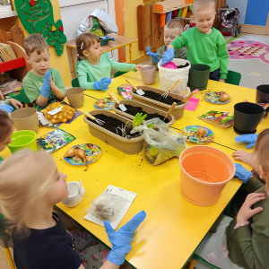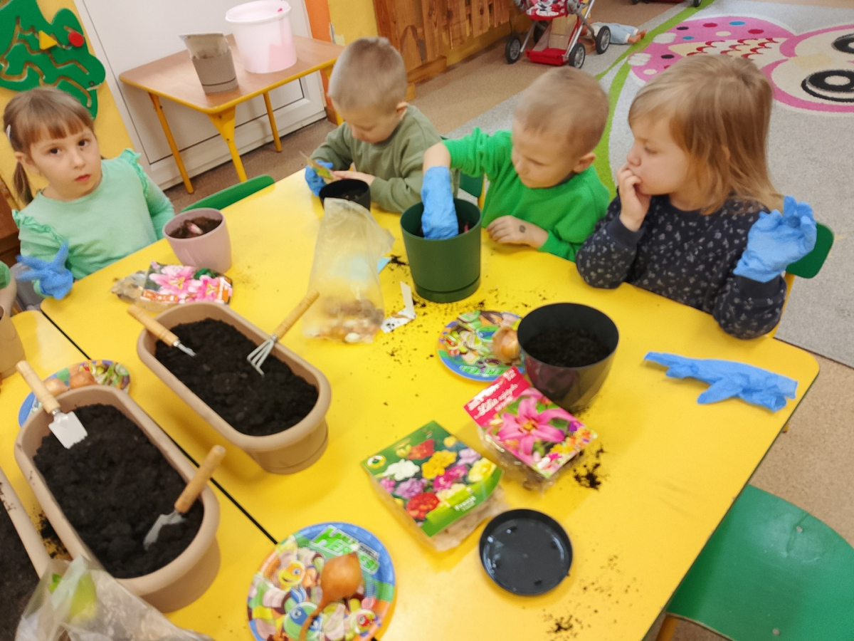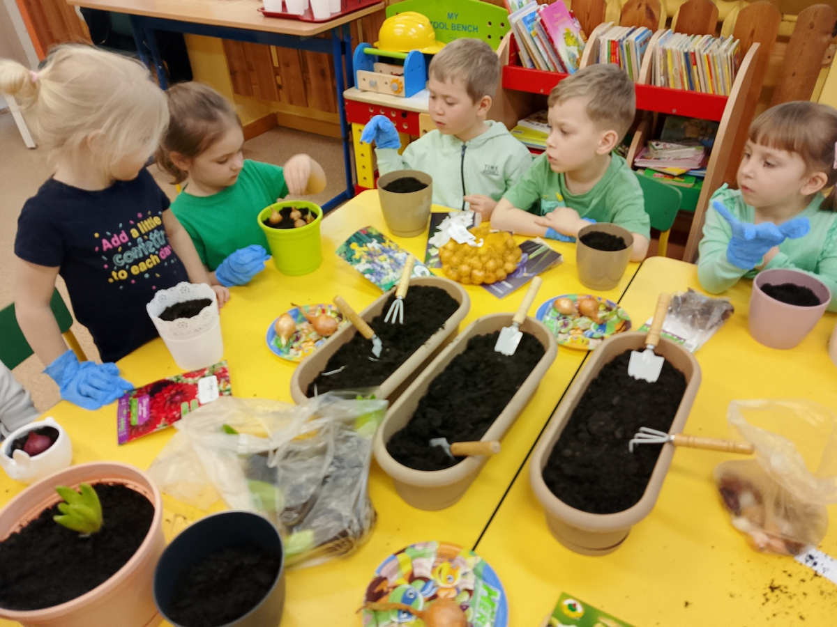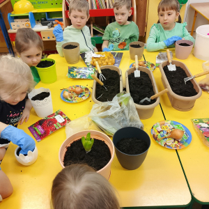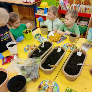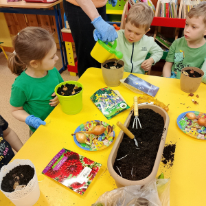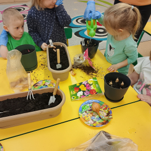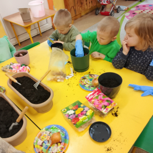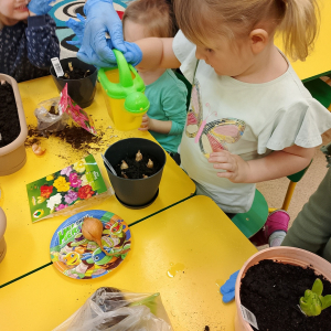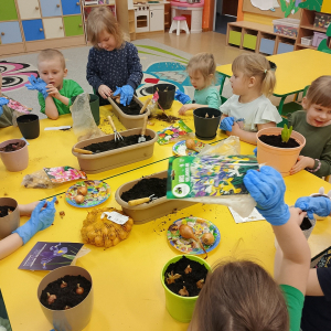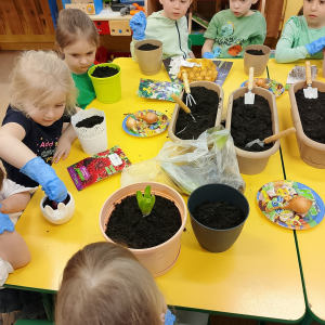 W naszej sali zalożyliśmy wiosenny ogródek. Dzieci chętnie uczestniczyły w sadzeniu cebulek kwiatowych. Dowiedziały się, co jest potrzebne do wzrostu roślin i jak trzeba o nie dbać. Codziennie prowadzą obserwacje efekty wspólnej pracy.