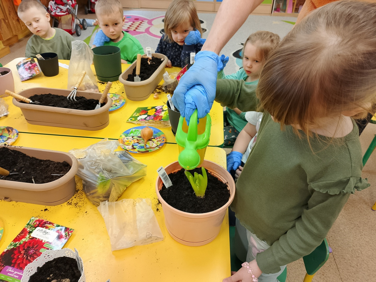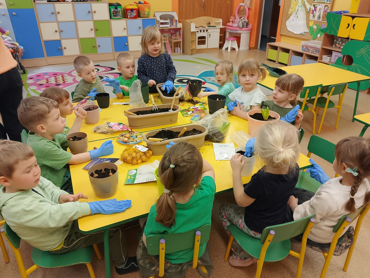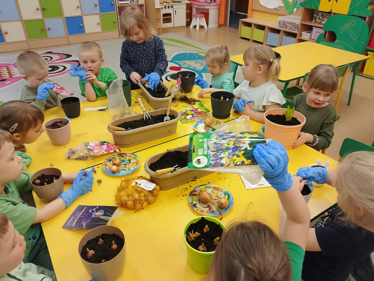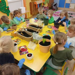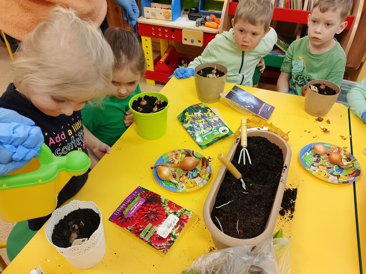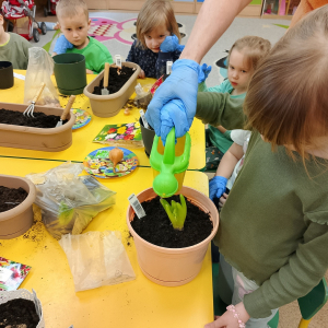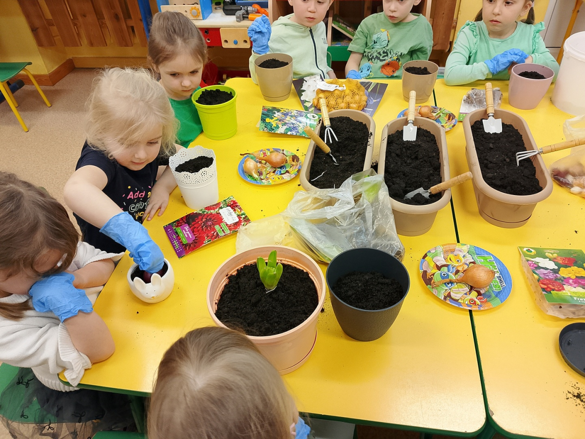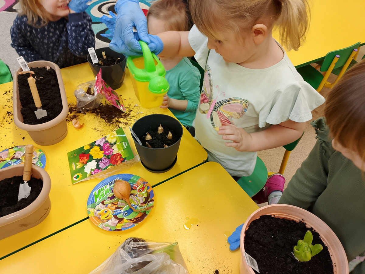 W naszej sali zalożyliśmy wiosenny ogródek. Dzieci chętnie uczestniczyły w sadzeniu cebulek kwiatowych. Dowiedziały się, co jest potrzebne do wzrostu roślin i jak trzeba o nie dbać. Codziennie prowadzą obserwacje efekty wspólnej pracy.