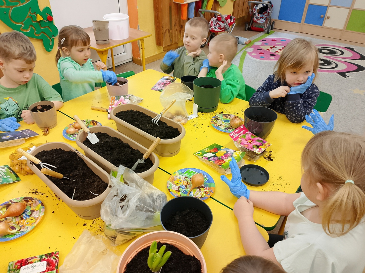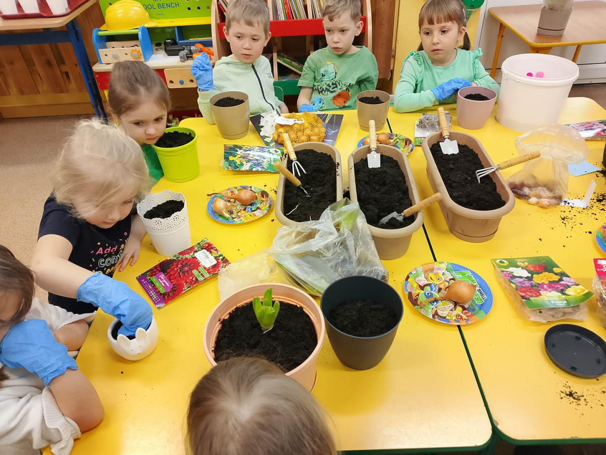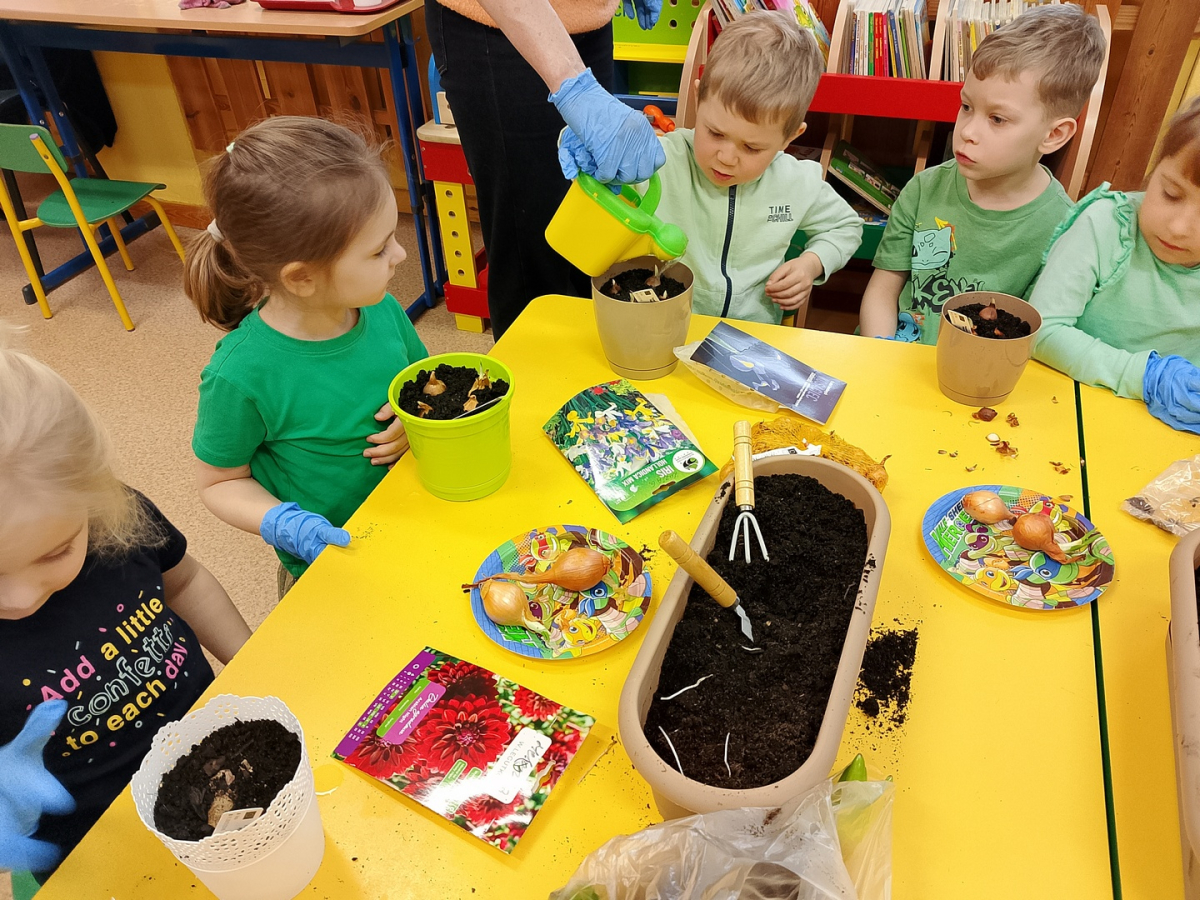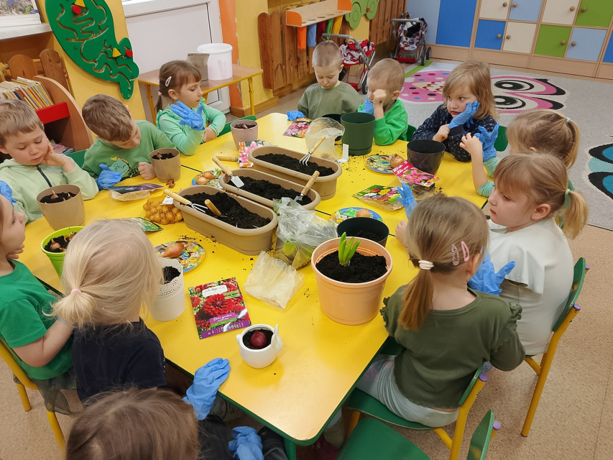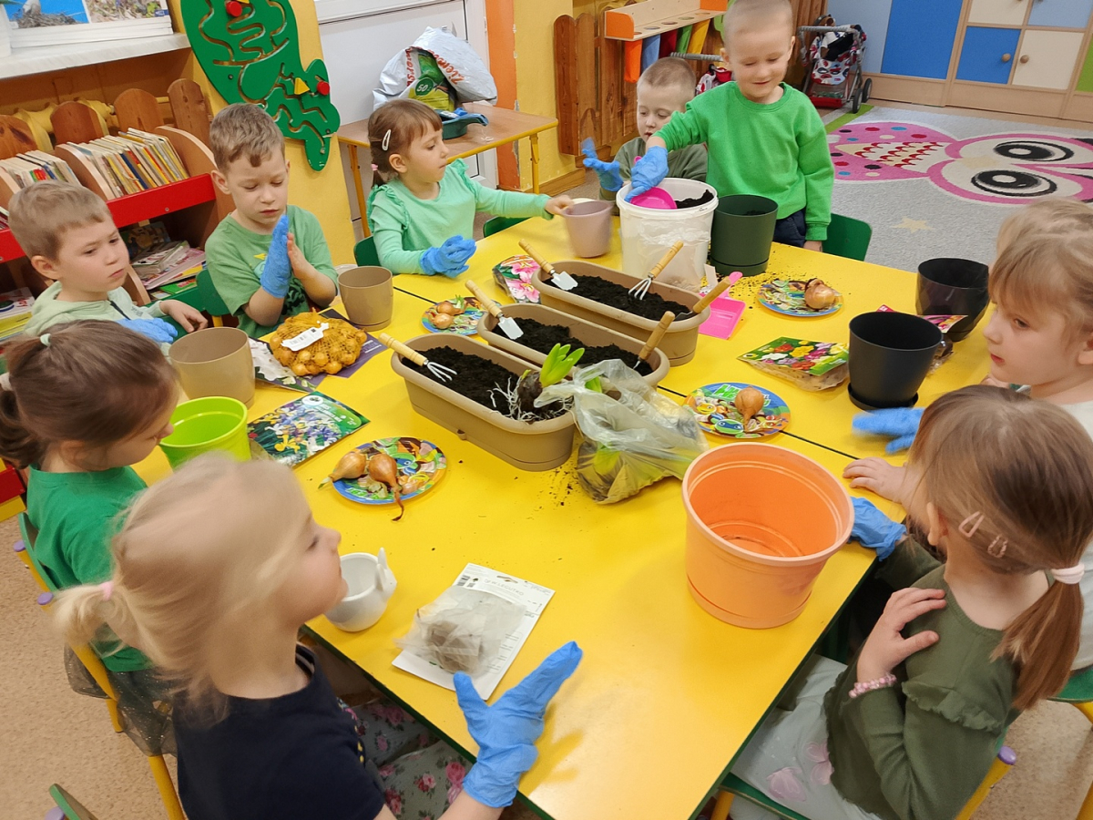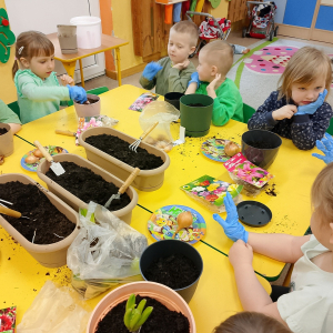 W naszej sali zalożyliśmy wiosenny ogródek. Dzieci chętnie uczestniczyły w sadzeniu cebulek kwiatowych. Dowiedziały się, co jest potrzebne do wzrostu roślin i jak trzeba o nie dbać. Codziennie prowadzą obserwacje efekty wspólnej pracy.