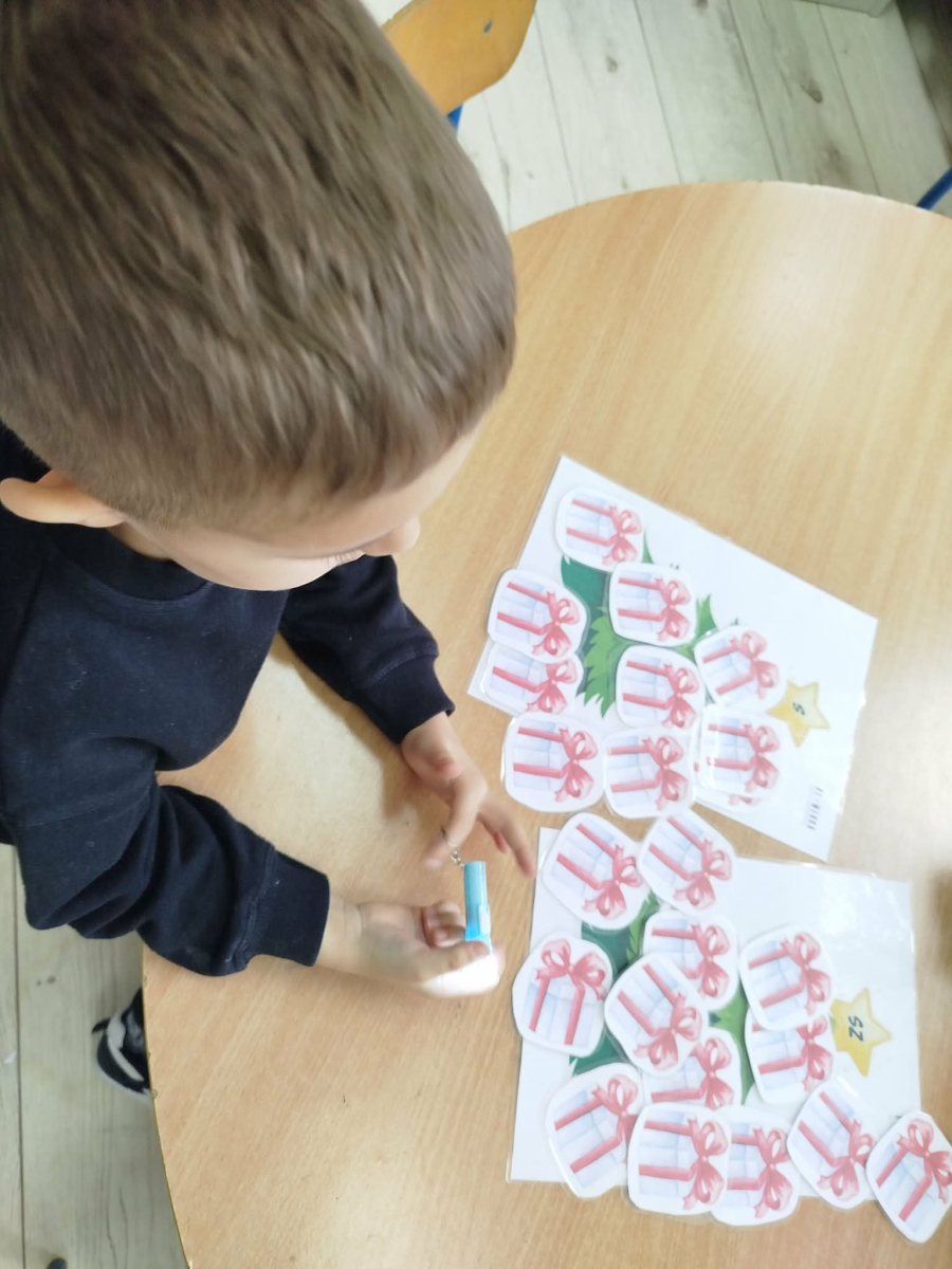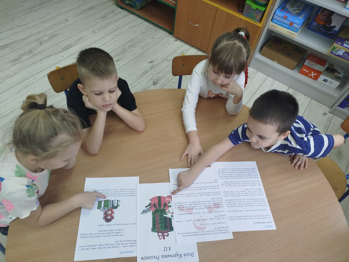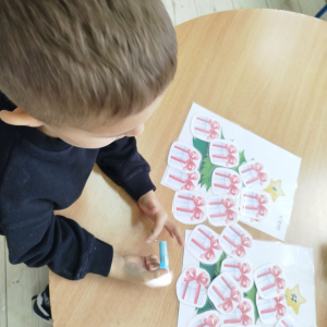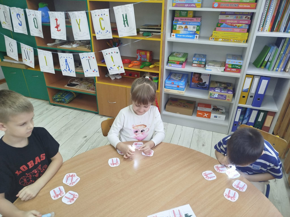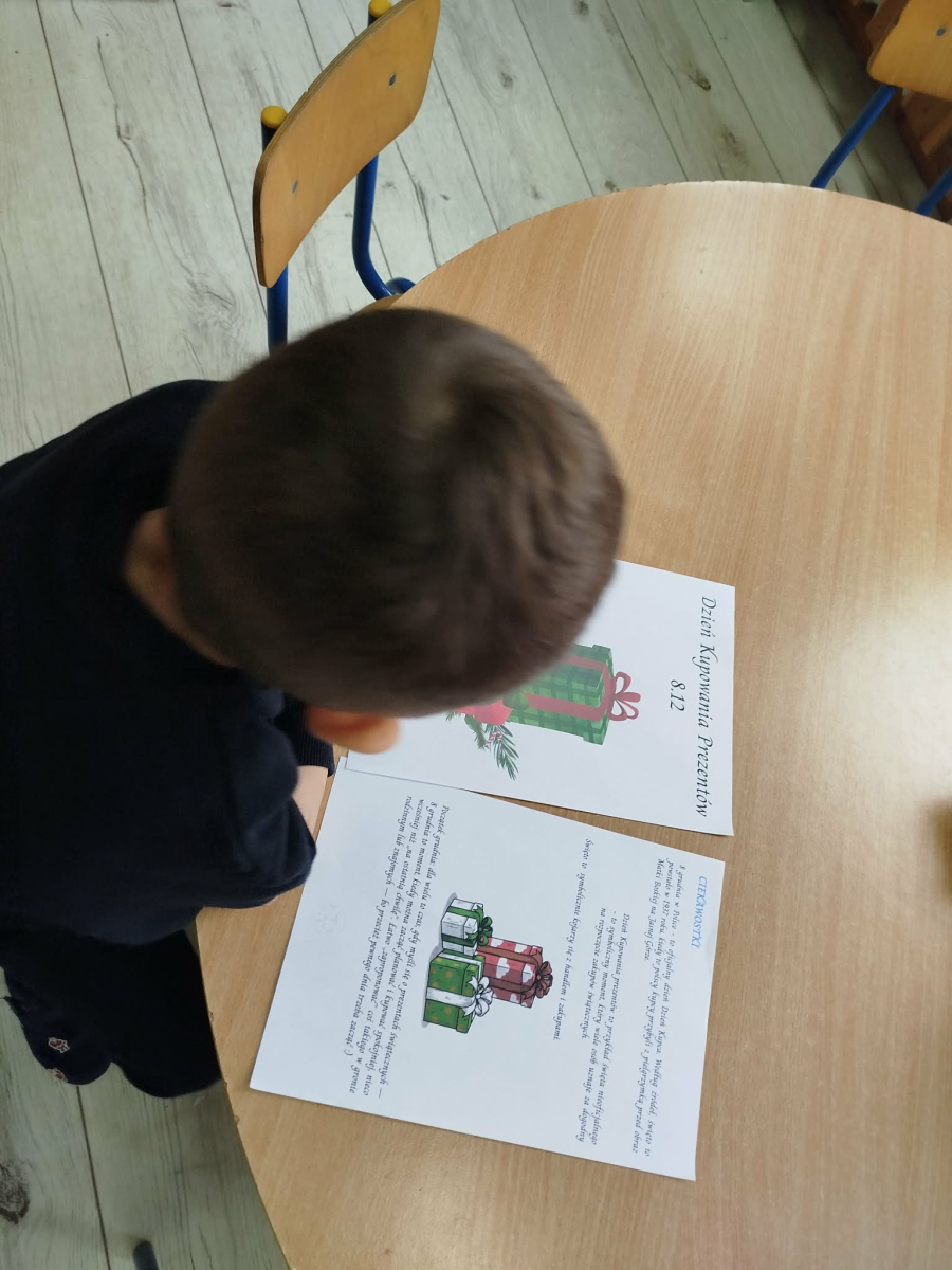 8 grudnia w „Logopedycznym Kalendarzu Świąt Nietypowych” był „Dzień Kupowania Prezentów”. Dzieci wysłuchały ciekawostek o tym święcie. Usprawniały swoje buzie z bajką logopedyczną. Kolejnym zadaniem były „Prezenty do podświetlenia” – mające na celu różnicowanie głosek sz/s w wyrazach.