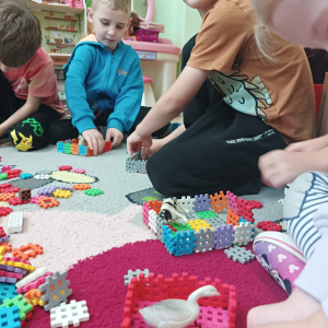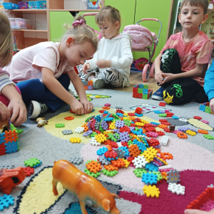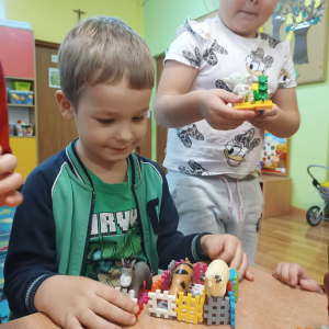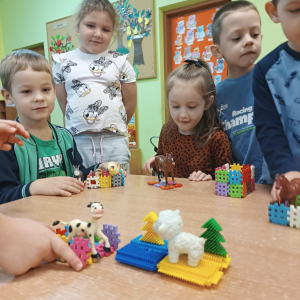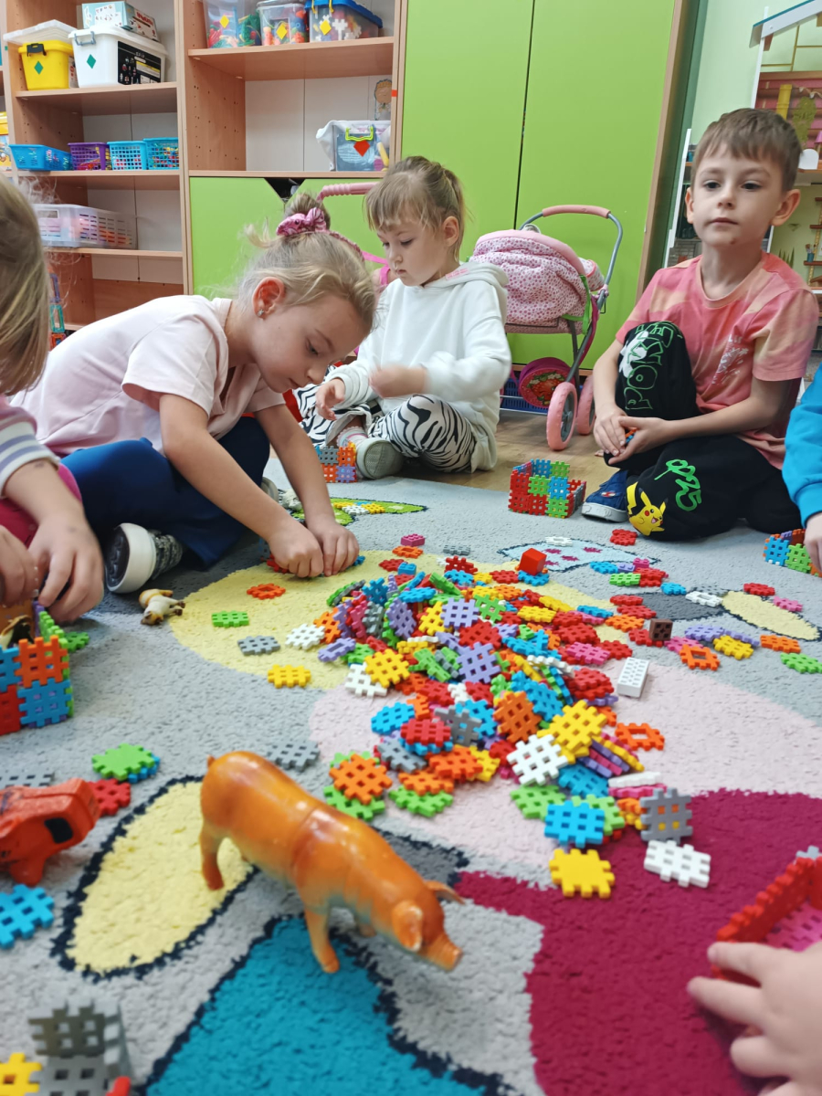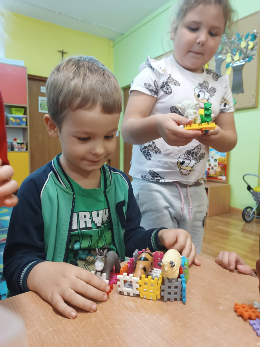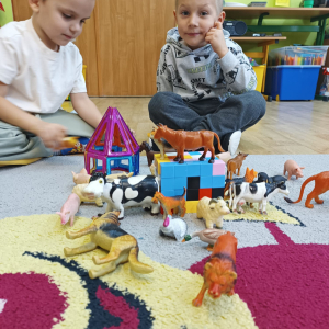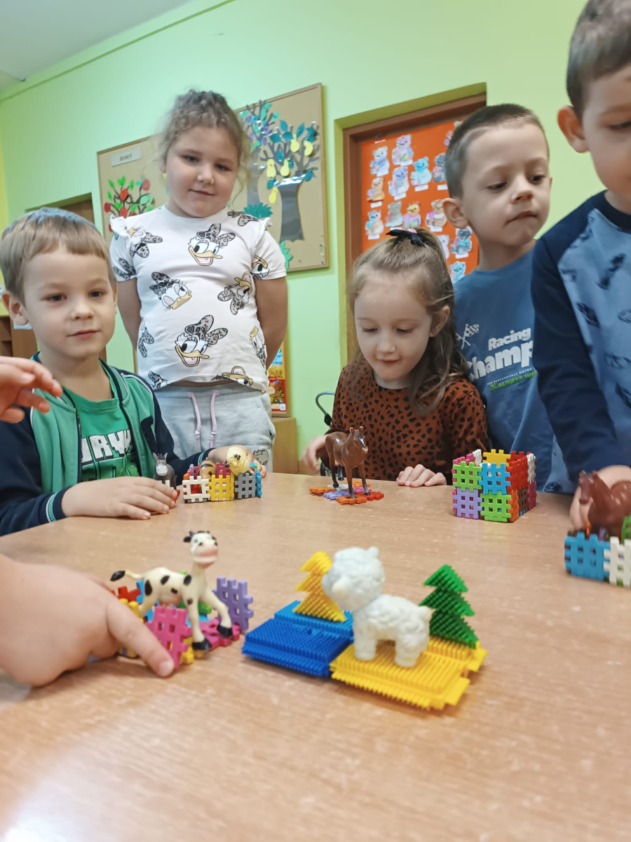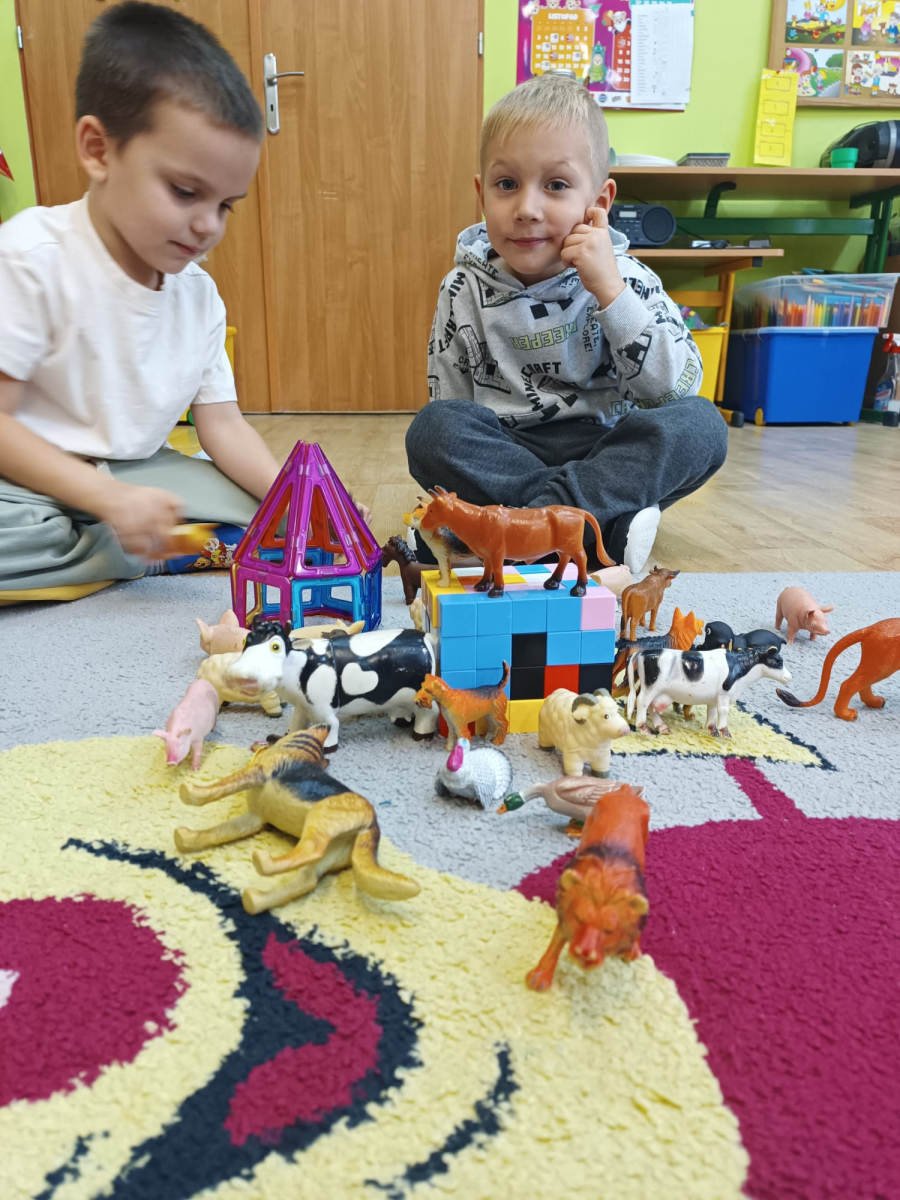 W październiku dzieci z Publicznego Przedszkola nr 2 z dużym zaangażowaniem uczestniczyły w zajęciach poświęconych poznawaniu świata zwierząt. Przedszkolaki uczyły się nazw zwierząt żyjących na farmie oraz w morzu, rozwijając przy tym swoje umiejętności językowe i poznawcze. Podczas różnorodnych aktywności dzieci układały i budowały farmy dla zwierząt, tworząc przestrzenie dla swoich ulubionych zwierzątek, nazywając je oraz podając ich nazwy w języku angielskim. Nie zabrakło również wspólnego śpiewania wesołych piosenek oraz licznych zabaw ruchowych, które w atrakcyjny sposób utrwalały poznawane nazwy zwierząt morskich i gospodarskich. Zajęcia dostarczyły dzieciom wiele radości, sprzyjały nauce poprzez zabawę oraz rozwijały wyobraźnię, kreatywność i współpracę w grupie.