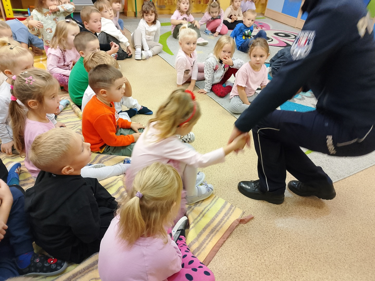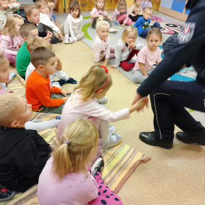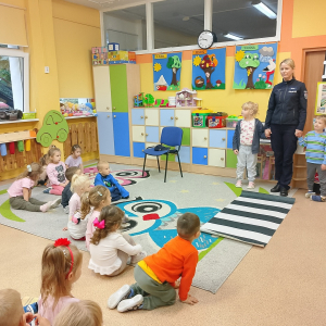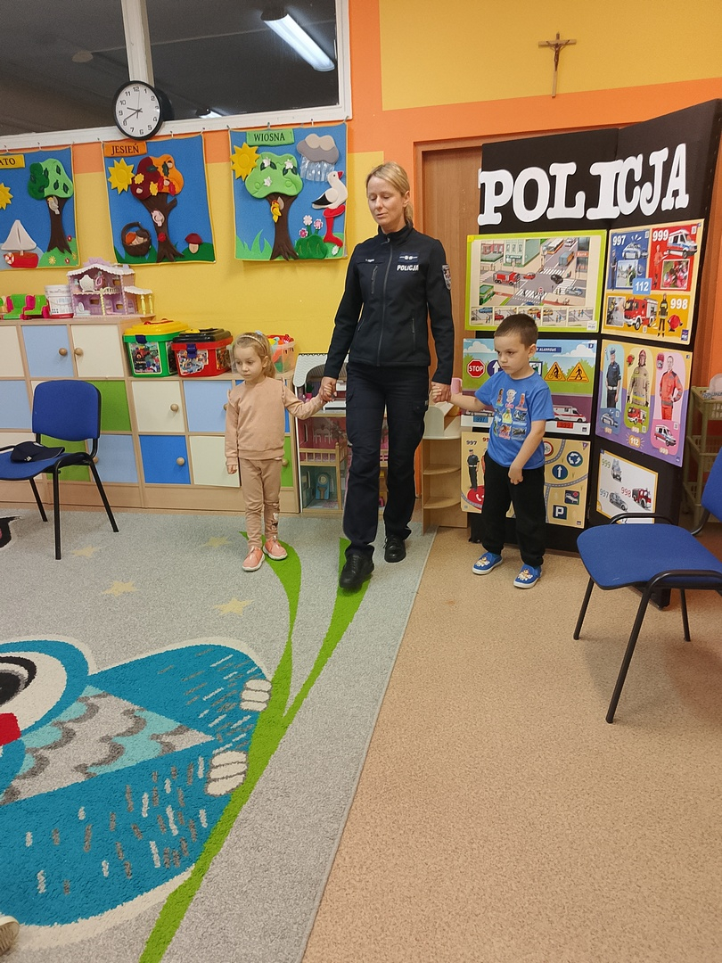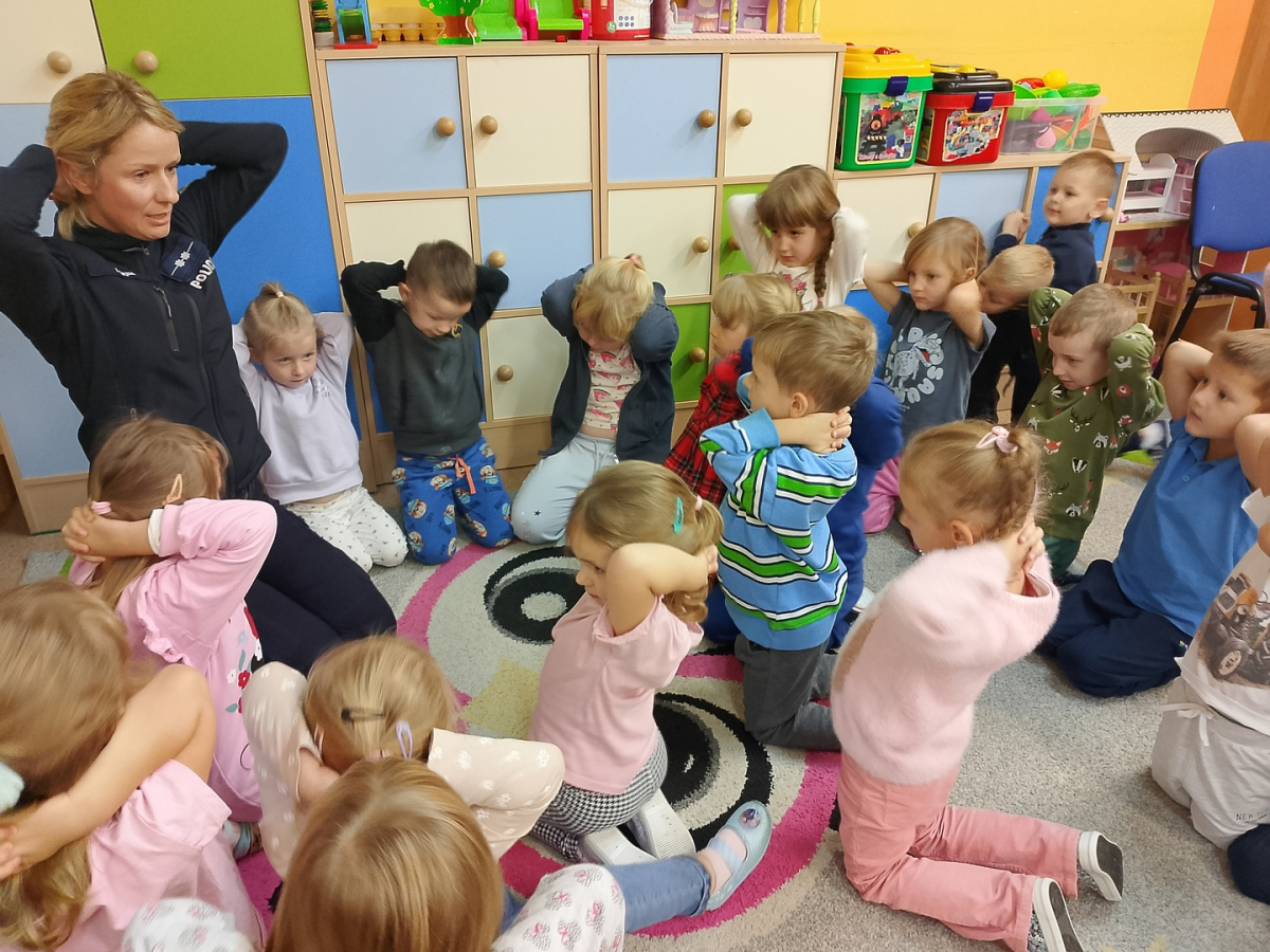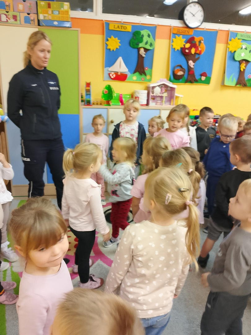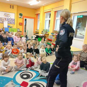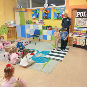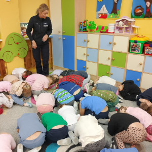 Pani policjantka w formie praktycznej przypomniała podstawowe zasady zachowania się podczas przechodzenia przez jezdnię. Wytłumaczyła jak należy zachować się w kontaktach z nieznajomymi, jak dbać o bezpieczeństwo własne i innych oraz do kogo zwracać się o pomoc w sytuacji zagrożenia. Dzieci nauczyły się bezpiecznej pozycji, gdy atakuje pies. Dzieci z dużym zainteresowaniem słuchały rad i wskazówek zaproszonego gościa