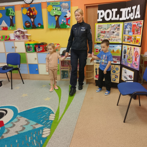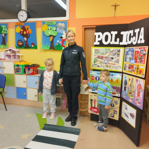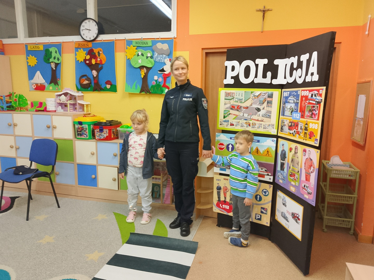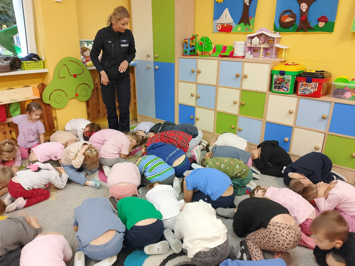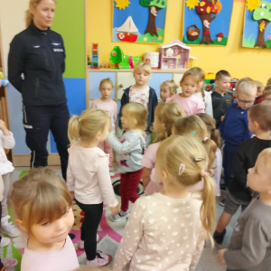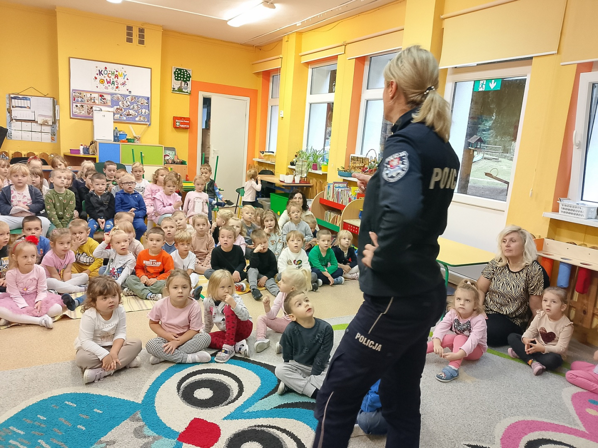 Pani policjantka w formie praktycznej przypomniała podstawowe zasady zachowania się podczas przechodzenia przez jezdnię. Wytłumaczyła jak należy zachować się w kontaktach z nieznajomymi, jak dbać o bezpieczeństwo własne i innych oraz do kogo zwracać się o pomoc w sytuacji zagrożenia. Dzieci nauczyły się bezpiecznej pozycji, gdy atakuje pies. Dzieci z dużym zainteresowaniem słuchały rad i wskazówek zaproszonego gościa