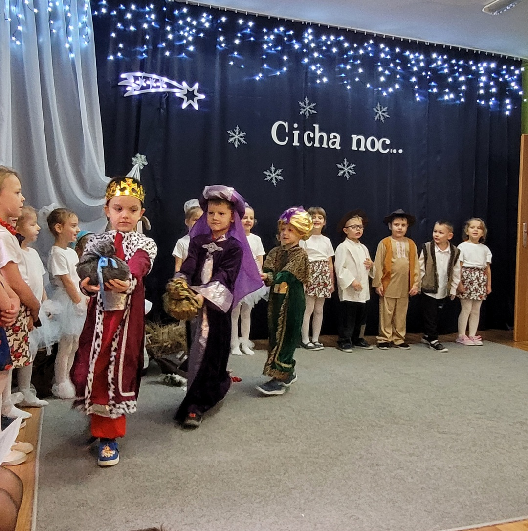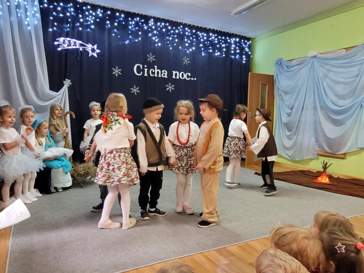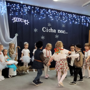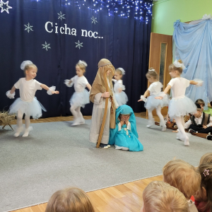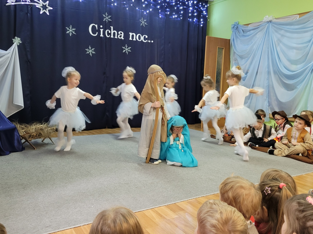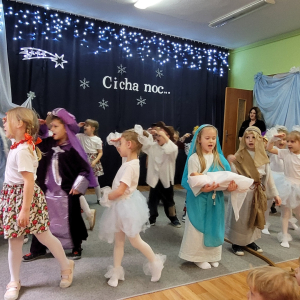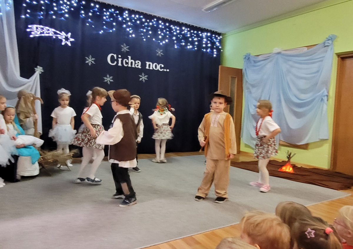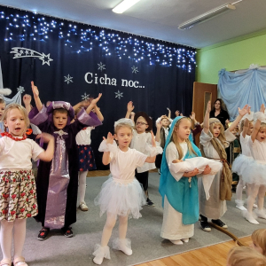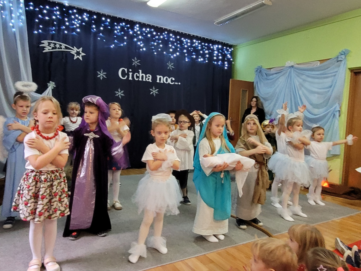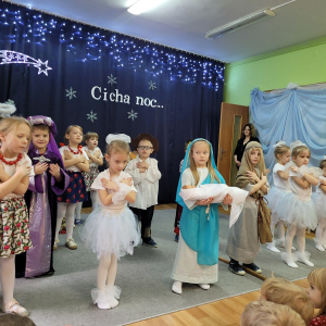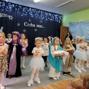 "...Do stajenki, do stajenki, gdzie leży Maleńki...." rozbrzmiewało w naszym przedszkolu, gdy grupa 5 - latków wystawiała jasełka. Dzieci z wielkim zaangażowaniem tańczyły, śpiewały kolędy i w pięknym, dziecięcym stylu przedstawiały bożonarodzeniowe sceny. Ten występ, to Świąteczne Życzenia od grupy Żabki dla rodziców, młodszych kolegów i zaproszonych gości. Zdrowych i Spokojnych Świąt Bożego Narodzenia .