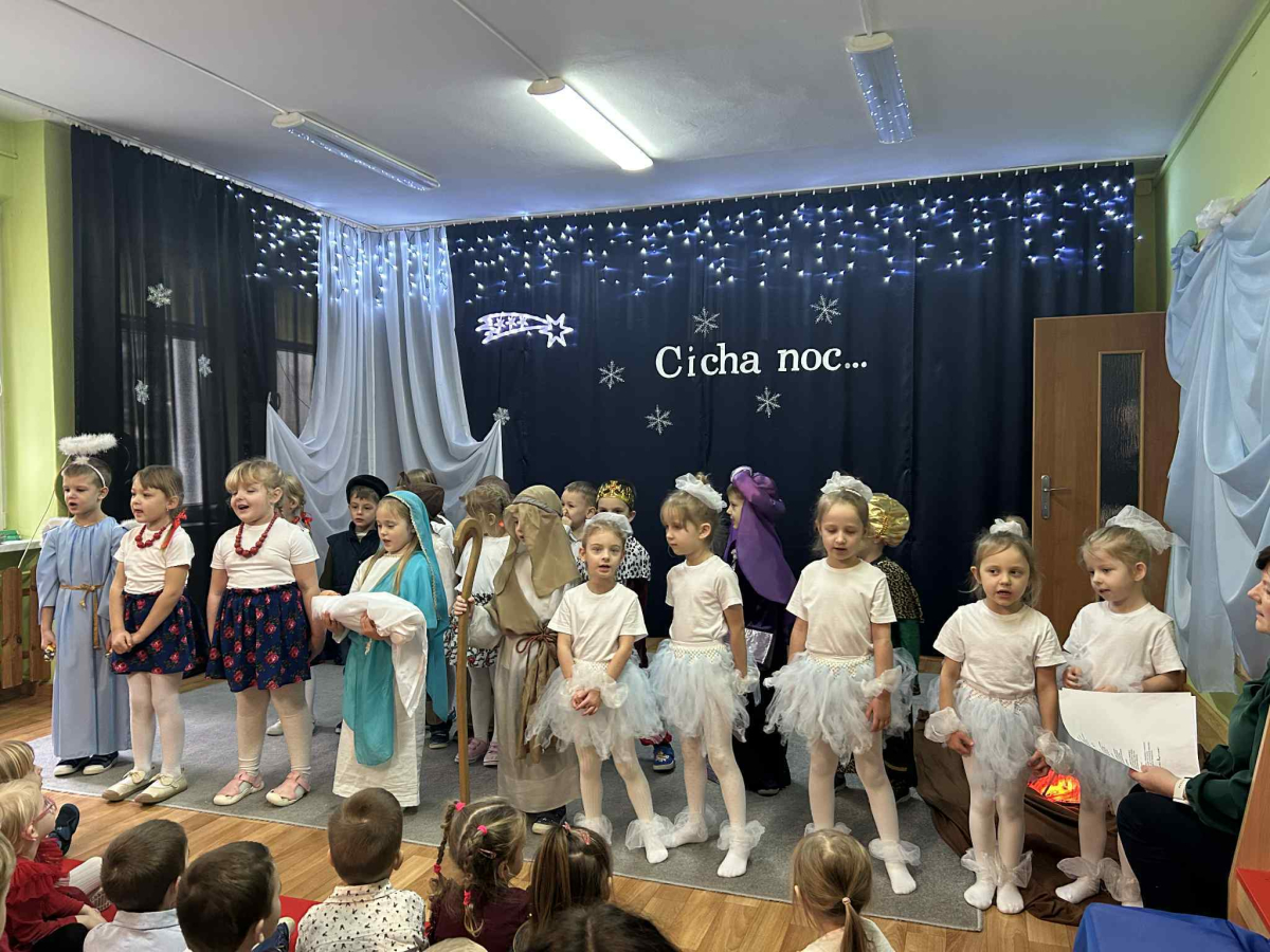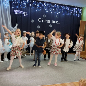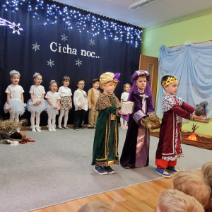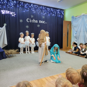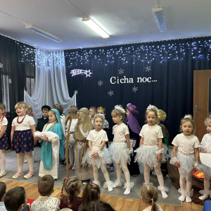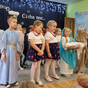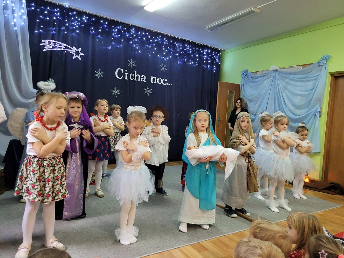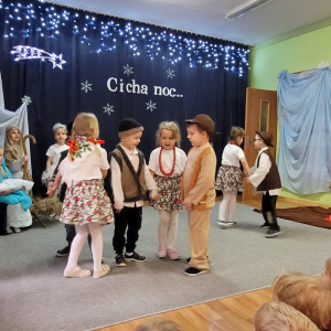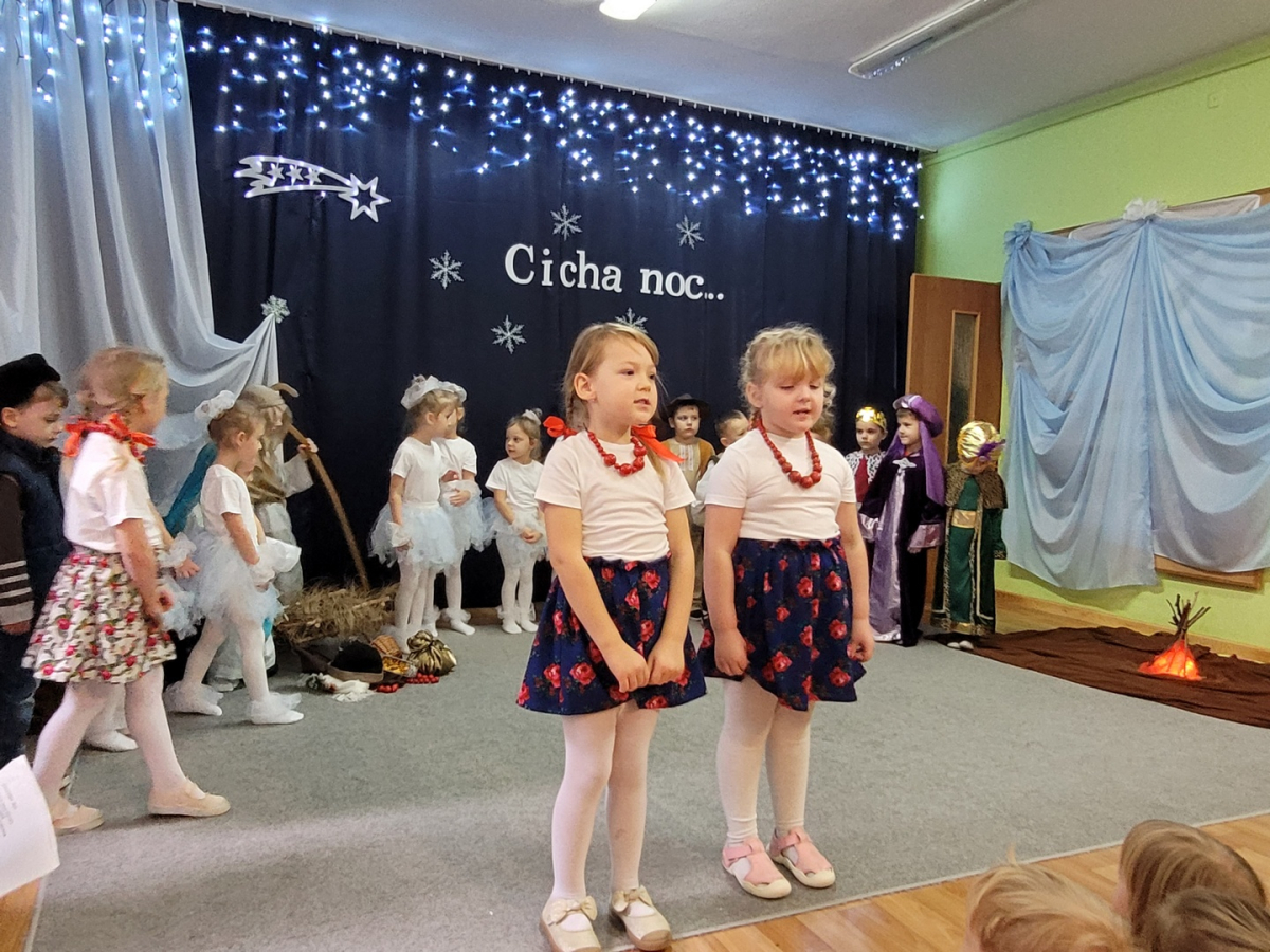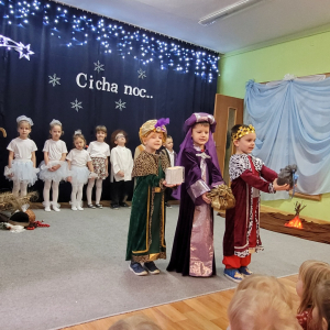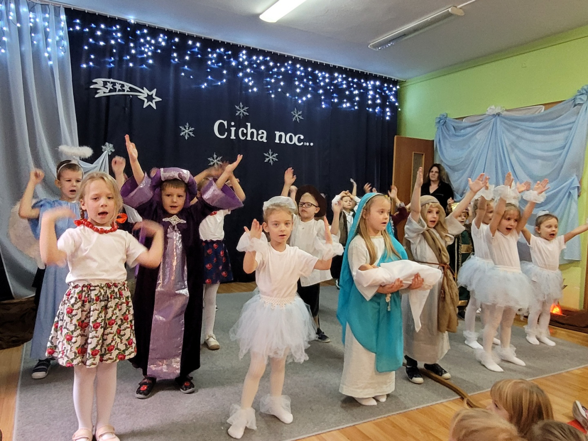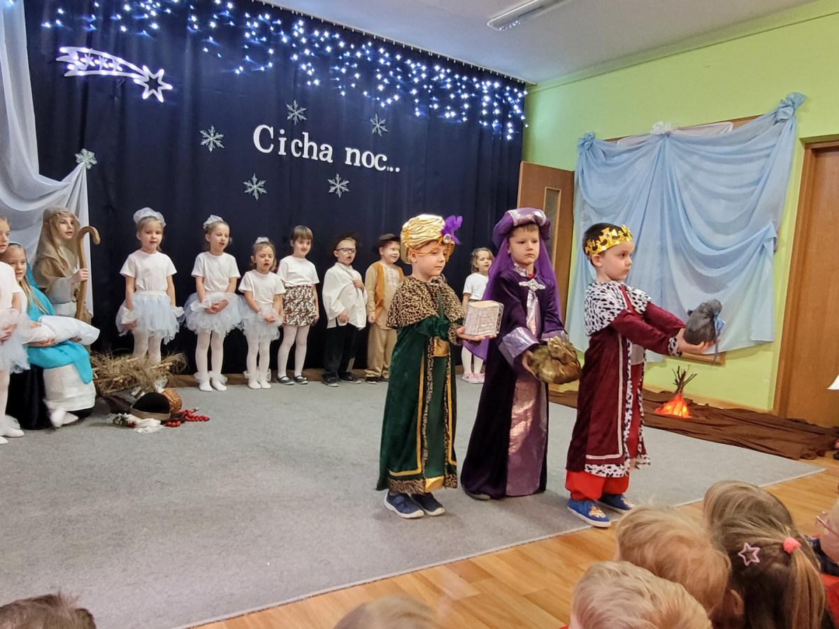 "...Do stajenki, do stajenki, gdzie leży Maleńki...." rozbrzmiewało w naszym przedszkolu, gdy grupa 5 - latków wystawiała jasełka. Dzieci z wielkim zaangażowaniem tańczyły, śpiewały kolędy i w pięknym, dziecięcym stylu przedstawiały bożonarodzeniowe sceny. Ten występ, to Świąteczne Życzenia od grupy Żabki dla rodziców, młodszych kolegów i zaproszonych gości. Zdrowych i Spokojnych Świąt Bożego Narodzenia .