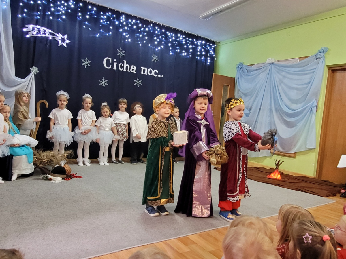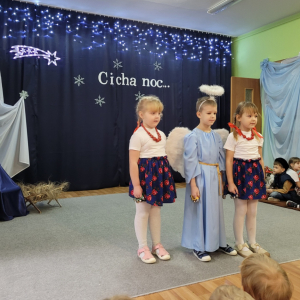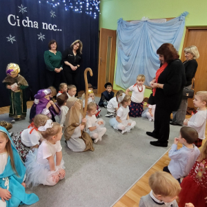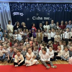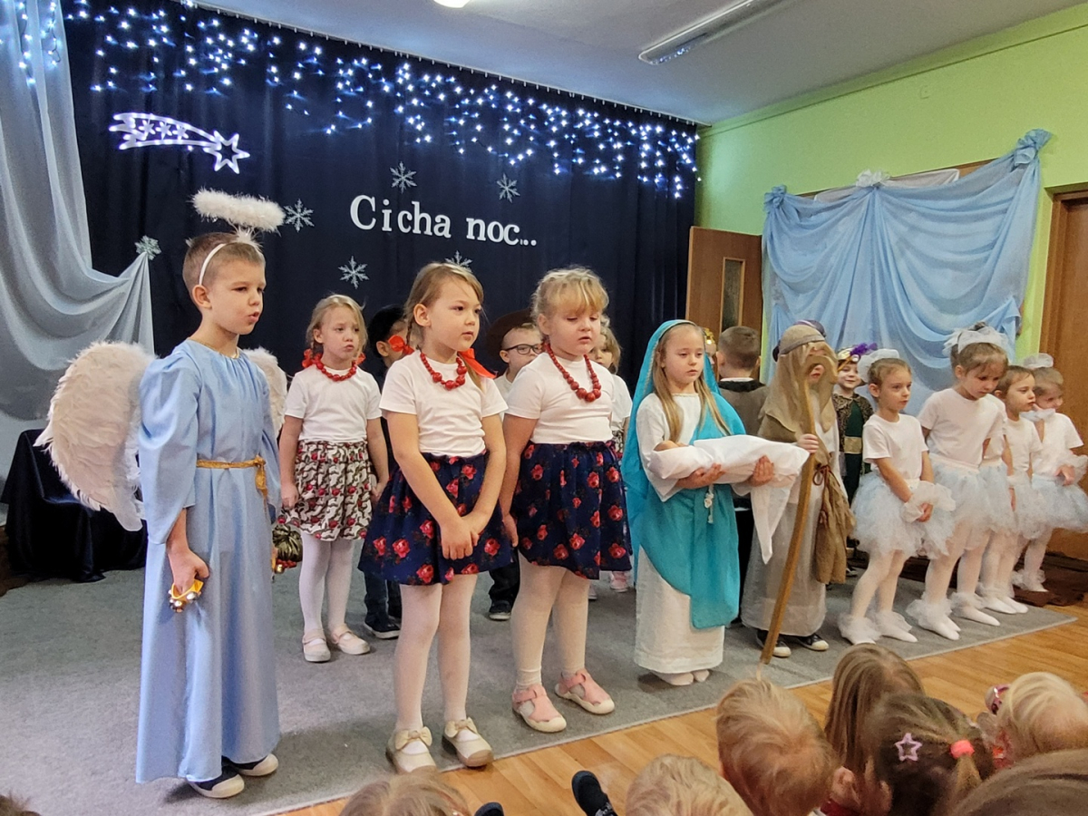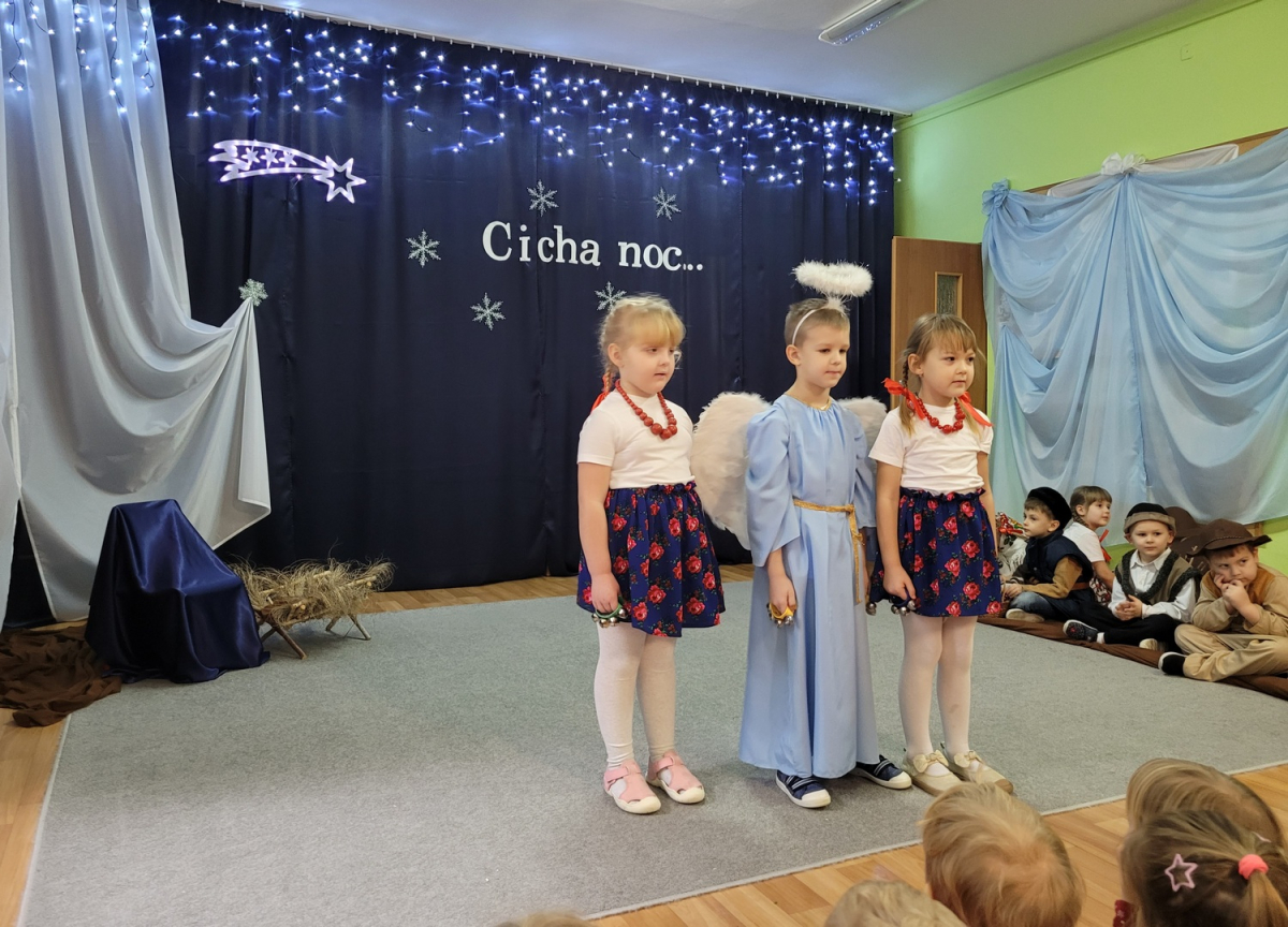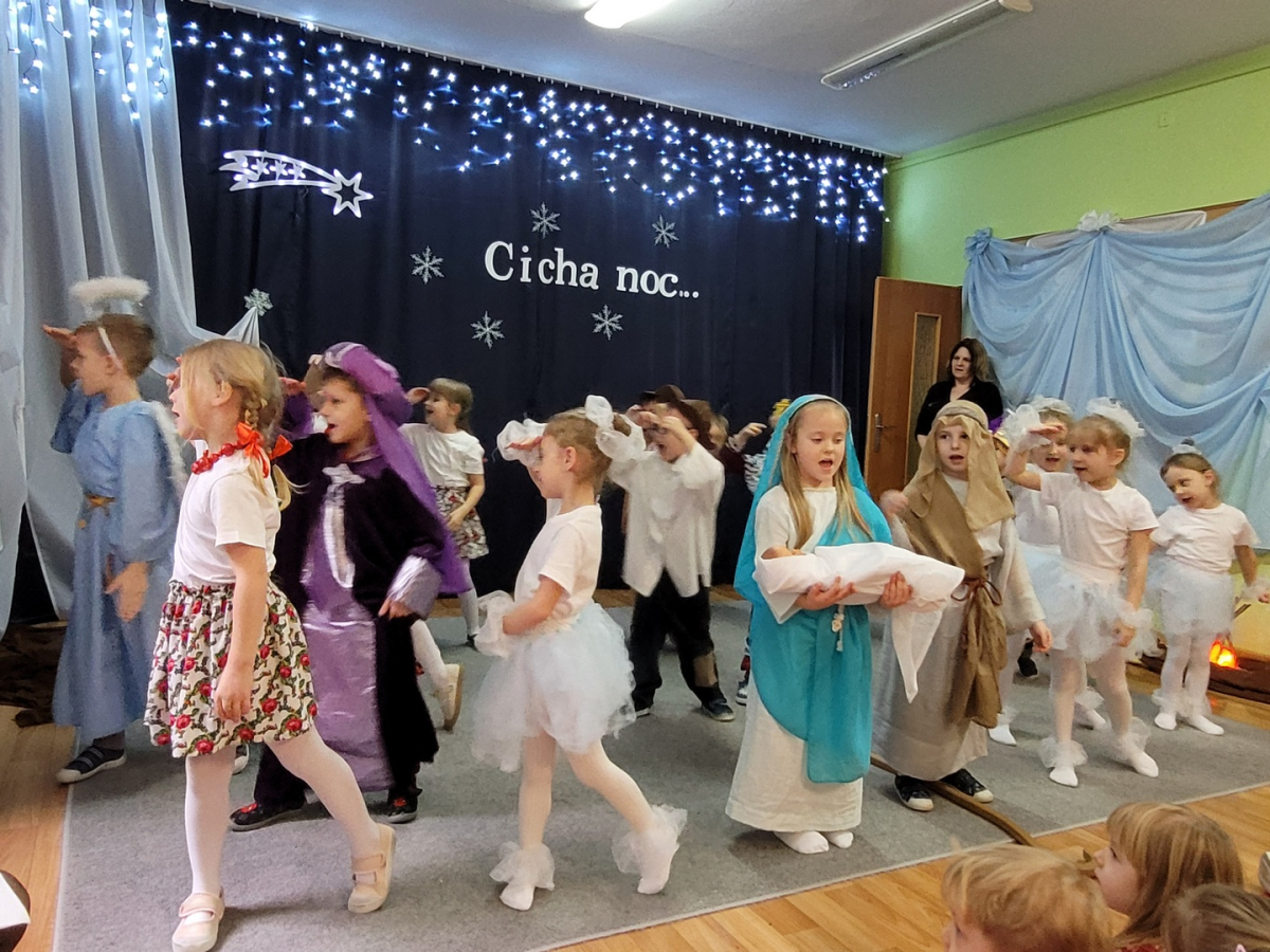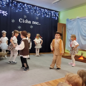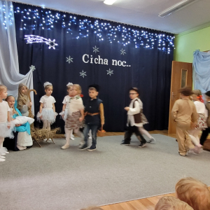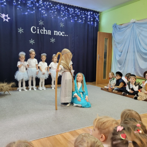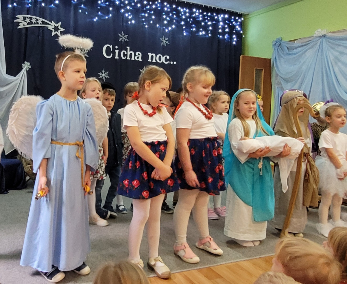 "...Do stajenki, do stajenki, gdzie leży Maleńki...." rozbrzmiewało w naszym przedszkolu, gdy grupa 5 - latków wystawiała jasełka. Dzieci z wielkim zaangażowaniem tańczyły, śpiewały kolędy i w pięknym, dziecięcym stylu przedstawiały bożonarodzeniowe sceny. Ten występ, to Świąteczne Życzenia od grupy Żabki dla rodziców, młodszych kolegów i zaproszonych gości. Zdrowych i Spokojnych Świąt Bożego Narodzenia .
