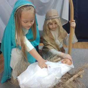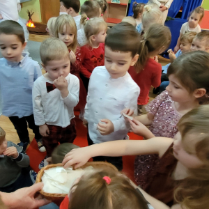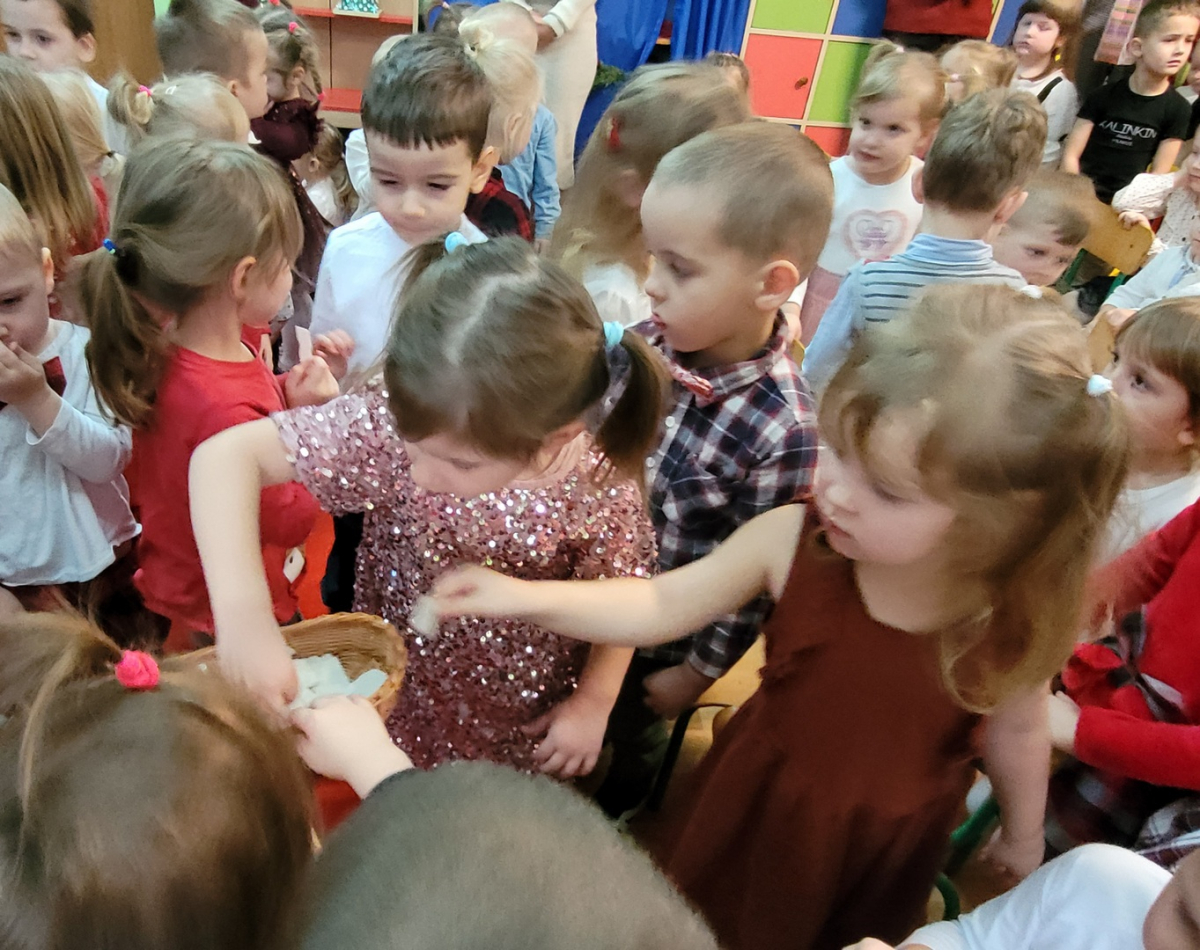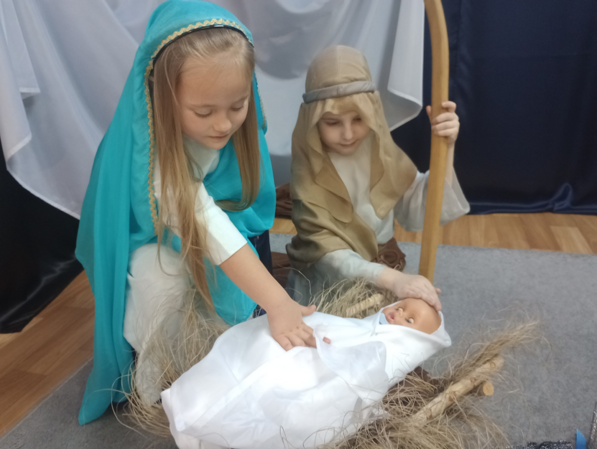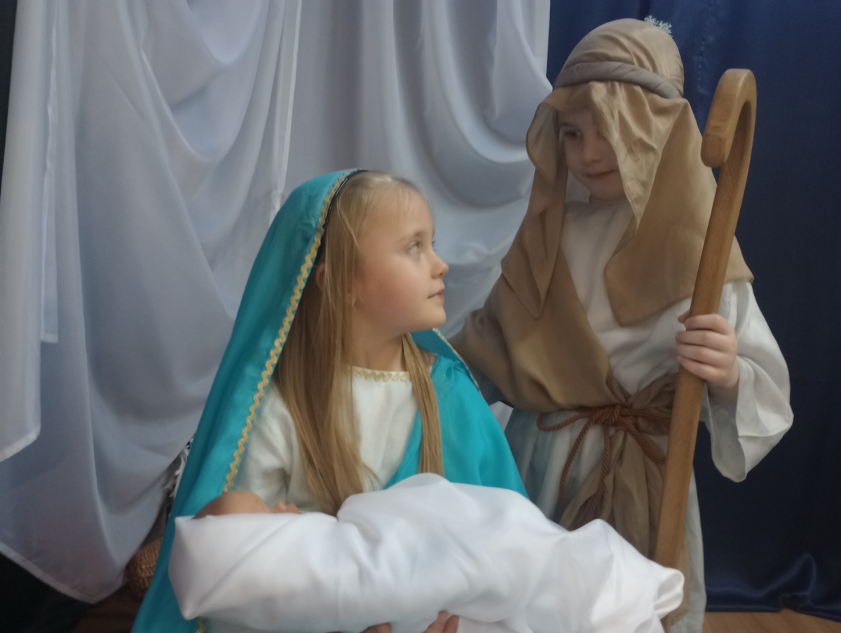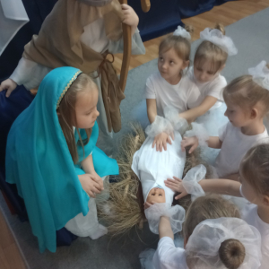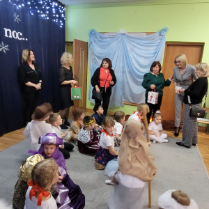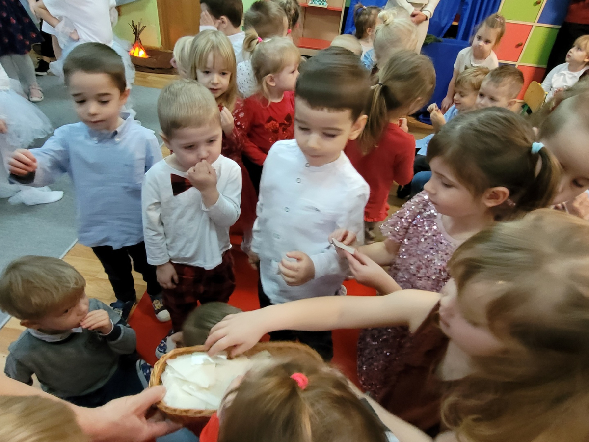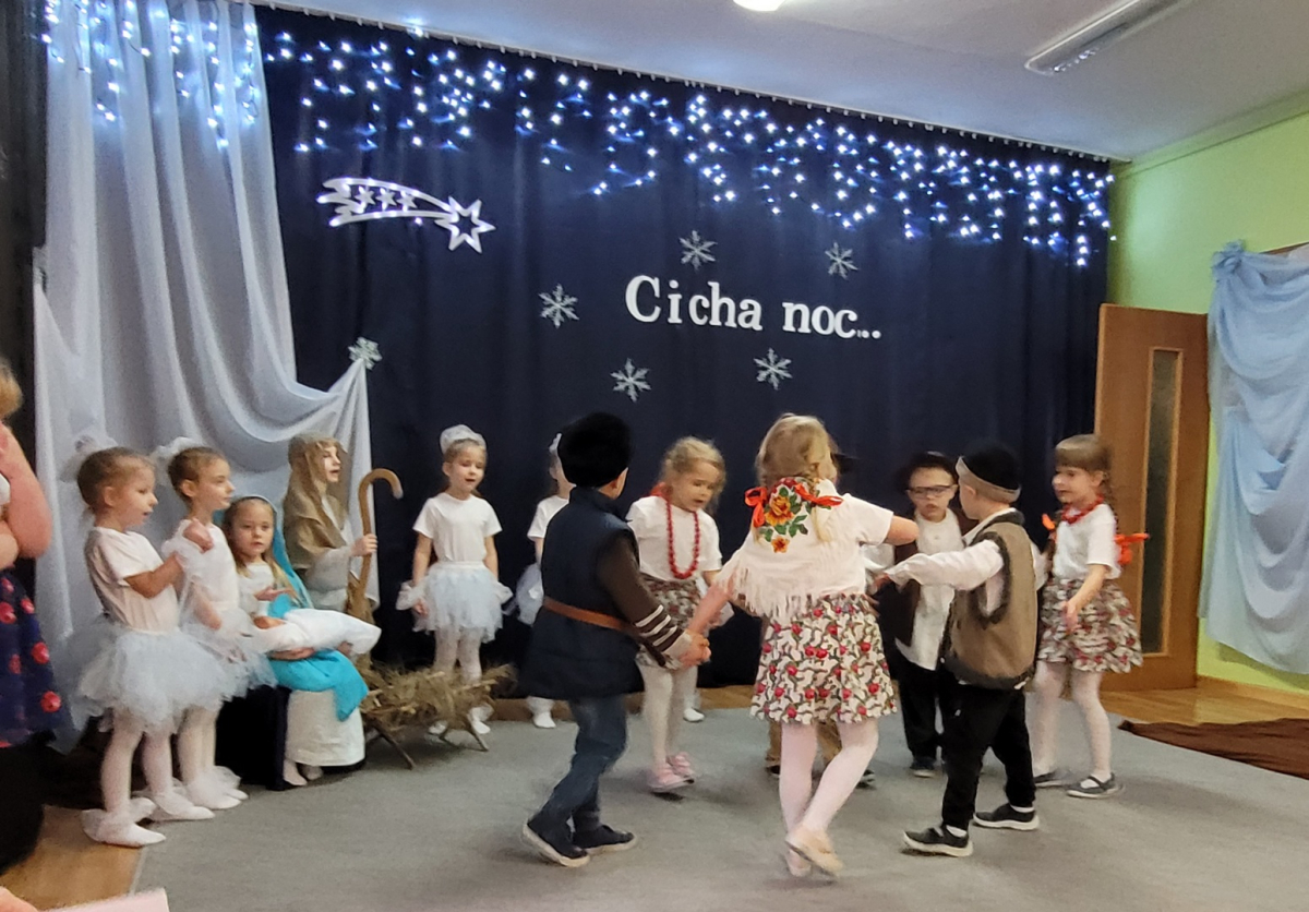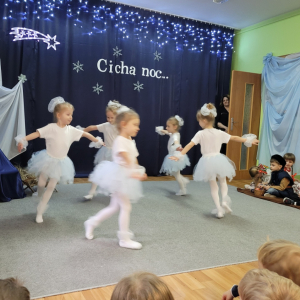 "...Do stajenki, do stajenki, gdzie leży Maleńki...." rozbrzmiewało w naszym przedszkolu, gdy grupa 5 - latków wystawiała jasełka. Dzieci z wielkim zaangażowaniem tańczyły, śpiewały kolędy i w pięknym, dziecięcym stylu przedstawiały bożonarodzeniowe sceny. Ten występ, to Świąteczne Życzenia od grupy Żabki dla rodziców, młodszych kolegów i zaproszonych gości. Zdrowych i Spokojnych Świąt Bożego Narodzenia .