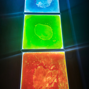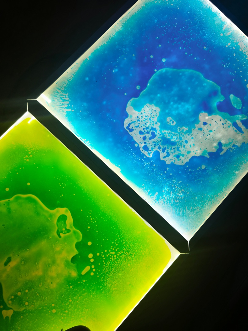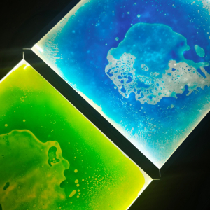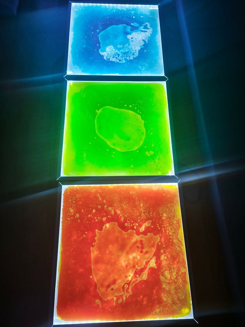 5. Strefa manipulacji i aktywności stolikowych. Jasne stoły świetlne, płynne klepsydry, drobne świecące przedmioty – to narzędzia do ćwiczeń motoryki małej, koordynacji i skupienia.