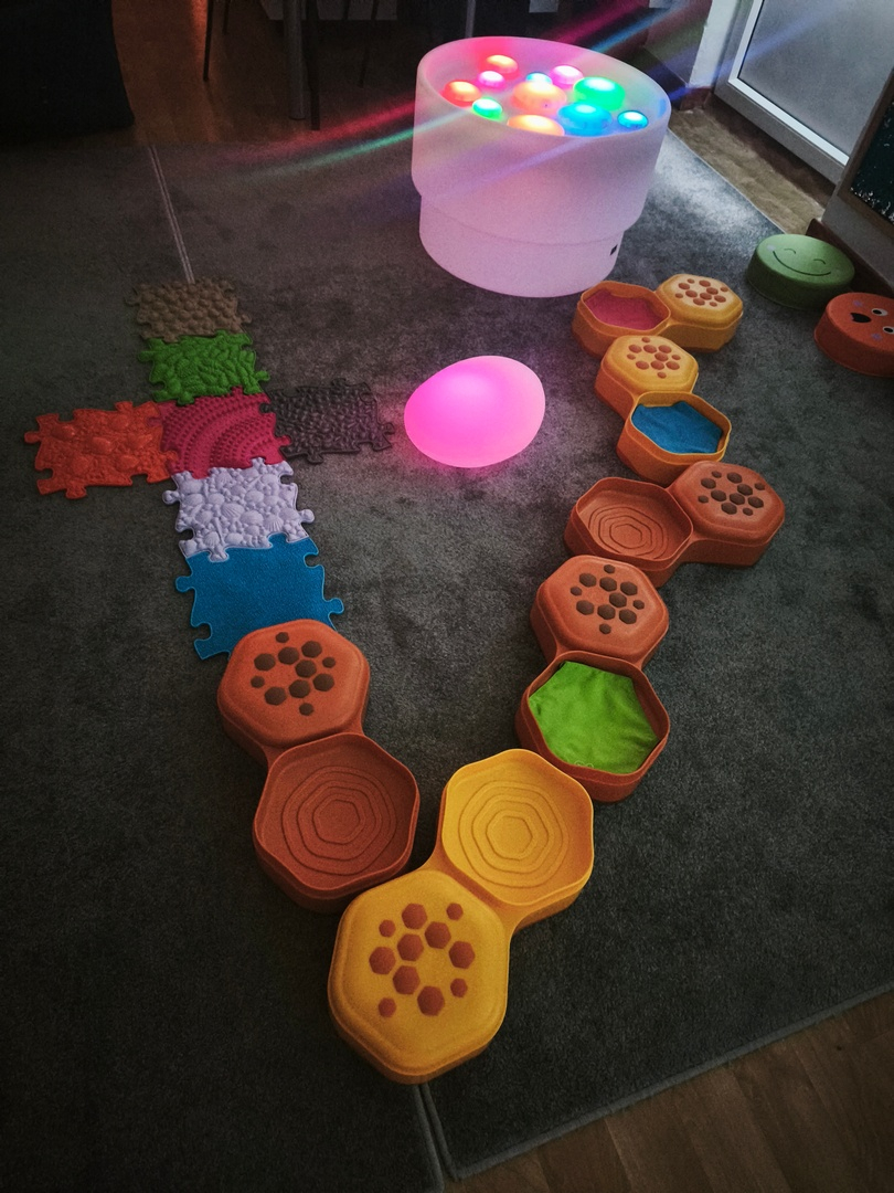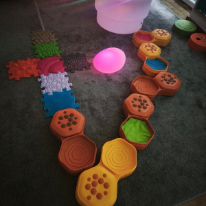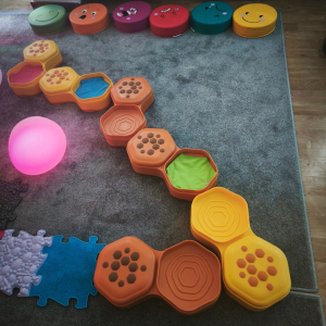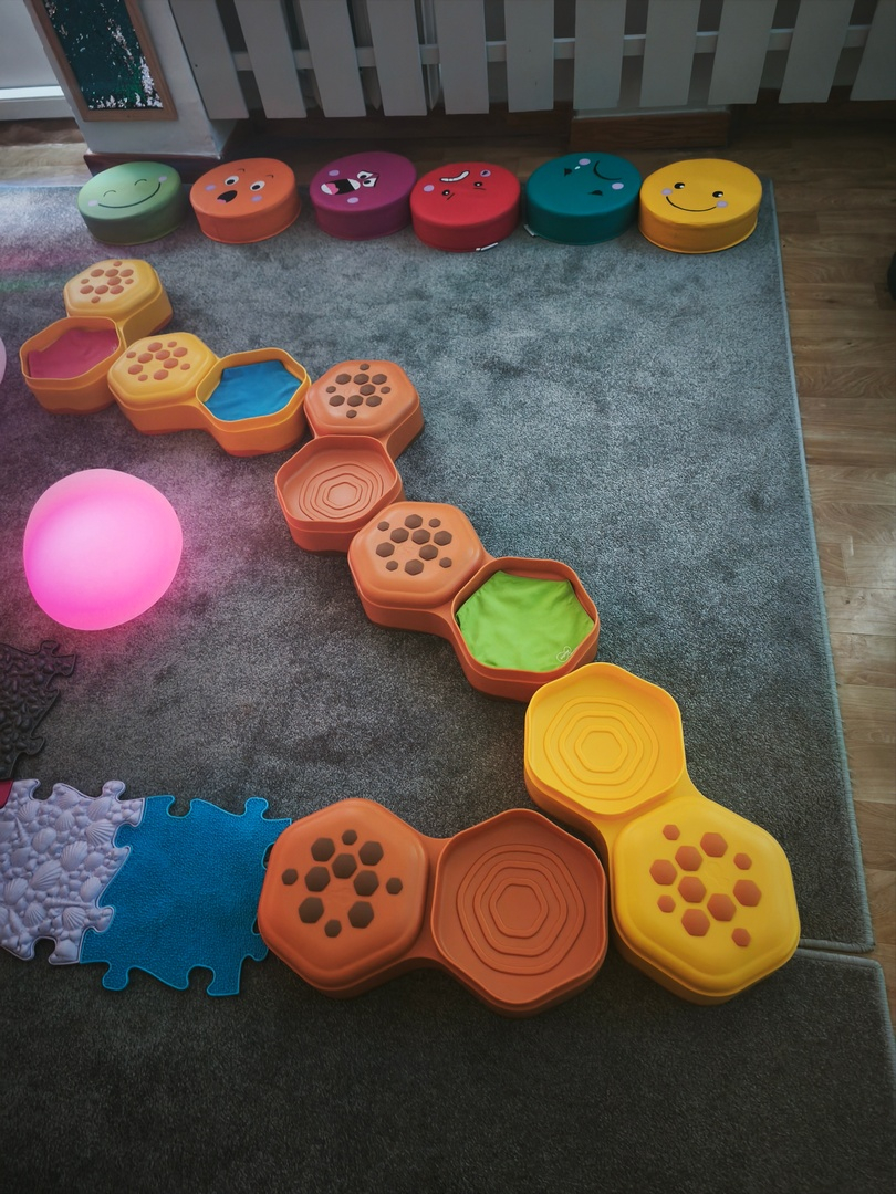 4. Strefa dotykowa i proprioceptywna. Kolorowe maty o różnych fakturach, sensoryczne ścieżki, płytki o zróżnicowanej strukturze oraz przedmioty do ściskania