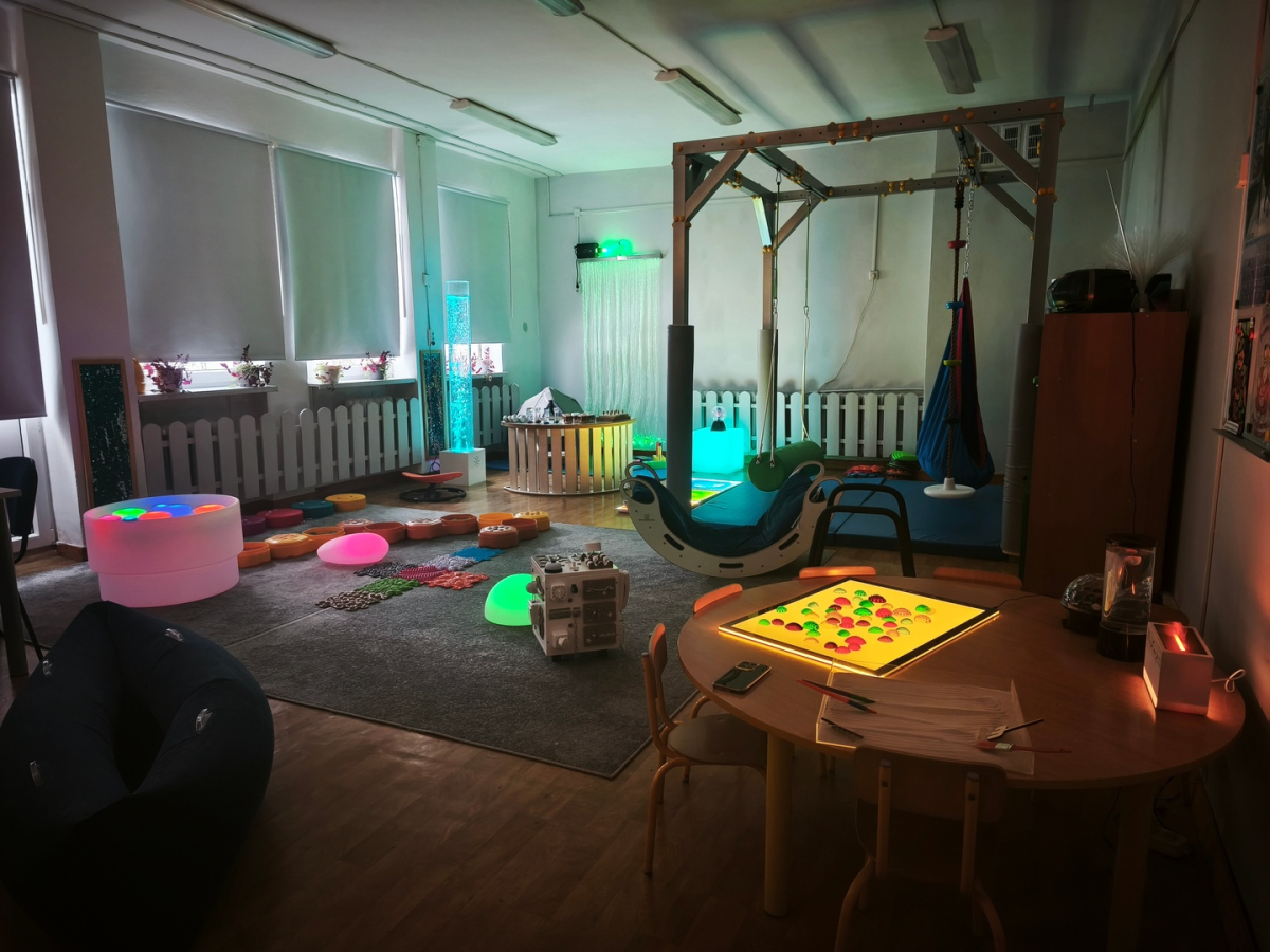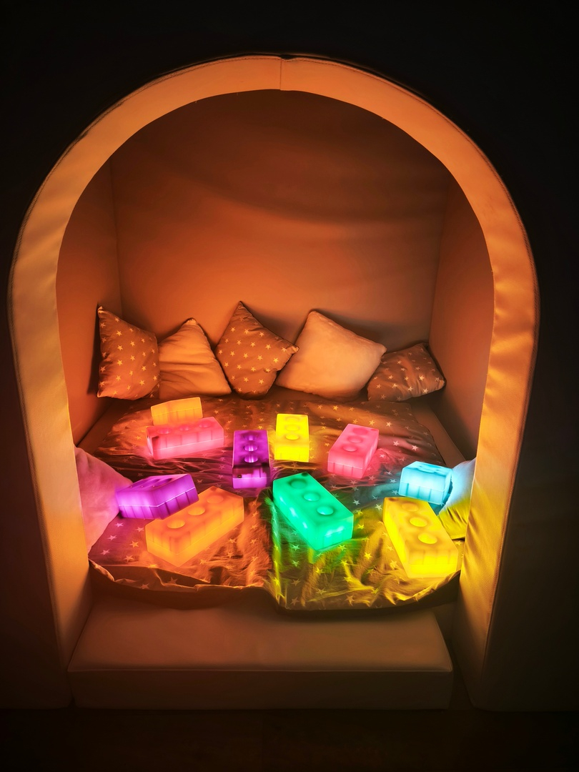 1. Strefa wyciszenia i relaksu. Miękkie, obite wnęki z poduszkami oraz delikatne oświetlenie. To miejsce, w którym dziecko może odpocząć, wyciszyć się lub skupić na bodźcach świetlnych, takich jak świecące klocki, czy kolumny wodne z bąbelkami.