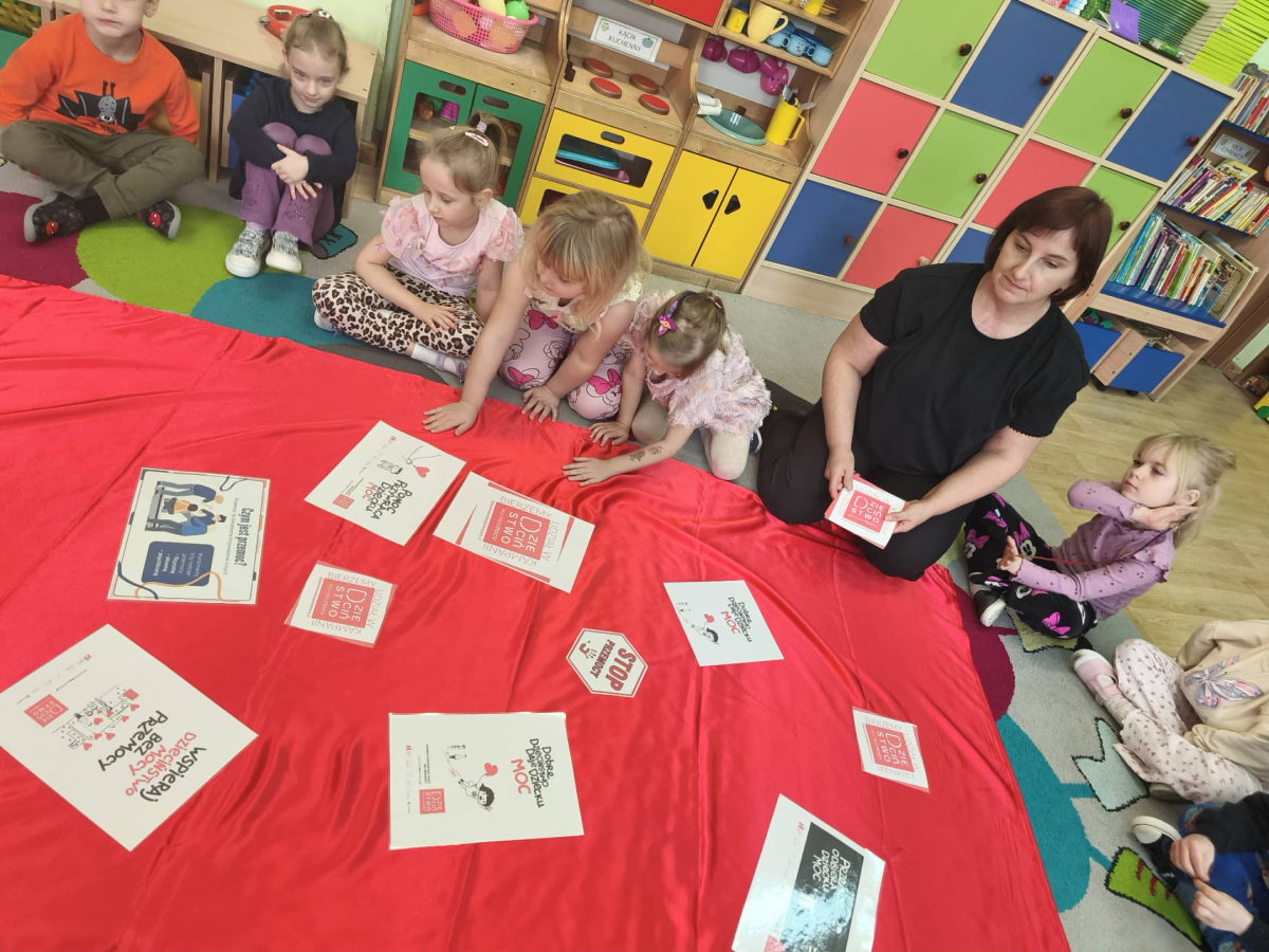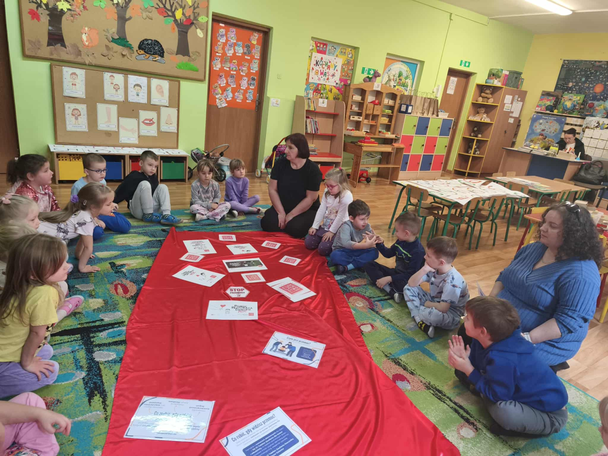 W przedszkolu podjęliśmy inicjatywę edukacyjną, której celem było uwrażliwienie na problem przemocy wobec dzieci, zwiększenie wiedzy o problemie, umiejętności unikania zagrożeń, szukania pomocy, czy reagowania na przemoc. Dzieci podczas zajęć odróżniały dobre zachowania od krzywdzących, dowiedziały się, czym jest przemoc, wysłuchały historyjek terapeutycznych związanych z emocjami, następnie opowiadały, jakie zachowanie wobec dzieci jest przedstawione na ilustracjach. Przedszkolaki wykazały się empatią, zrozumieniem i z wielkim zaangażowaniem uczestniczyły w zajęciach ze specjalistami.