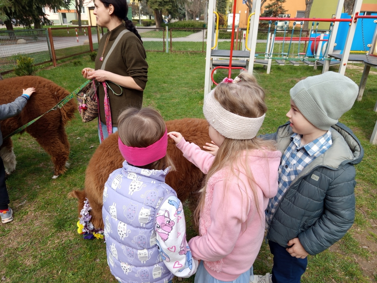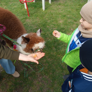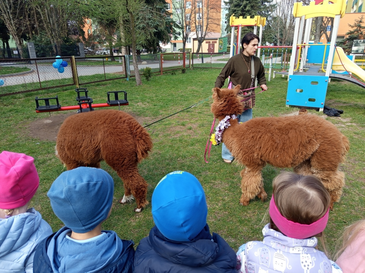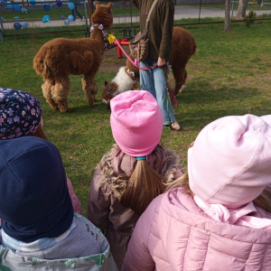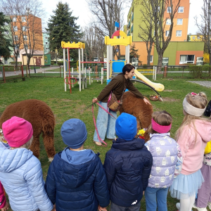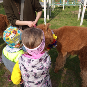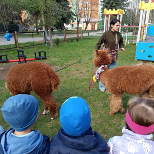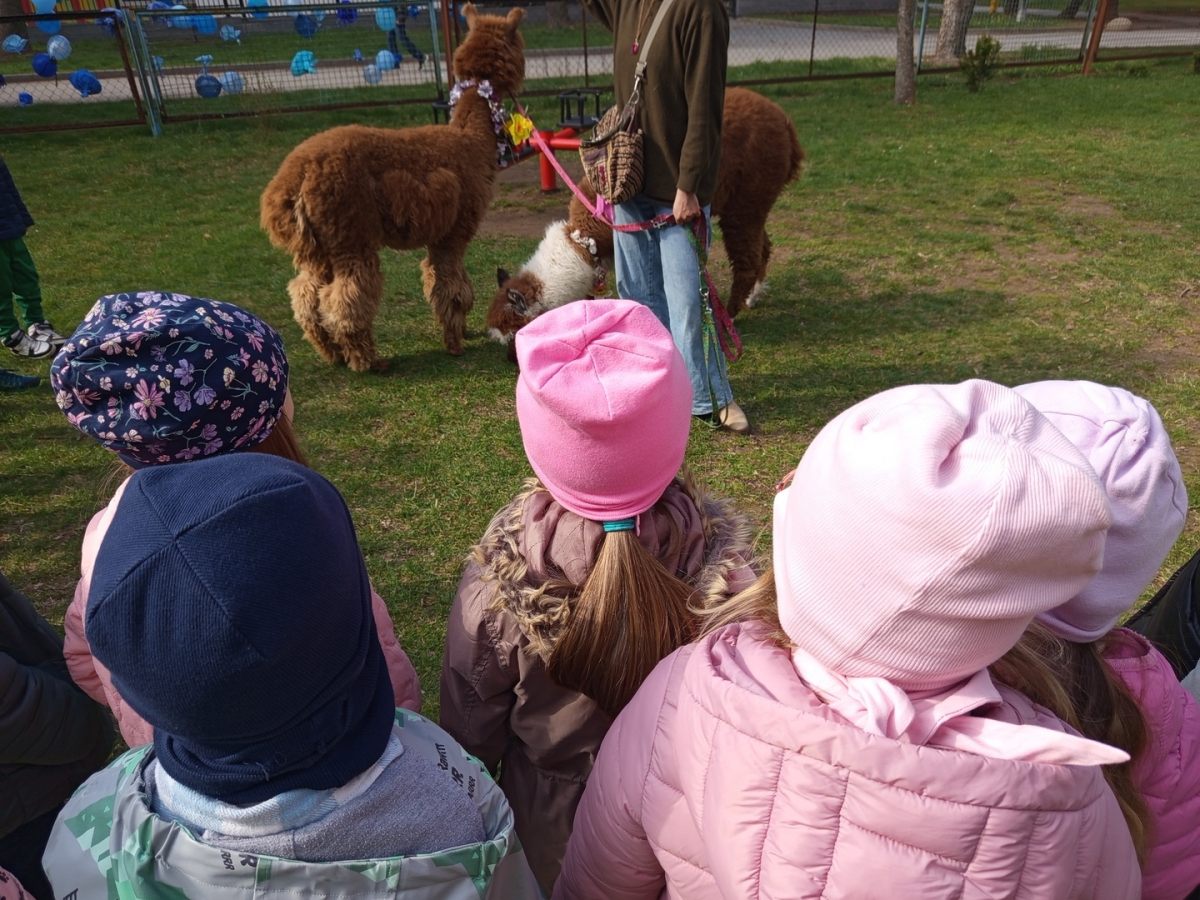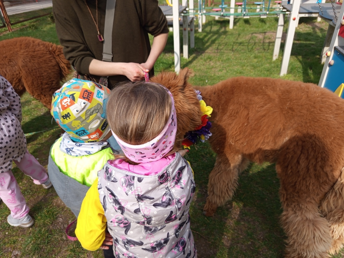 W tym tygodniu w ogrodzie przedszkolnym odbyły się zajęcia edukacyjne z alpakami. Alpaki, to zwierzęta o bardzo łagodnym usposobieniu. Są płochliwe i delikatne, zupełnie pozbawione agresji. Szczególnie pozytywnie nastawione są do dzieci. Głaskanie i przytulanie alpak pomaga dzieciom rozluźnić się i otworzyć. Wszystkie przedszkolaki były zachwycone. Podczas zajęć z alpakoterapii dzieci z radością karmiły alpaki marchewkami, przytulały je a także pozowały do zdjęć.