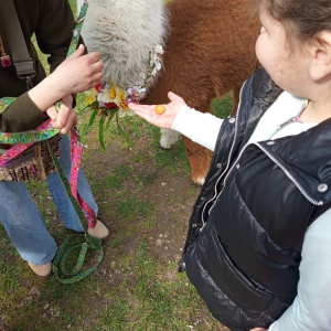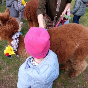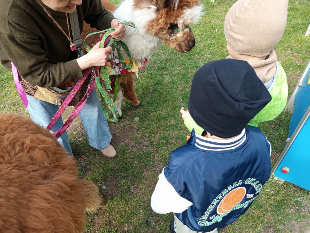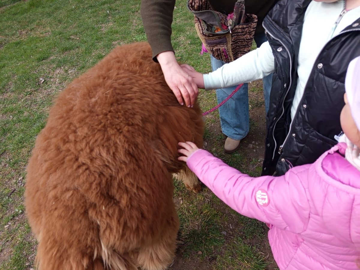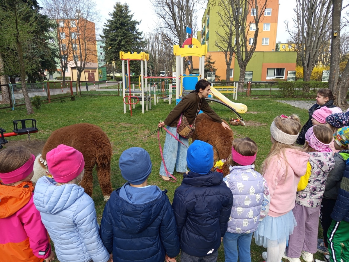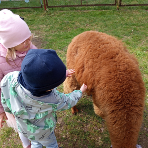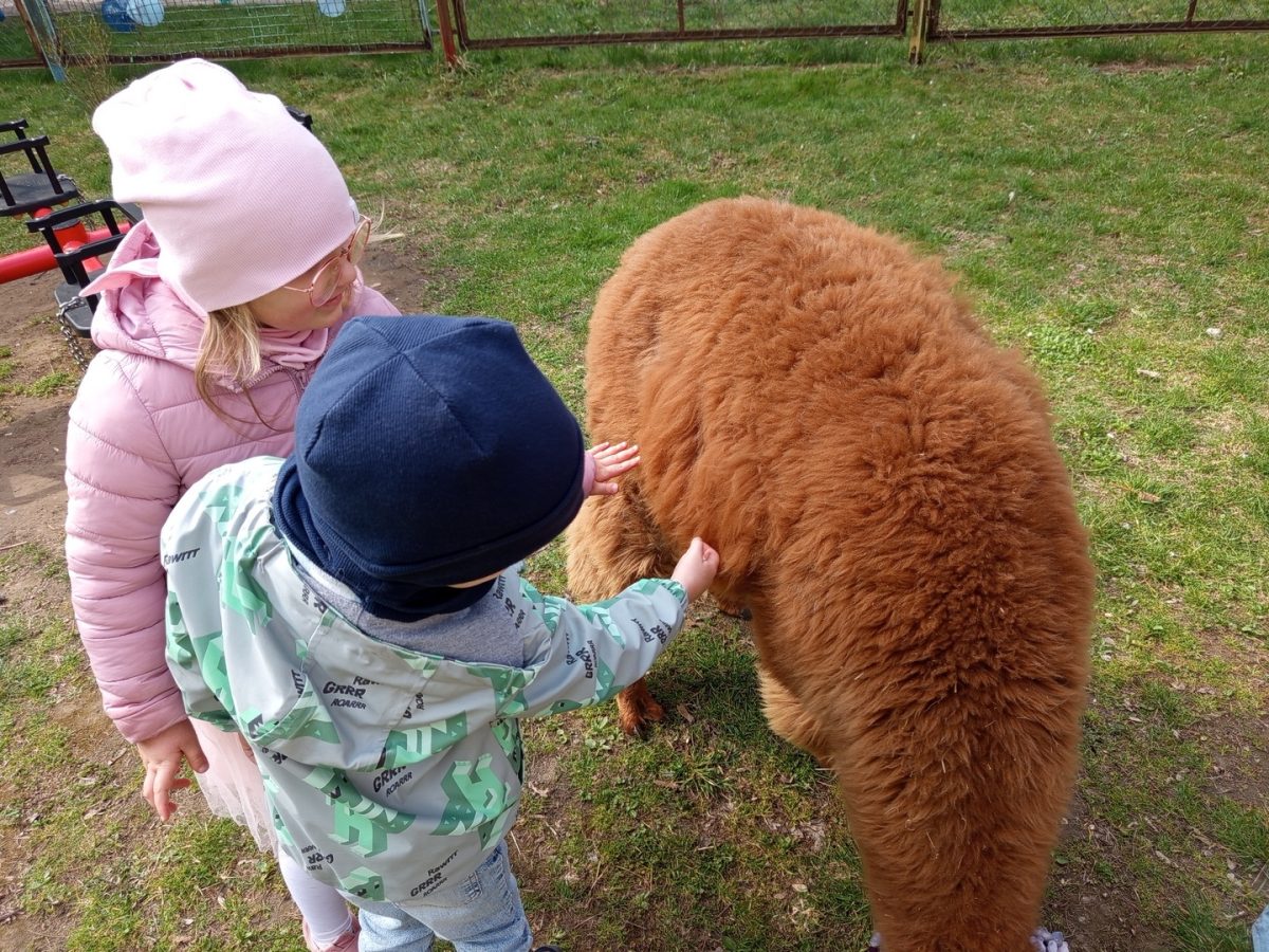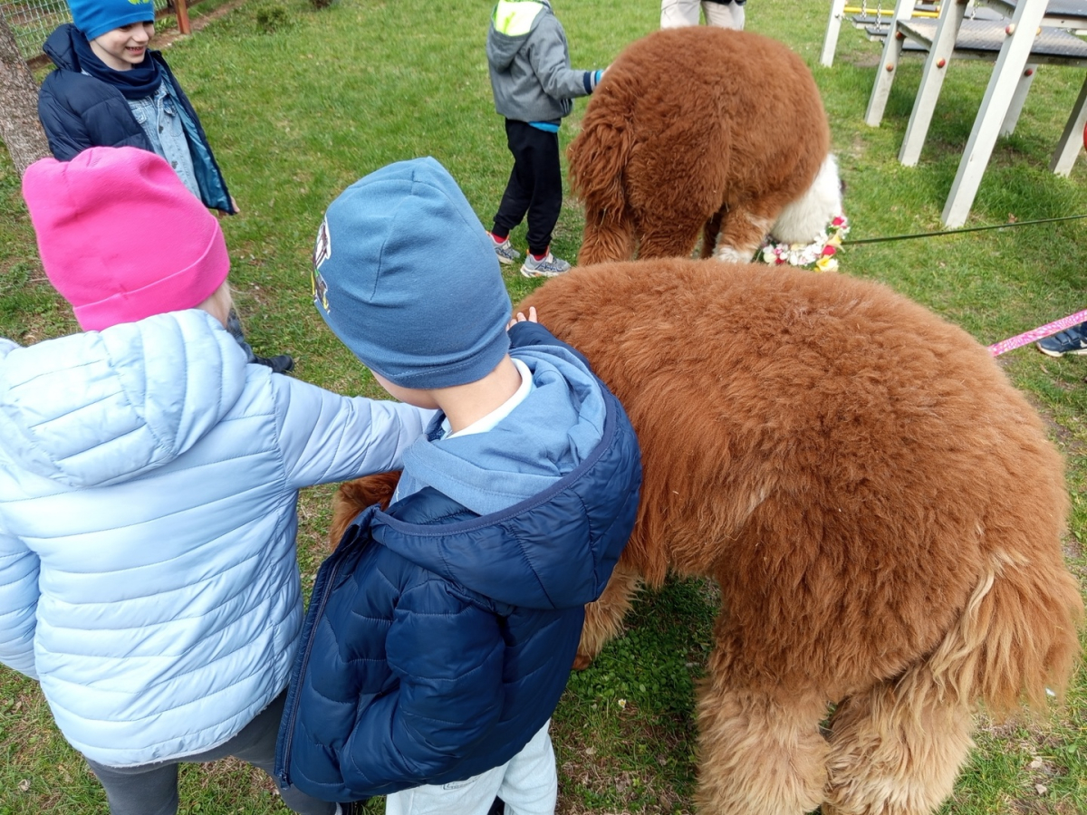 W tym tygodniu w ogrodzie przedszkolnym odbyły się zajęcia edukacyjne z alpakami. Alpaki, to zwierzęta o bardzo łagodnym usposobieniu. Są płochliwe i delikatne, zupełnie pozbawione agresji. Szczególnie pozytywnie nastawione są do dzieci. Głaskanie i przytulanie alpak pomaga dzieciom rozluźnić się i otworzyć. Wszystkie przedszkolaki były zachwycone. Podczas zajęć z alpakoterapii dzieci z radością karmiły alpaki marchewkami, przytulały je a także pozowały do zdjęć.