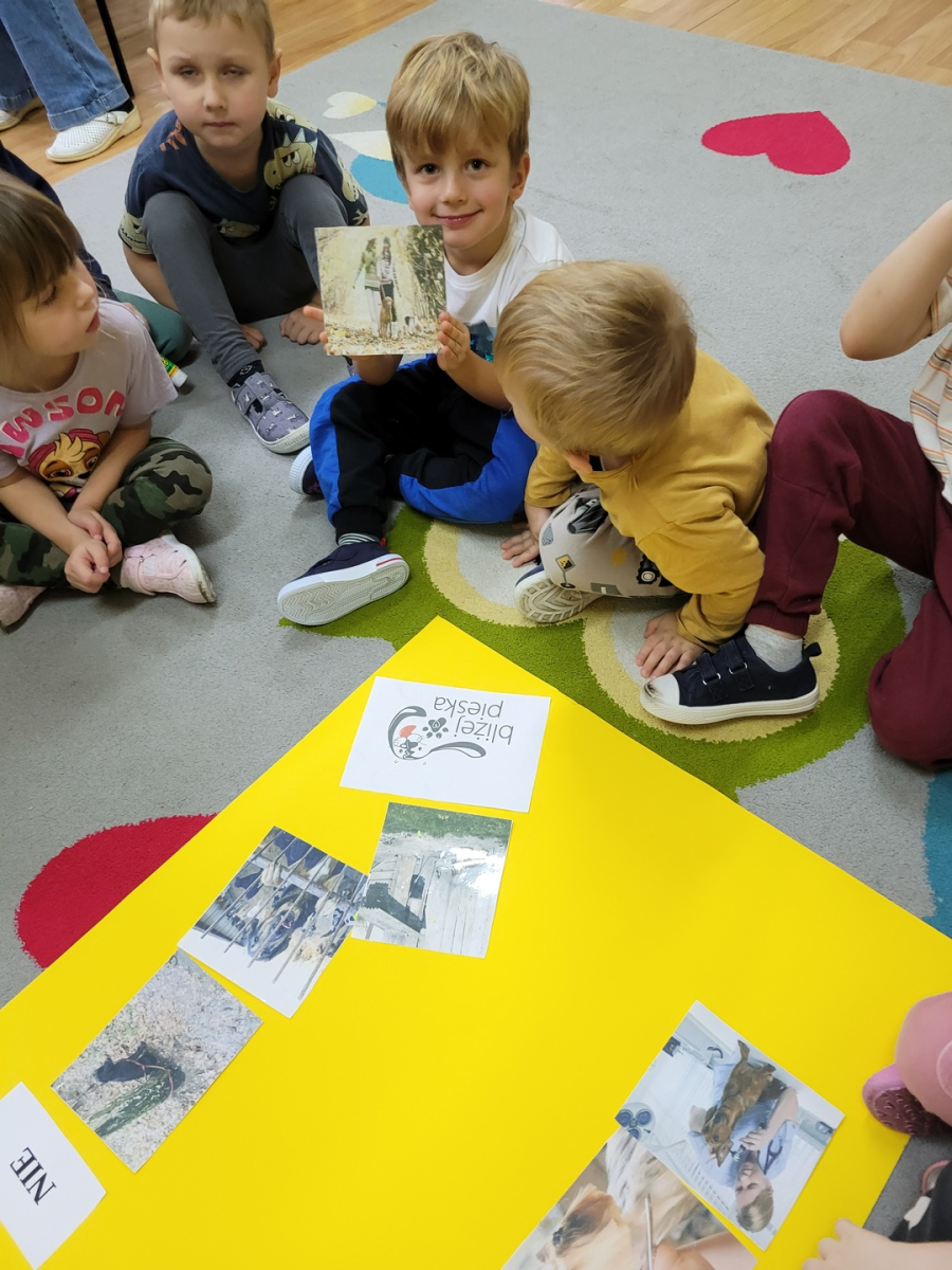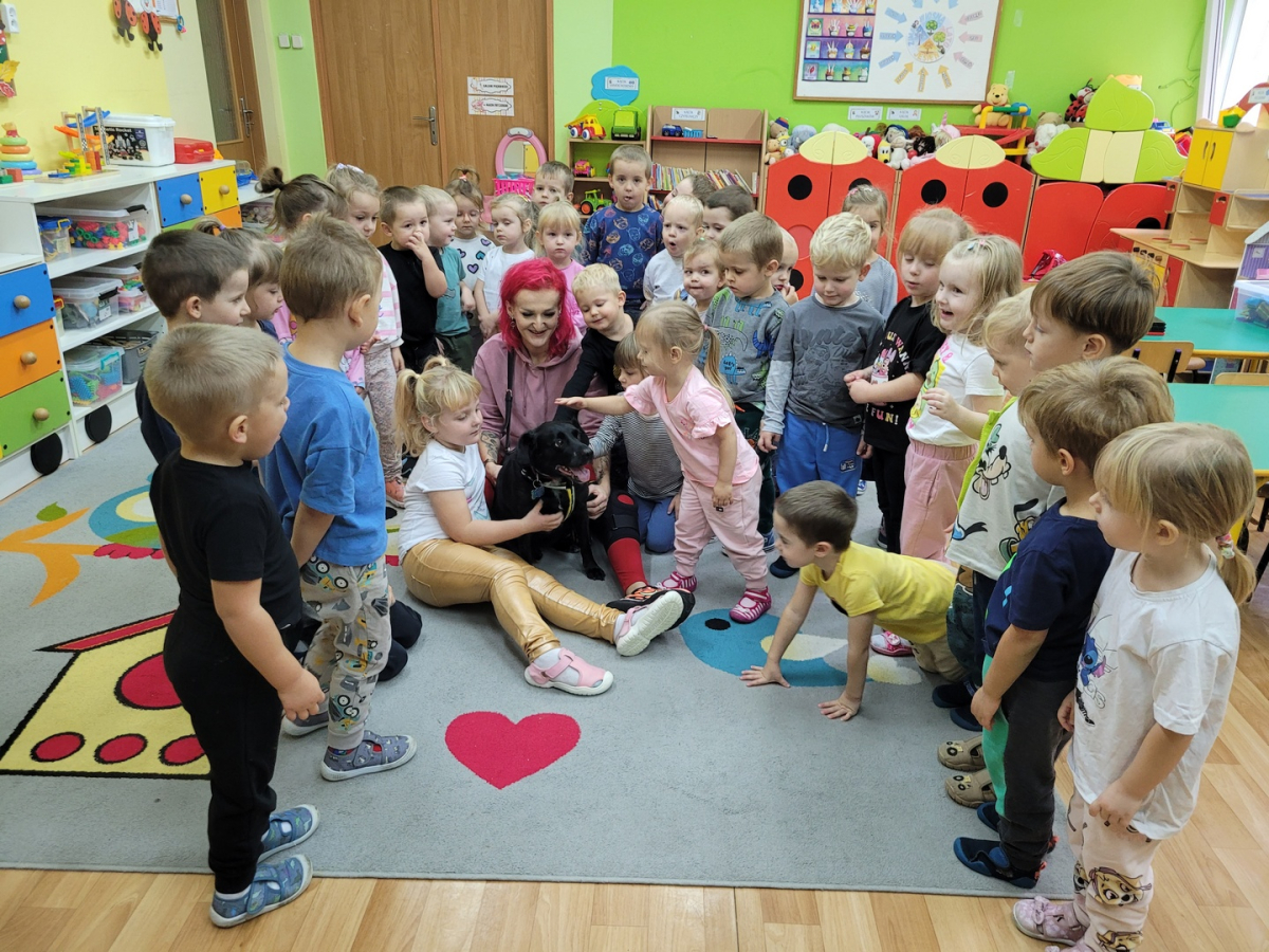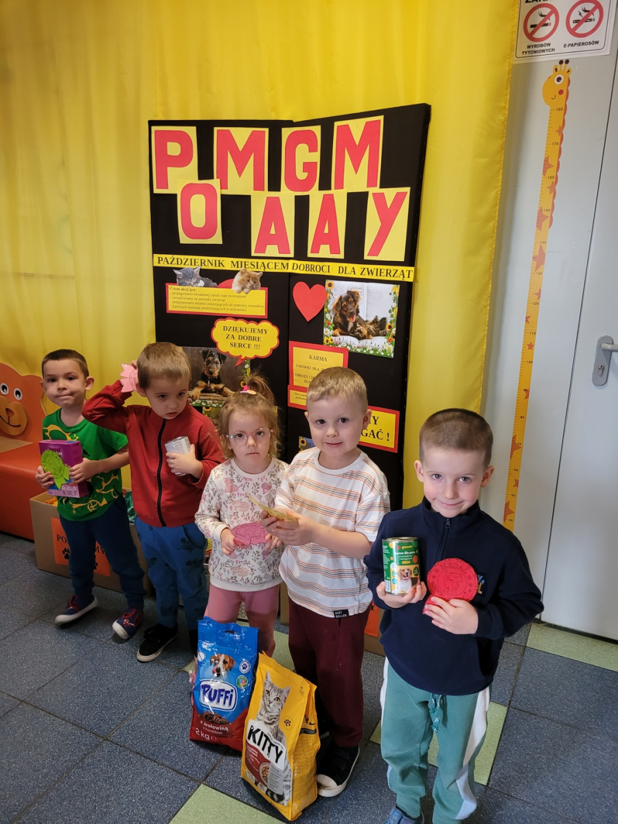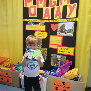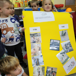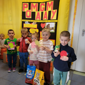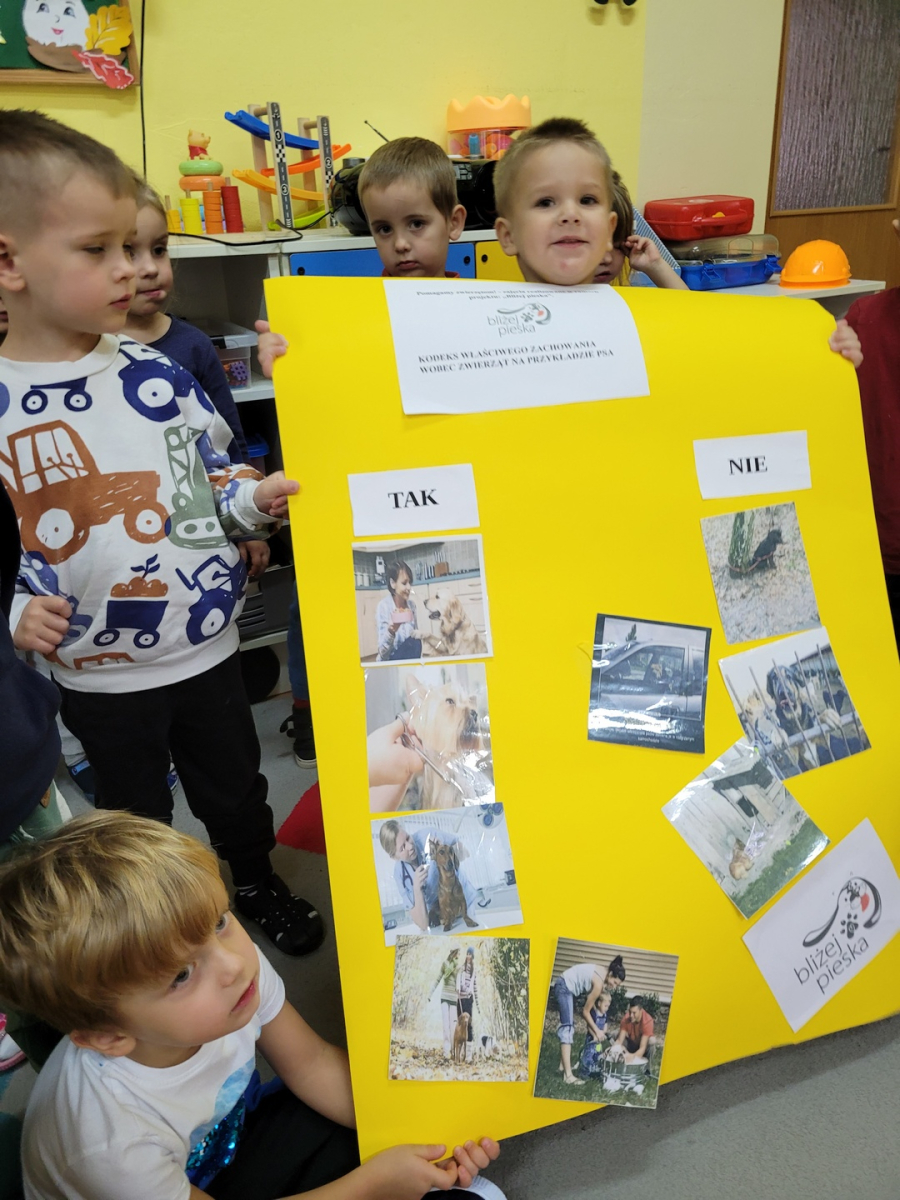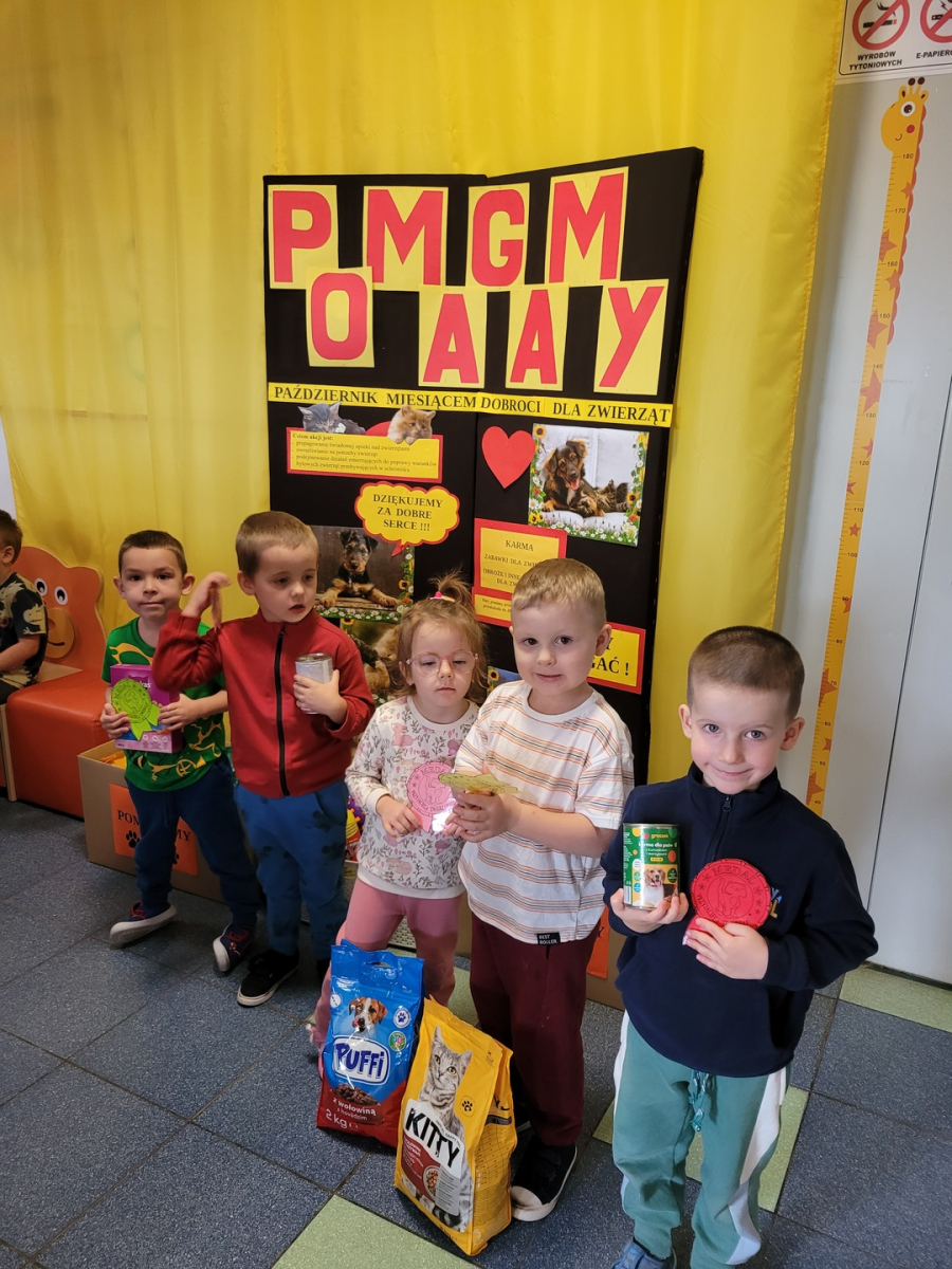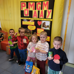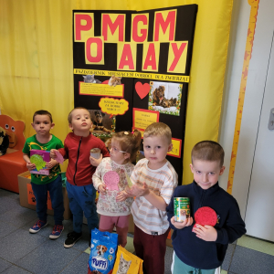 Nasze przedszkolaki po raz kolejny wzięły udział w projekcie „Bliżej pieska”, którego celem było uwrażliwienie przedszkolaków na potrzeby zwierząt. Dzieci uczyły się, jak opiekować się zwierzętami, poznały różne rasy psów, prawa zwierząt oraz zasady bezpiecznego zachowania wobec nich. Wspólnie stworzyły „Kodeks przyjaciela zwierząt”, wykonały piękne prace plastyczne, przeglądały albumy pełne zdjęć naszych czworonożnych przyjaciół. Aktywnie włączyliśmy się w zbiórkę karmy dla zwierząt w schronisku. Dzieci wraz z rodzicami wzięły udział w konkursie plastycznym ,,Psiaki, kociaki i inne zwierzaki”. Miały możliwość udziału w dogoterapii oraz spotkaniu z psem Kai o imieniu ,,Niunio” oraz kotem podopiecznym ze Stowarzyszenia Milejów Dla Zwierząt.