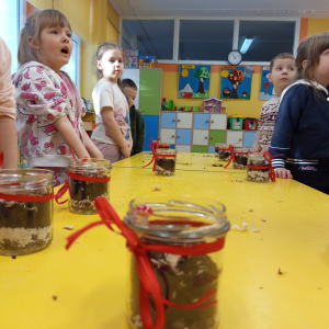 We wtorek 20 stycznia odbyły się warsztaty pt. "Las w słoiku". To kreatywne zajęcia, podczas których dzieci tworzyły własny, miniaturowy ekosystem w szklanym pojemniki. Misie rozwijały swoje zdolności manualne, zgłębiały zasady funkcjonowania roślin w przyrodzie. To był twórczy dzień.