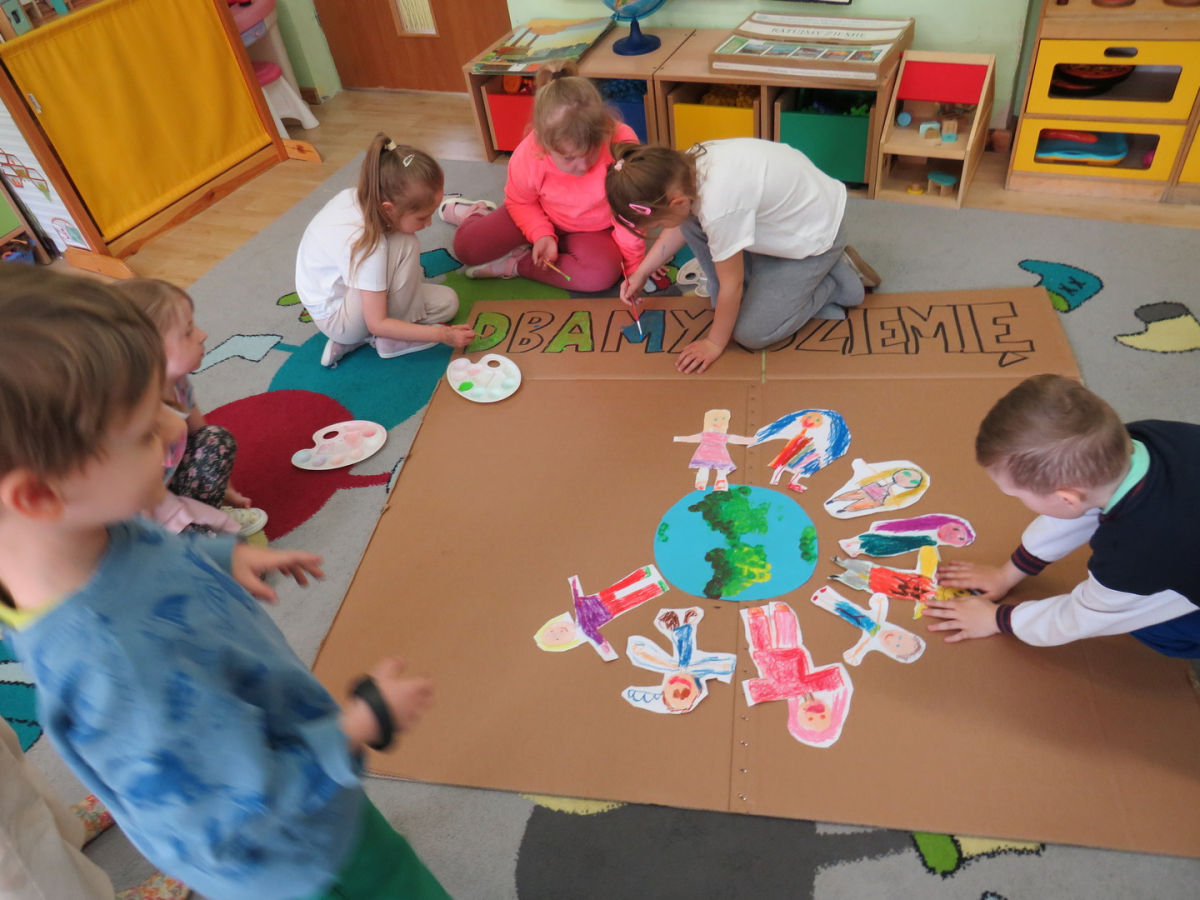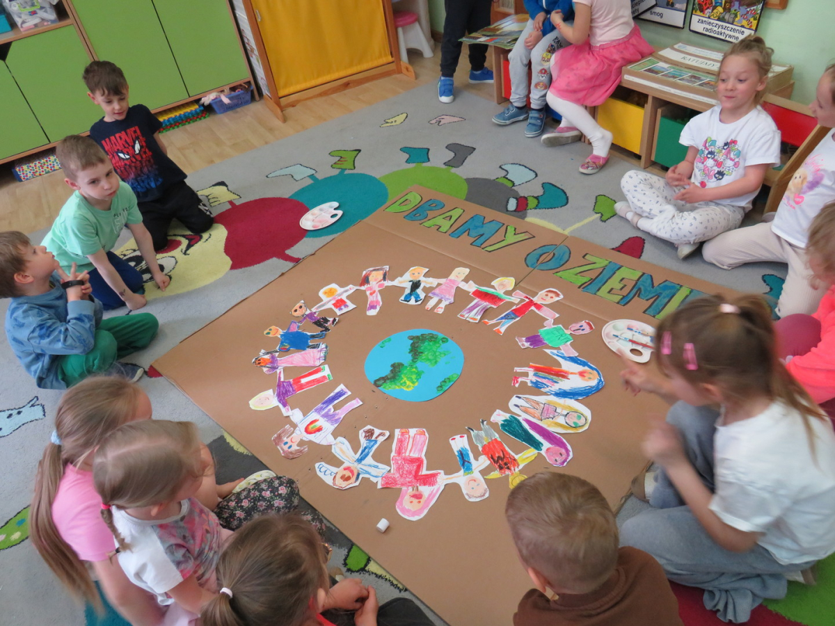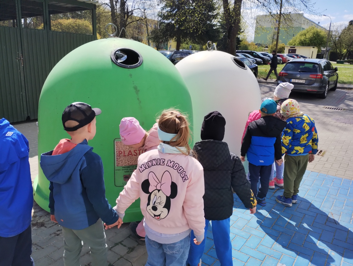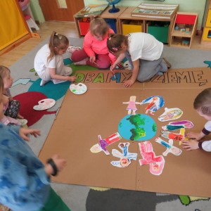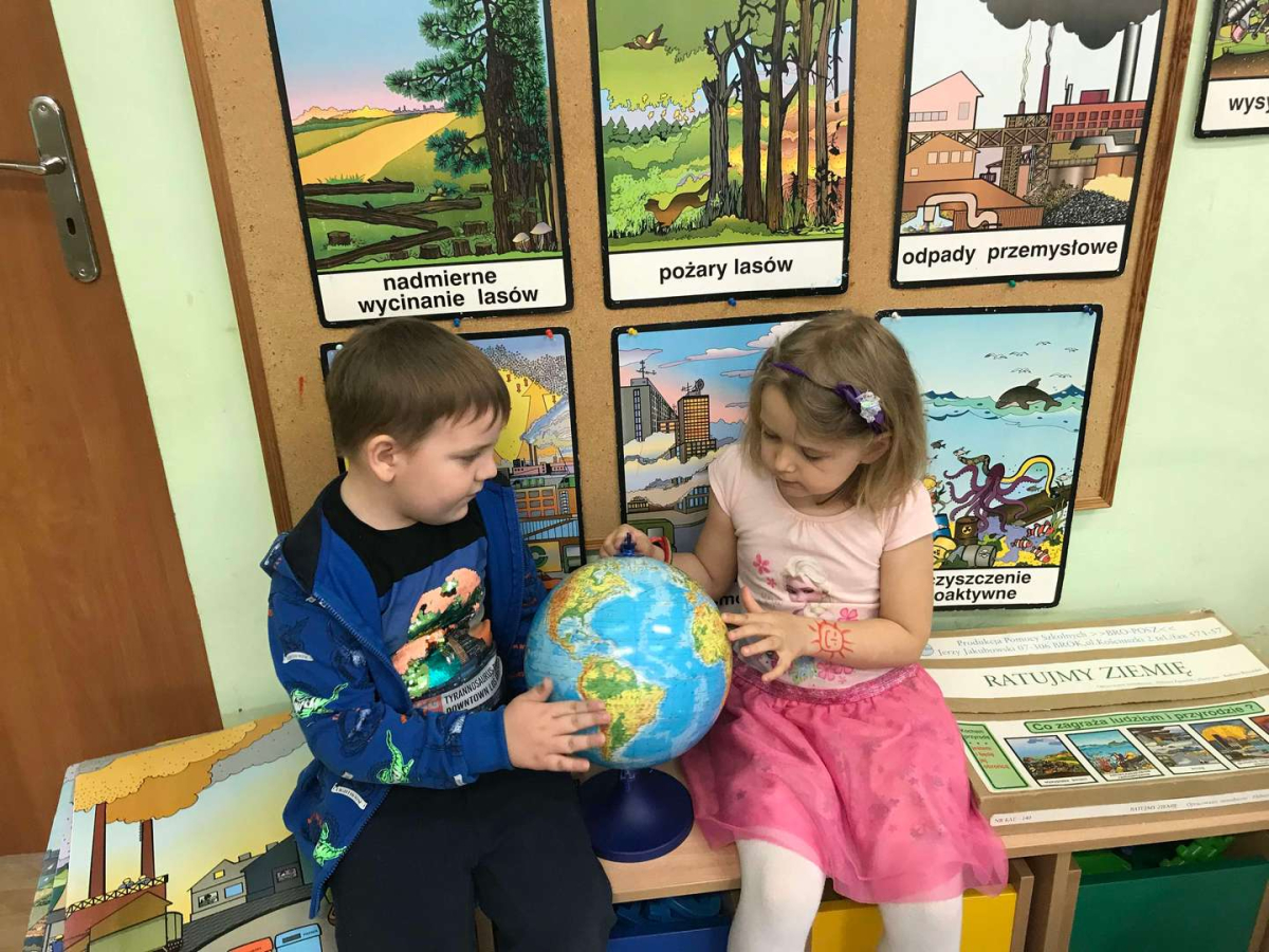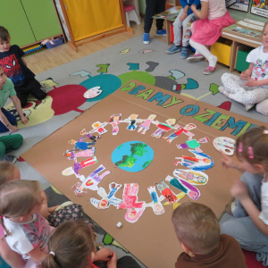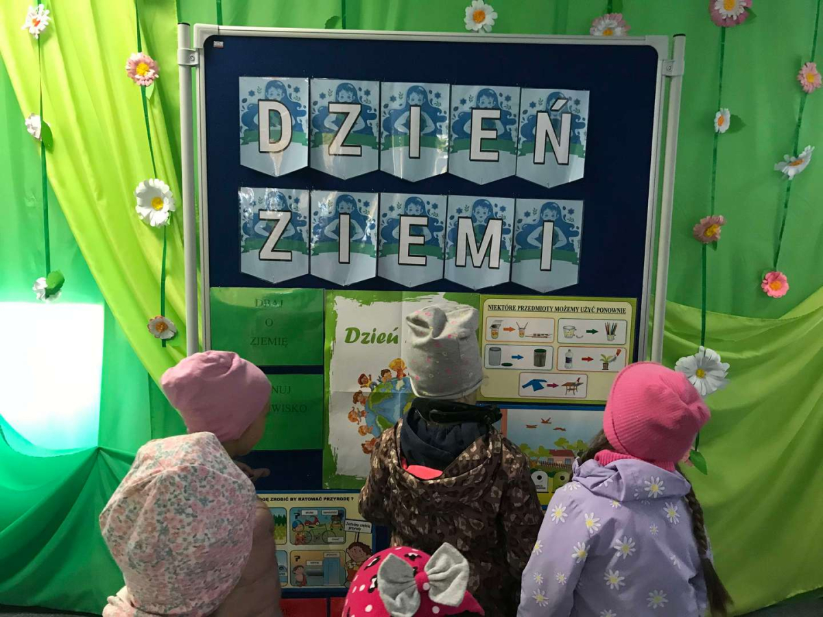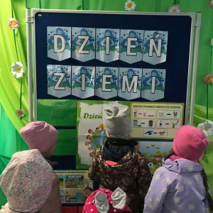 Pięciolatki bardzo dużo wiedzą o ekologii. Podczas obchodów Dnia Ziemi na zajęciach utrwalały wiadomości na temat ochrony naszej planety, wykonywały wspólnie plakat dotyczący tej tematyki oraz uczyły się piosenki o ochronie środowiska. Podczas spaceru szukały miejsc segregacji odpadów i podziwiały piękno wiosennej przyrody.