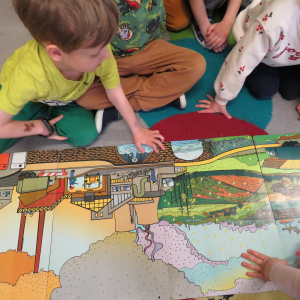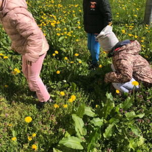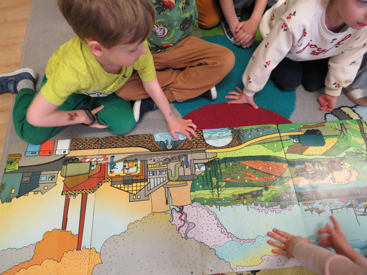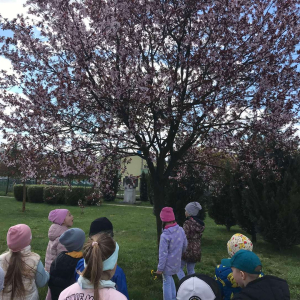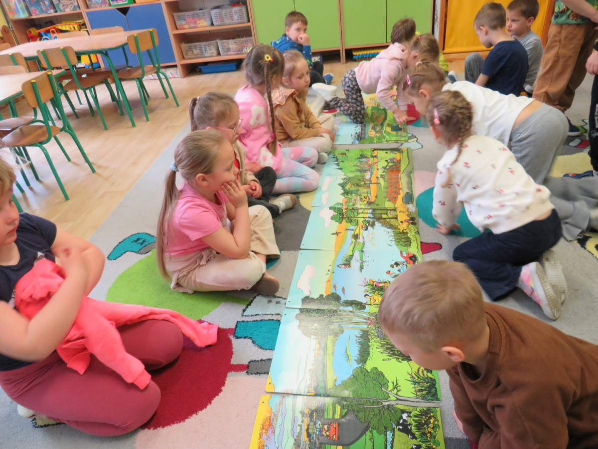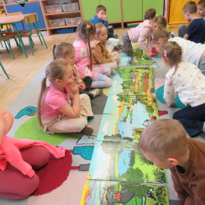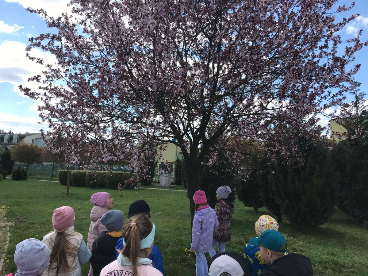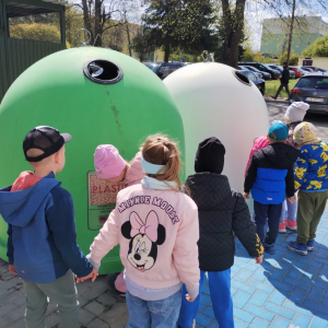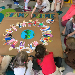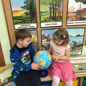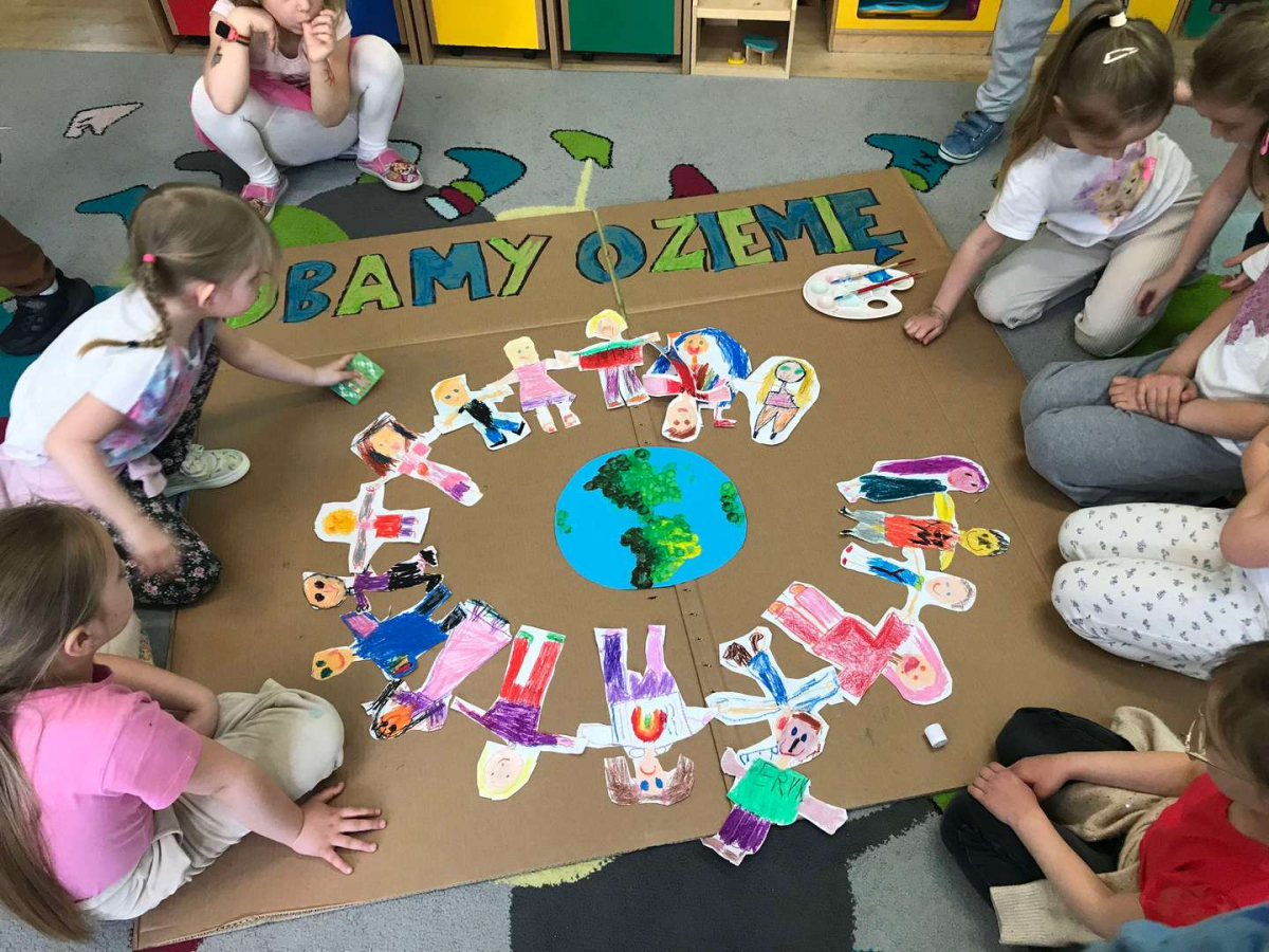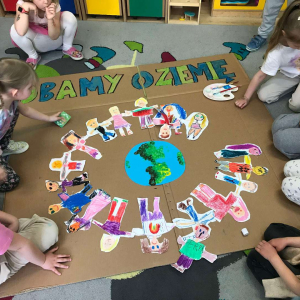 Pięciolatki bardzo dużo wiedzą o ekologii. Podczas obchodów Dnia Ziemi na zajęciach utrwalały wiadomości na temat ochrony naszej planety, wykonywały wspólnie plakat dotyczący tej tematyki oraz uczyły się piosenki o ochronie środowiska. Podczas spaceru szukały miejsc segregacji odpadów i podziwiały piękno wiosennej przyrody.