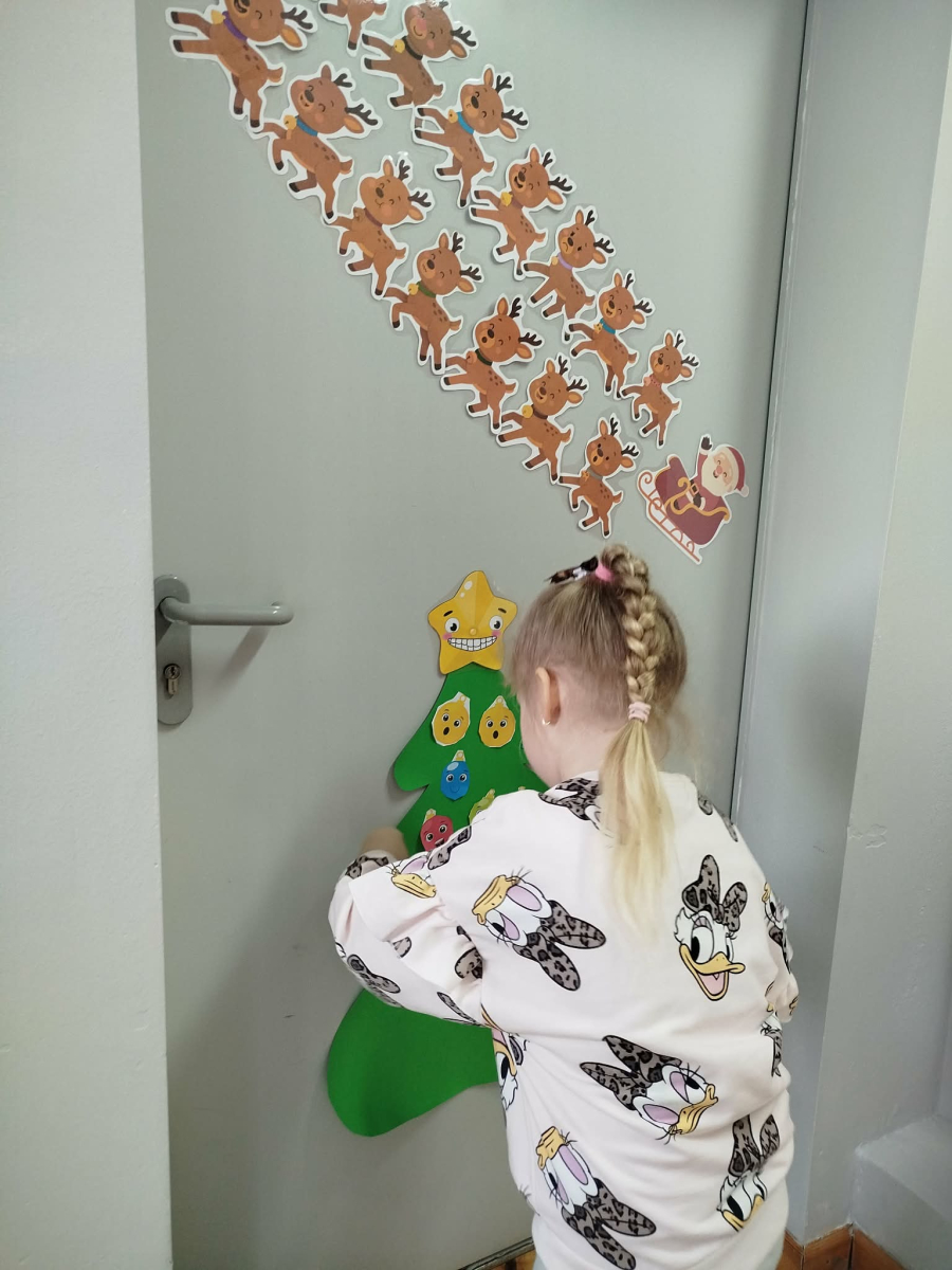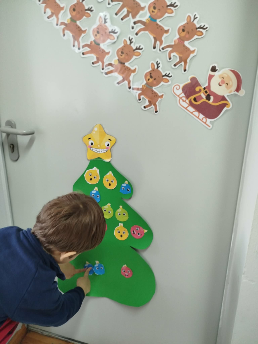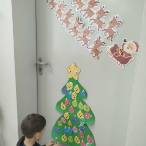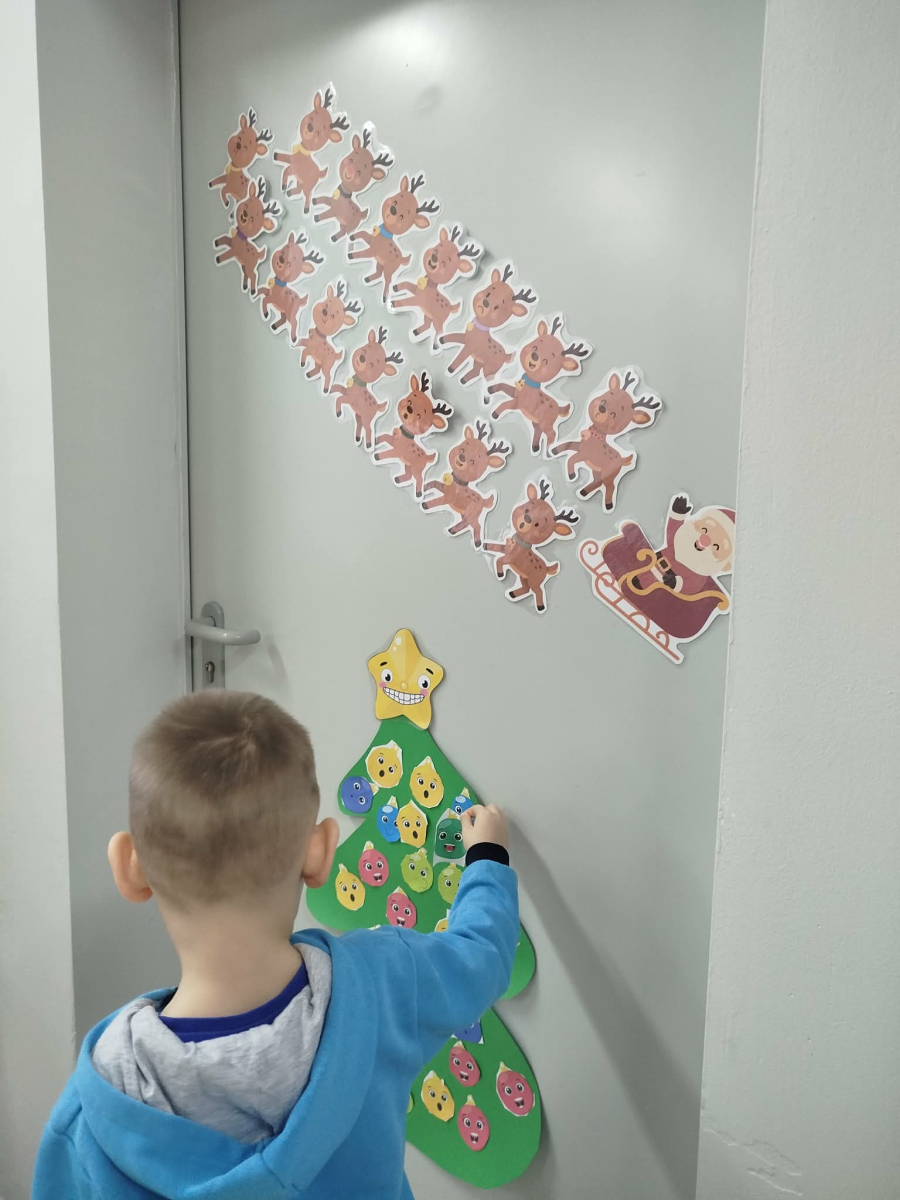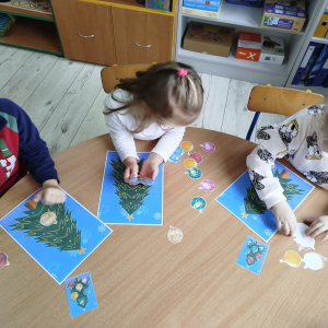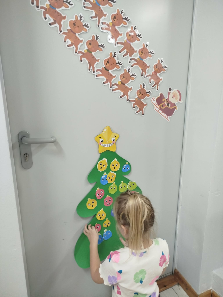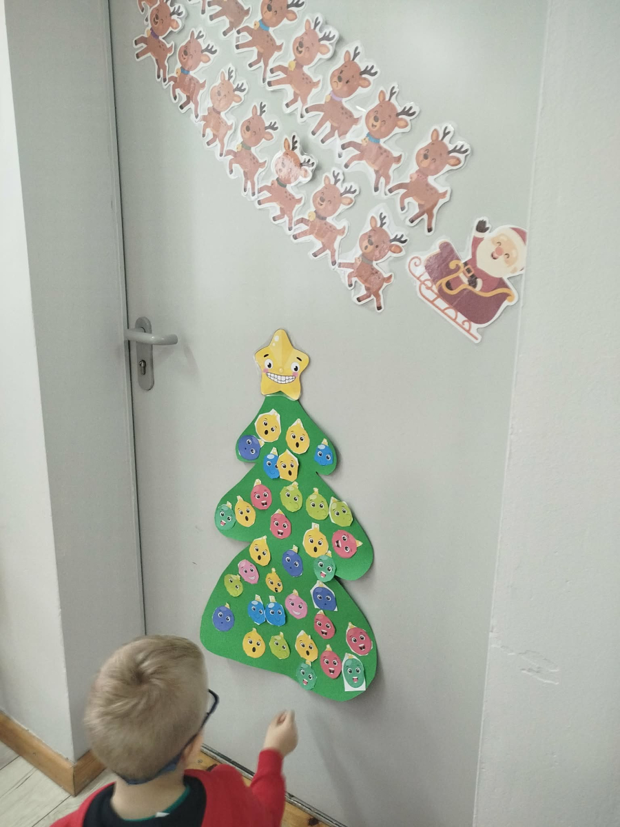 W ostatnich dniach, przed Świętami Bożego Narodzenia, podczas zajęć logopedycznych przedszkolaki dekorowały salę logopedyczną. Dzieci usprawniały narządy artykulacyjne z obrazkami przedstawiającymi bombki choinkowe. Ćwiczyły percepcję wzrokową, nazwy kolorów i spostrzegawczość. Usprawniały motorykę małą – wycinając bombki z papieru kolorowego. Na zakończenie odbyła się zabawa – malowanie palcami napisu „WESOŁYCH ŚWIĄT”.