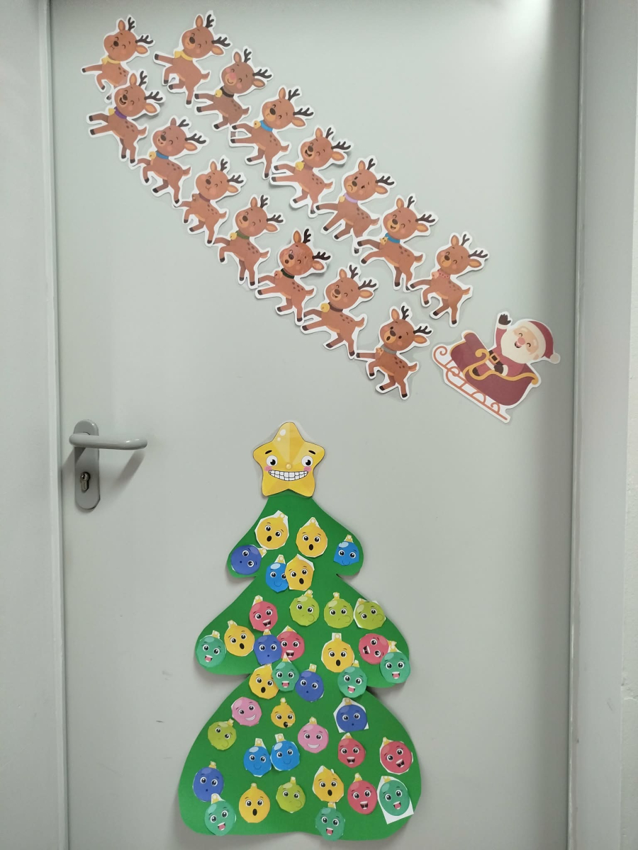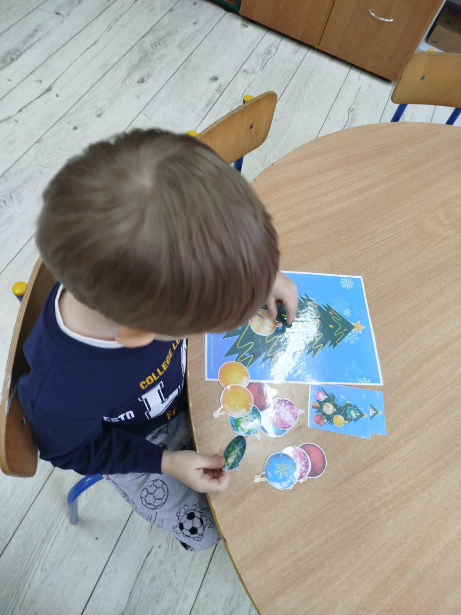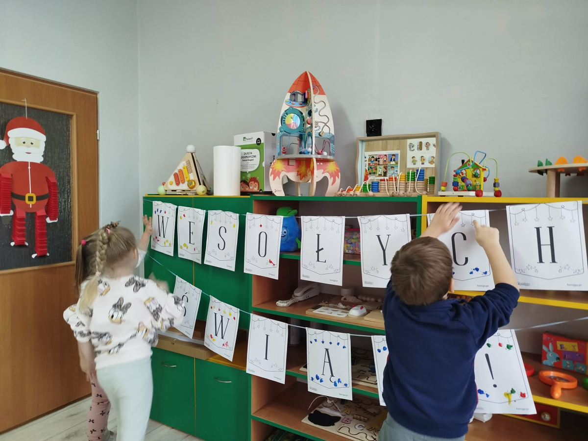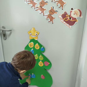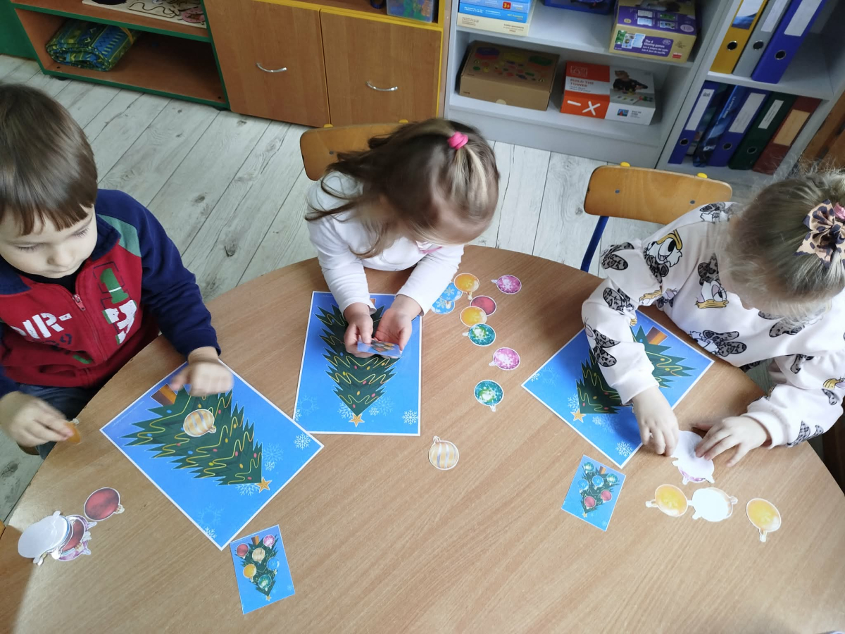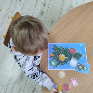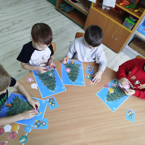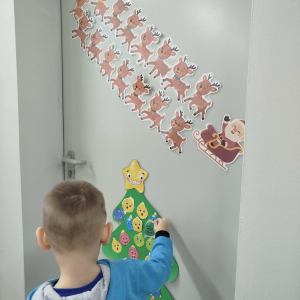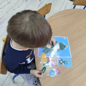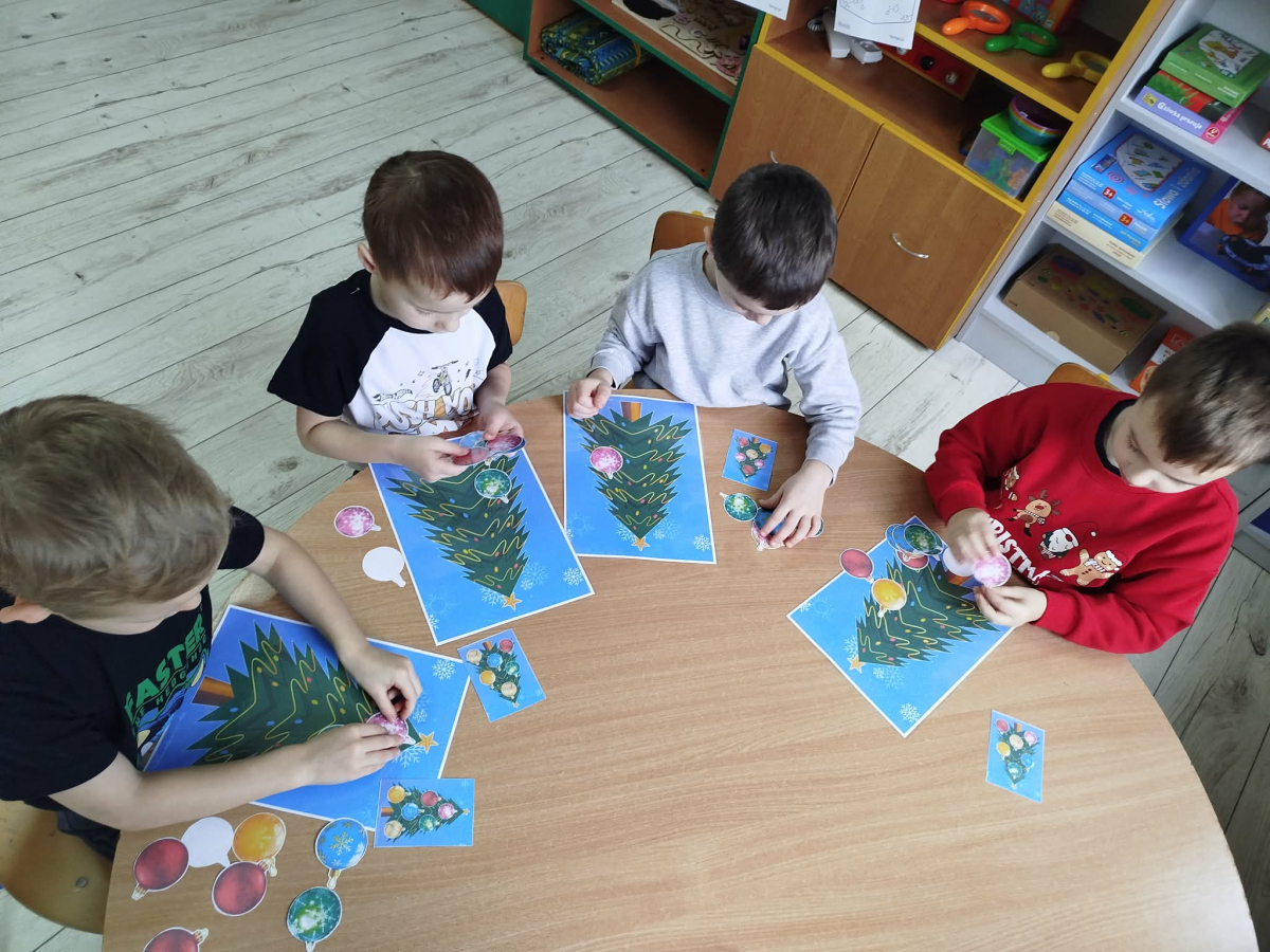 W ostatnich dniach, przed Świętami Bożego Narodzenia, podczas zajęć logopedycznych przedszkolaki dekorowały salę logopedyczną. Dzieci usprawniały narządy artykulacyjne z obrazkami przedstawiającymi bombki choinkowe. Ćwiczyły percepcję wzrokową, nazwy kolorów i spostrzegawczość. Usprawniały motorykę małą – wycinając bombki z papieru kolorowego. Na zakończenie odbyła się zabawa – malowanie palcami napisu „WESOŁYCH ŚWIĄT”.